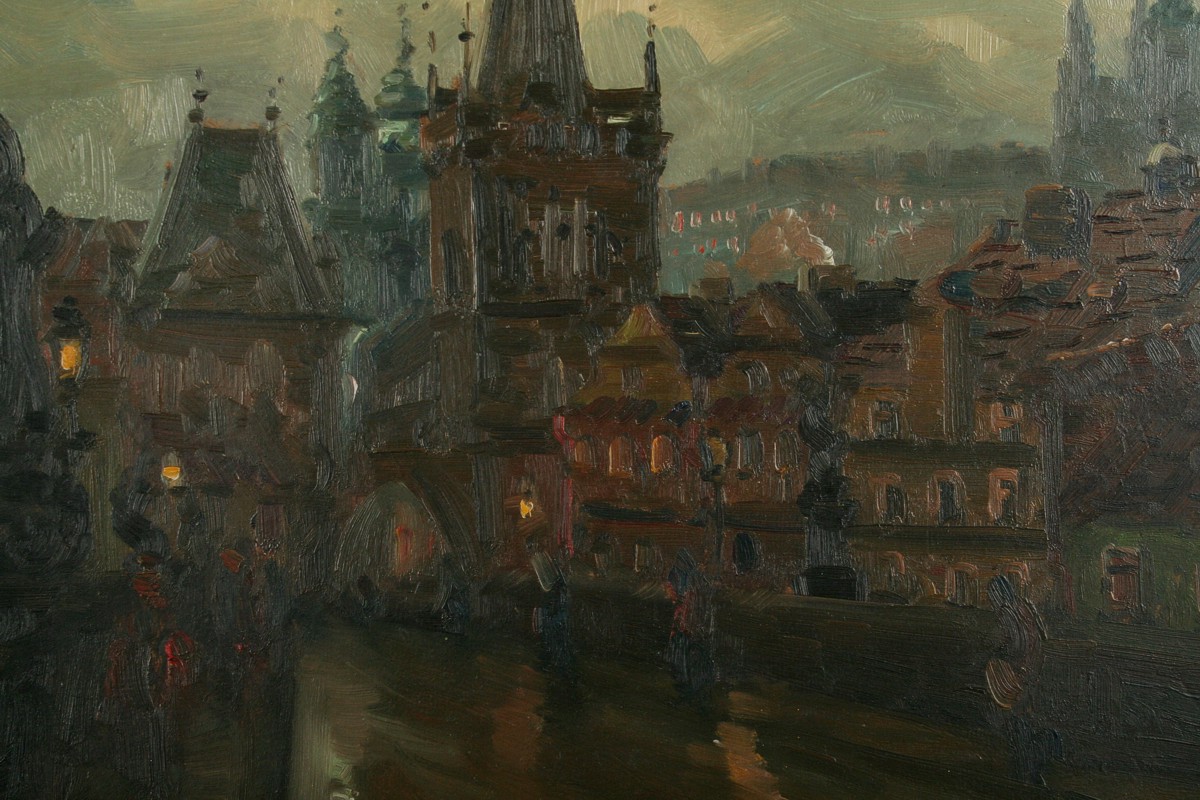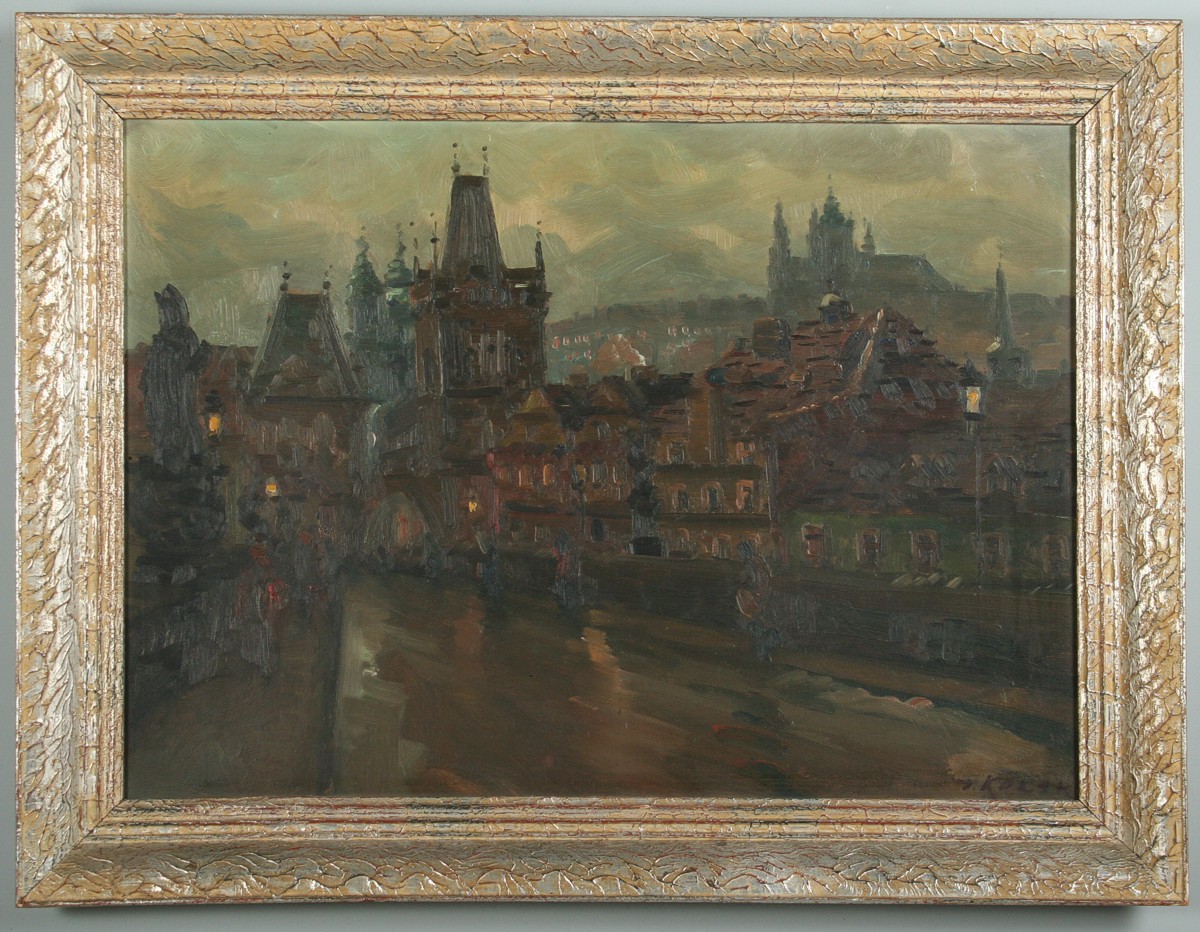 obraz Prahy z Karlova mostu ve večerní náladě při pouličním osvětlení, olej na lepence 48 x 68 cm s rámem 62 x 82 cm, autor Václav Kozák, podepsáno vpravo dole V. Kozák, rámováno v původním rámu
