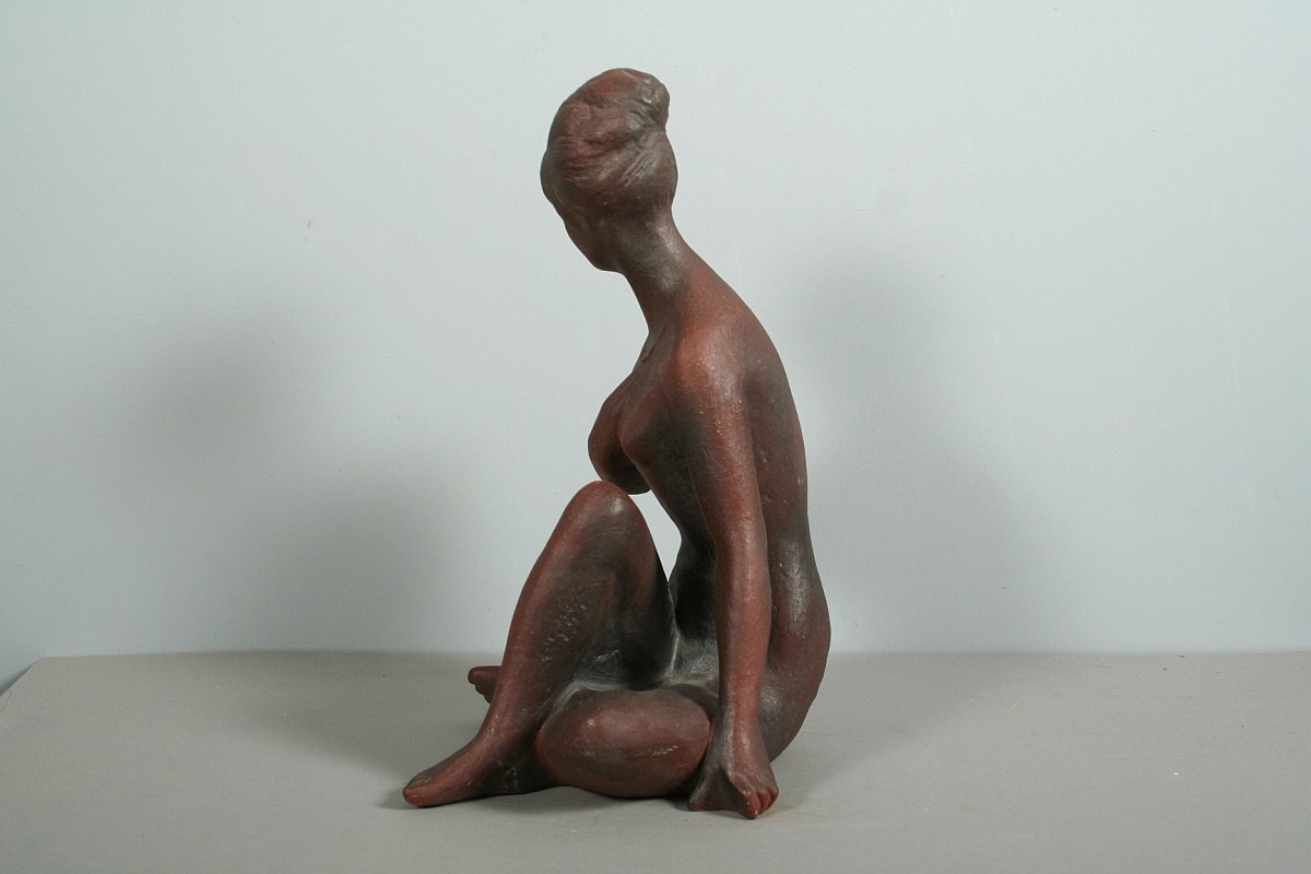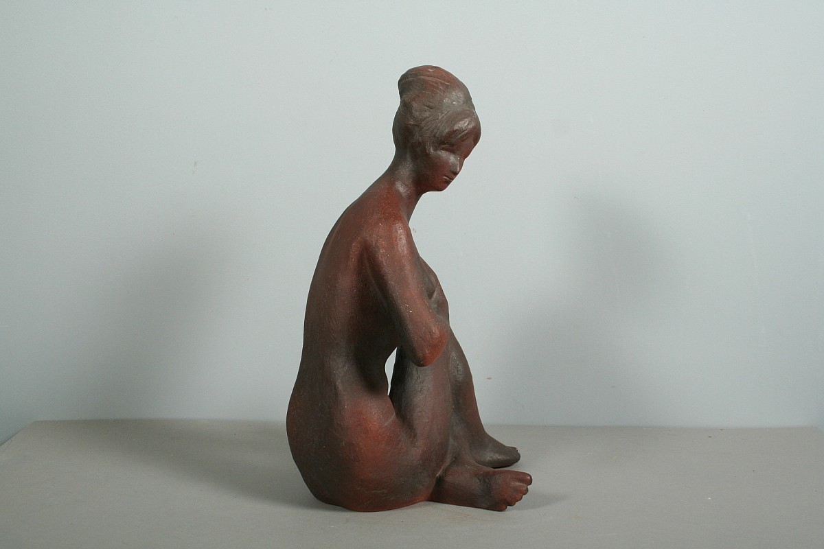 socha sedícího dívčího aktu s náhrdelníkem, pálená terakota, 50. léta, autor Bohumil Kokrda, 35 cm
