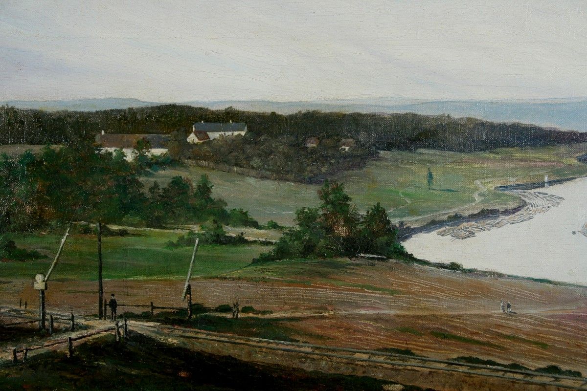 obraz široké krajiny s železničním přejezdem, závorami, architektůrou i figurální stafáží, olej na plátně napnutém na dřevěném rámu 25 x 43 cm s rámem 36 x 54 cm, neznámý autor z přelomu 19. a 20. století, rámováno v původním rámu