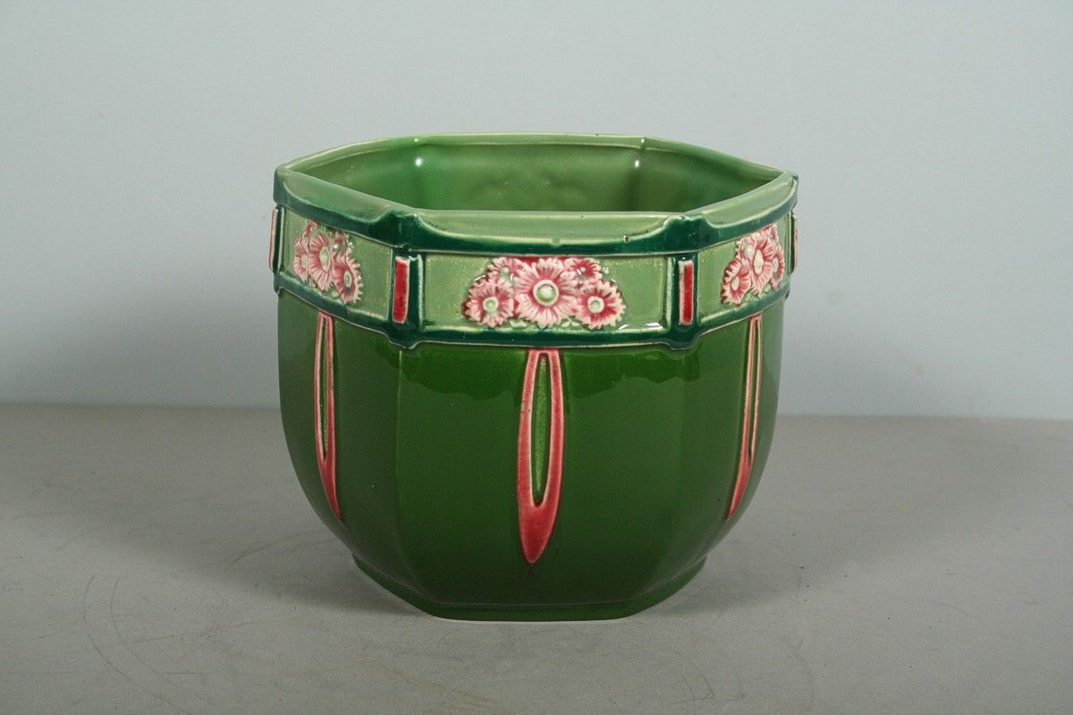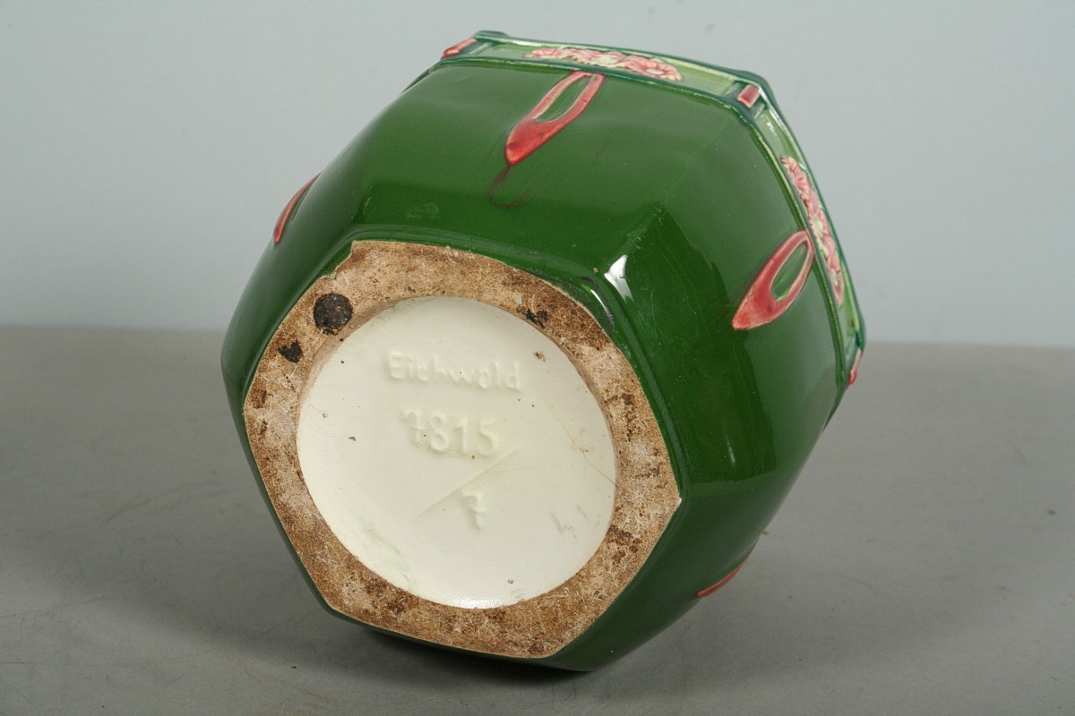 secesní keramický květináč šestiúhlého tvaru na stranách s barevným dekorem květin a cecesních ornamentů, na dně značený Eichwald, x cm