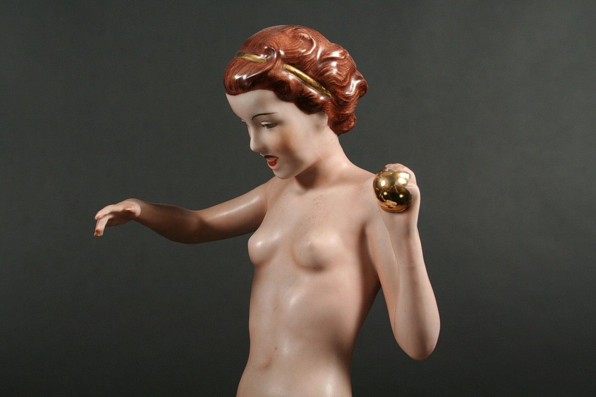 sousoší, dívčí akt s chrtem, porcelán bílý malovaný tělovou barvou a zlacením, na podstavě částečně vidět tlačený podpis Strobach–König, značeno tlačenými čísly a tištěnou značkou Royal DUX Duchcov, 35,5 x 27 cm