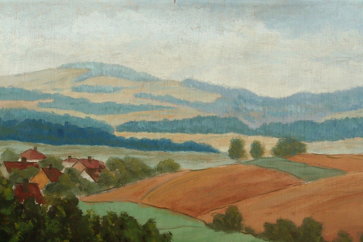 oboustraný obraz krajiny s vesnicí a na zadní straně běžící voják s puškou, olej na desce z překližky, 62 x 84 cm s rámem 80 x 102 cm, autor Jan Bohumil Pospíšil, podepsáno vlevo dole Pospíšil a J.B. Pospíšil, rámováno v původním rámu