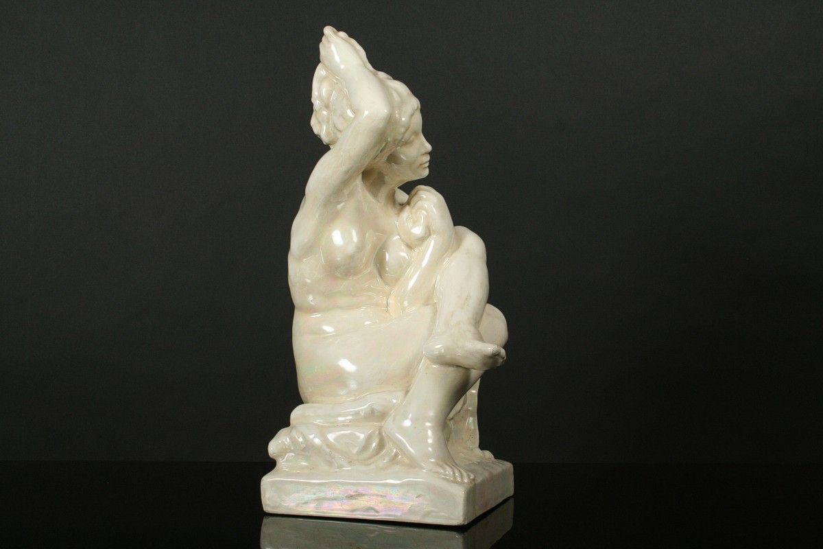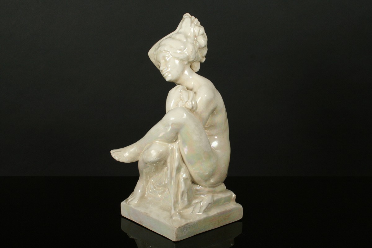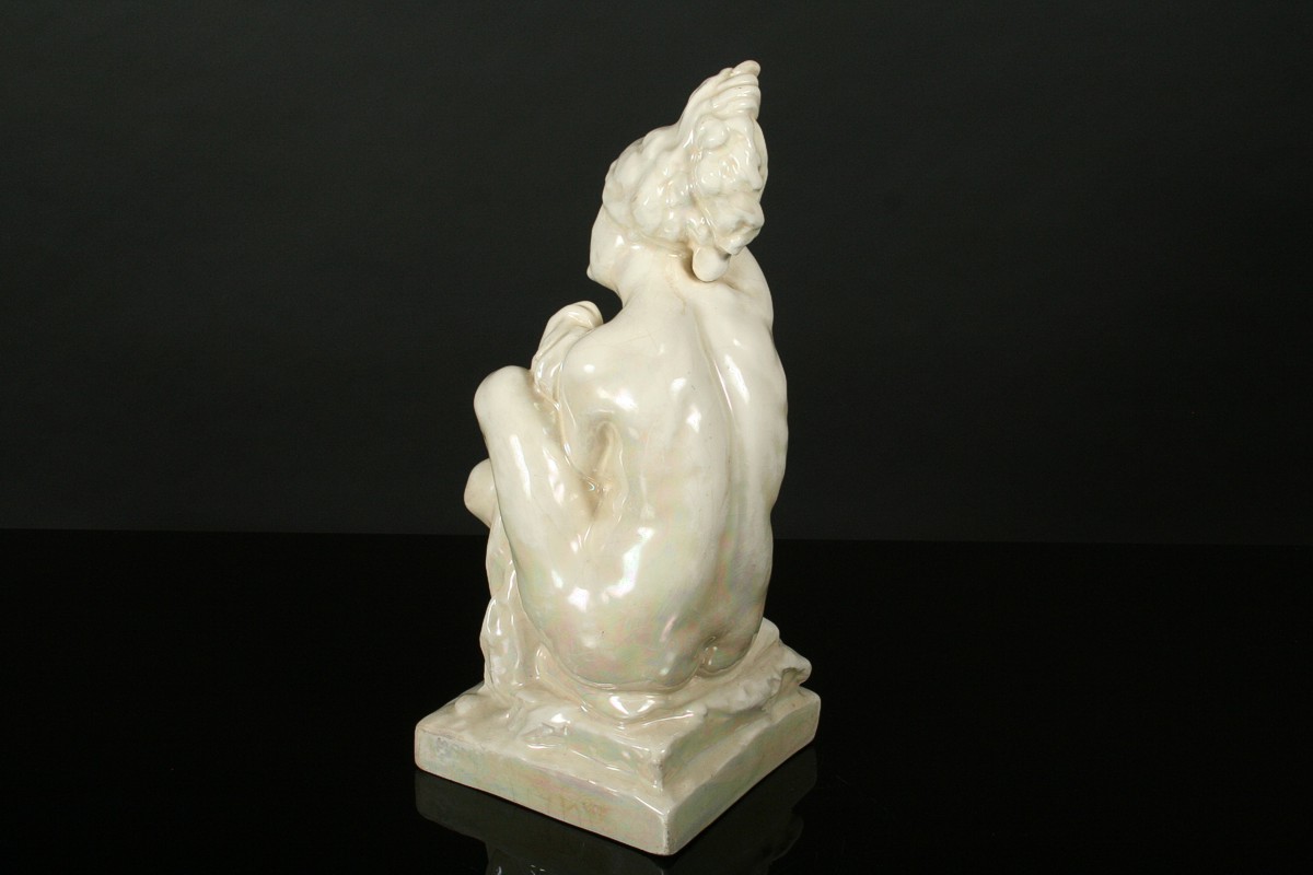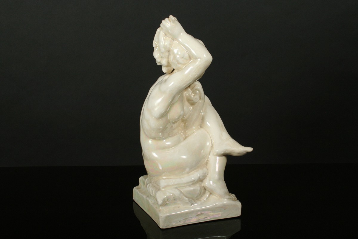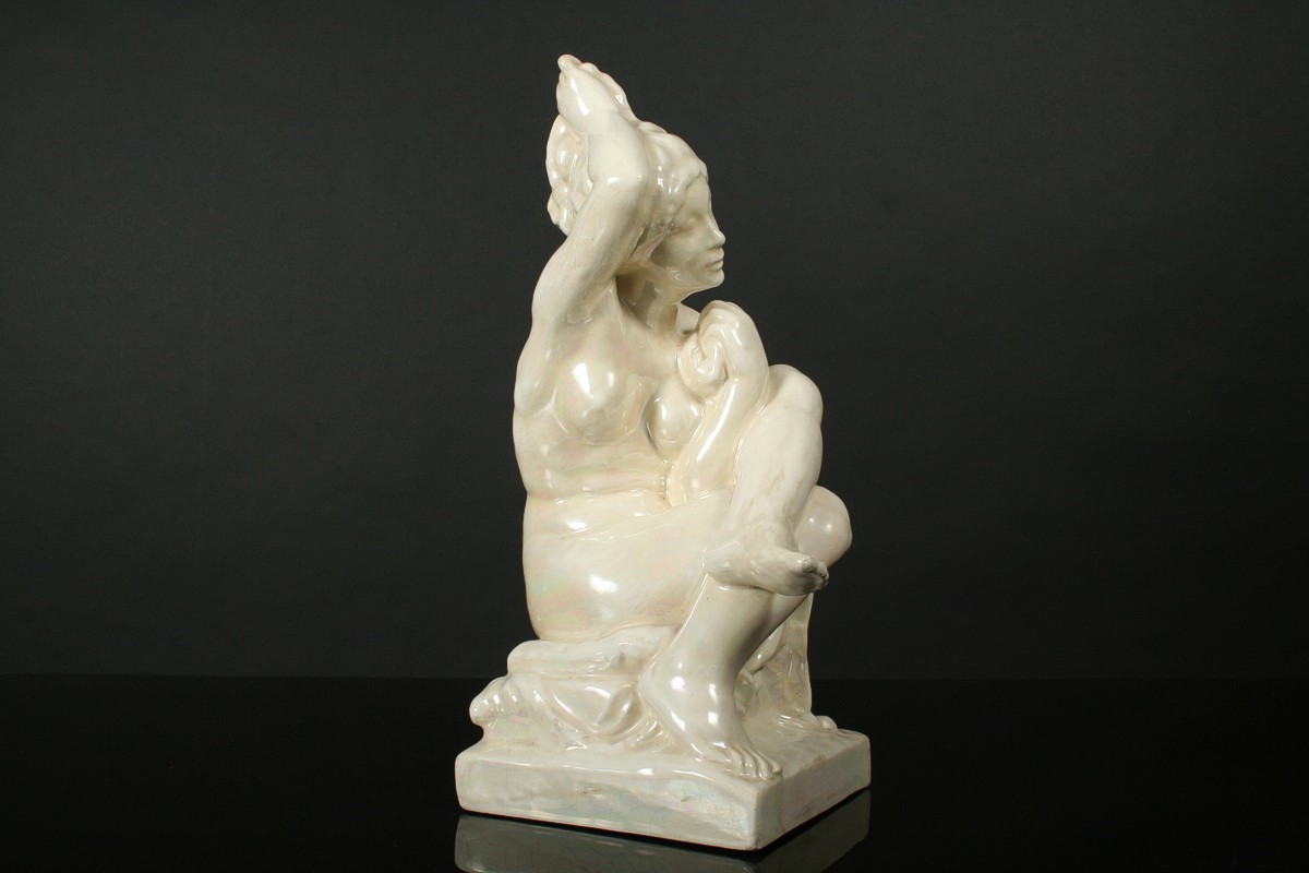 socha dívčího aktu při ranní toaletě nazvaná "Ráno", glazovaná keramika, autor Jan Štursa kolem roku 1910, neznačeno, drobné krakely v glazůře, 39,5 cm