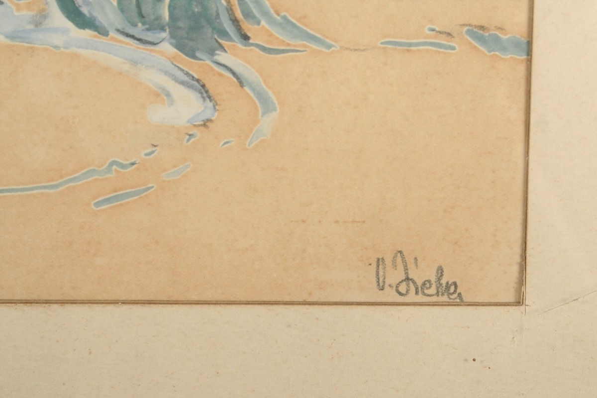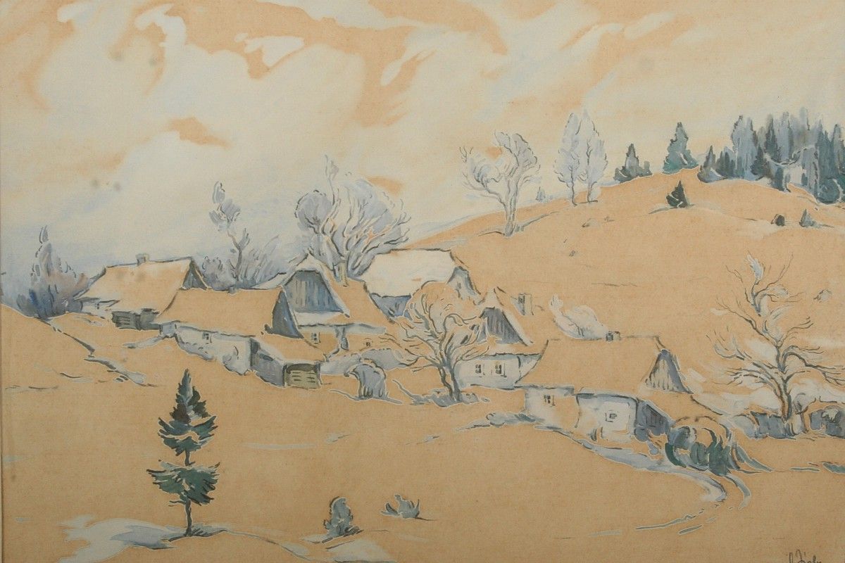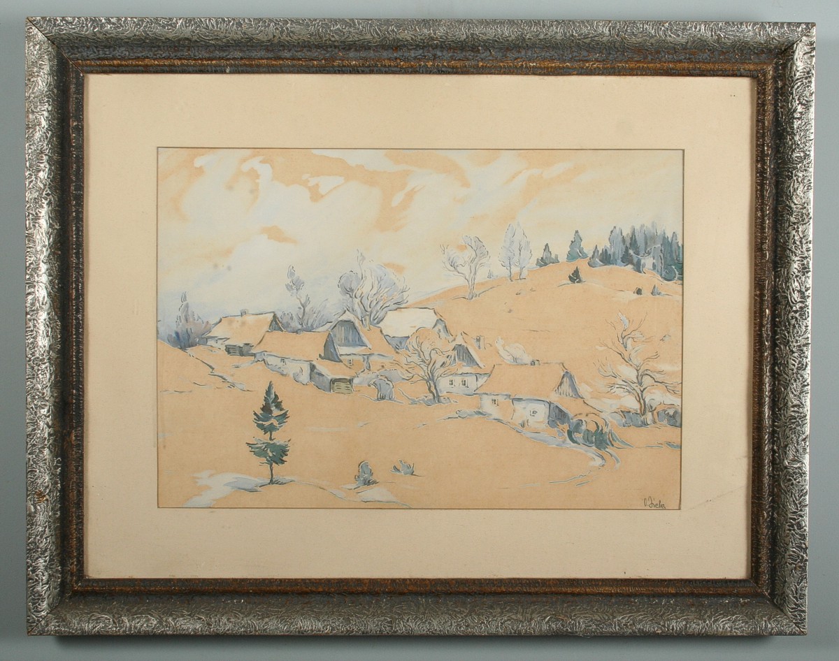 obraz zimní vesnice v horách akvarel na papíře, ve výřezu 33 x 47 cm, s rámem 55 x 70 cm, autor Václav Jícha, podepsáno vpravo dole V. Jícha, rámováno v původní paspartě a rámu pod sklem