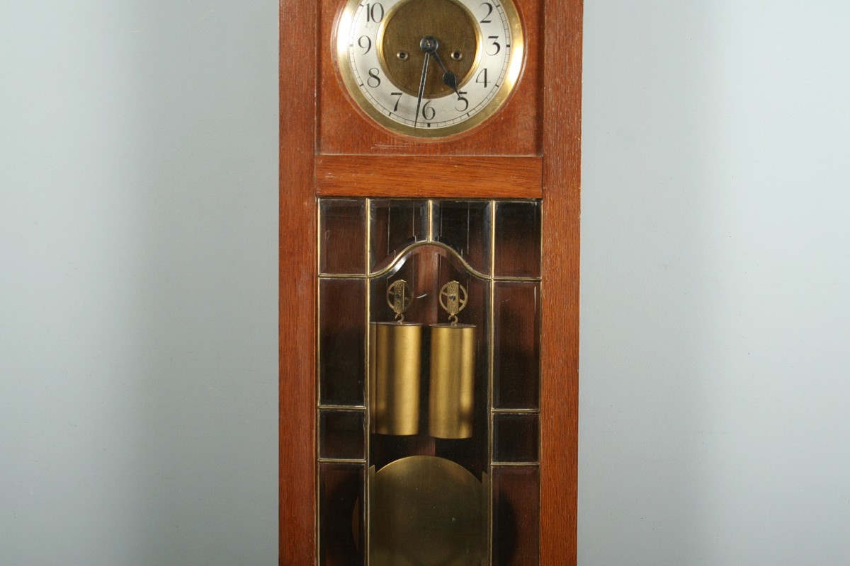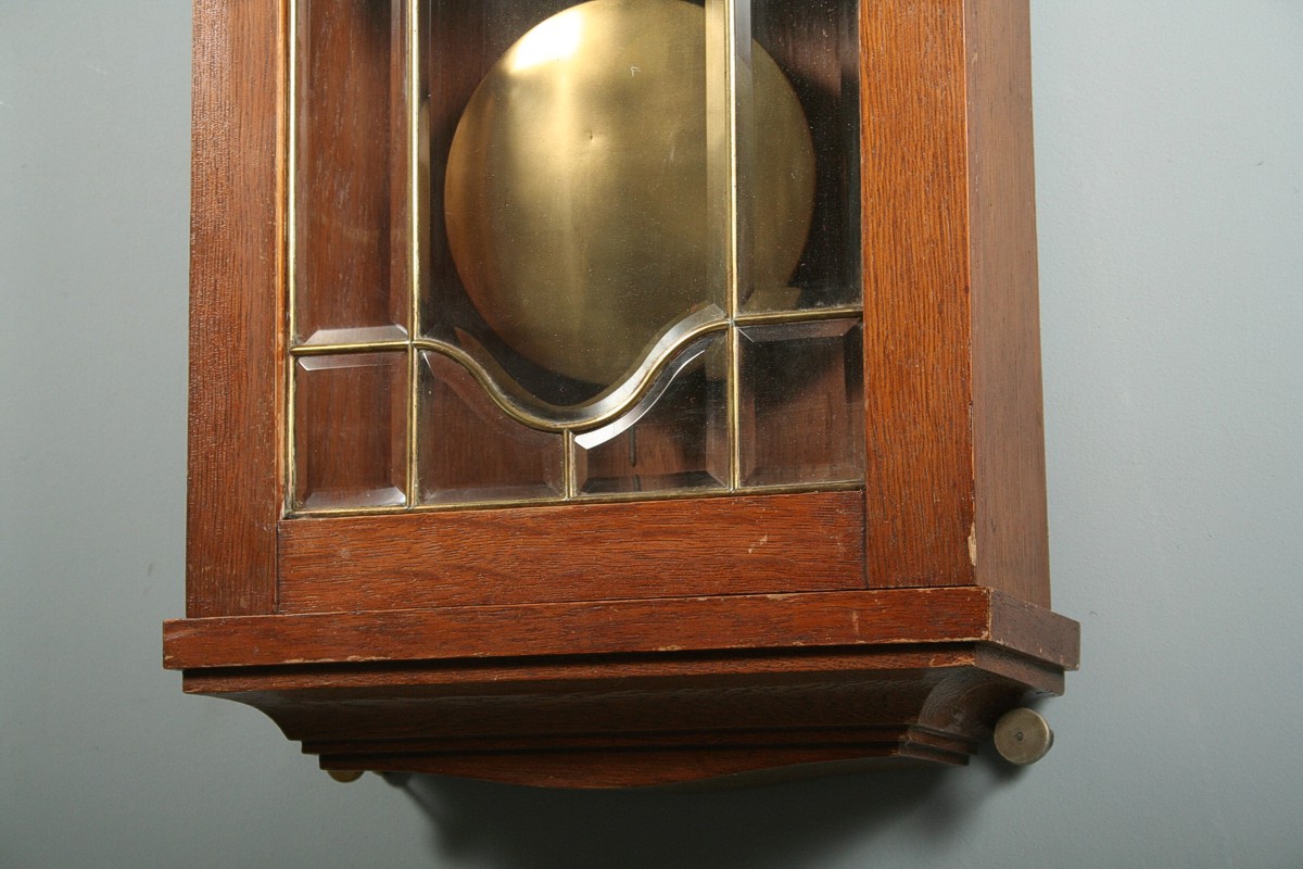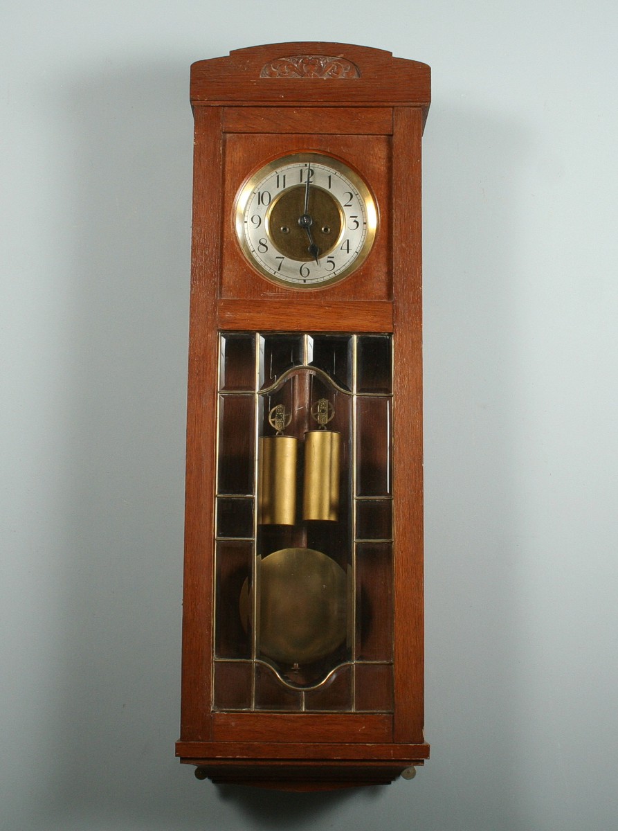 závěsné bicí hodiny v pozdně secesní dřevěné skříňce s fazetovanými skly a mosaznou vitráží, dubový masiv s ornamentálně řezanou volutou, x cm, stroj se závažovým chodem s plechovým ciferníkem, stroj značený okřídleným kolem Kienzle, půlové bití do tyčí, funkční s klíčem, 94 x 31 cm