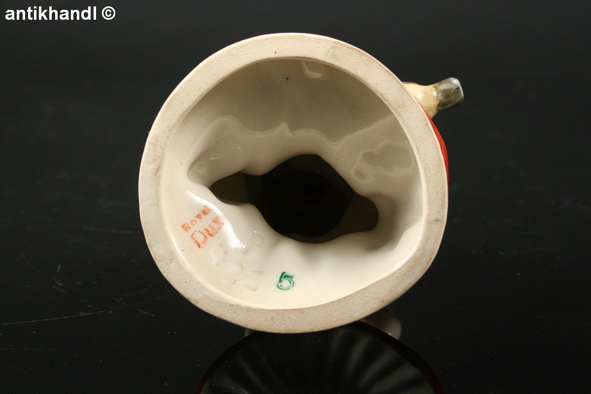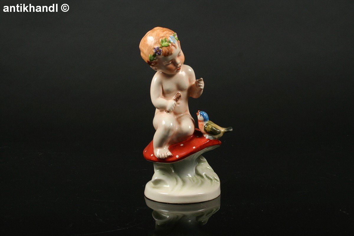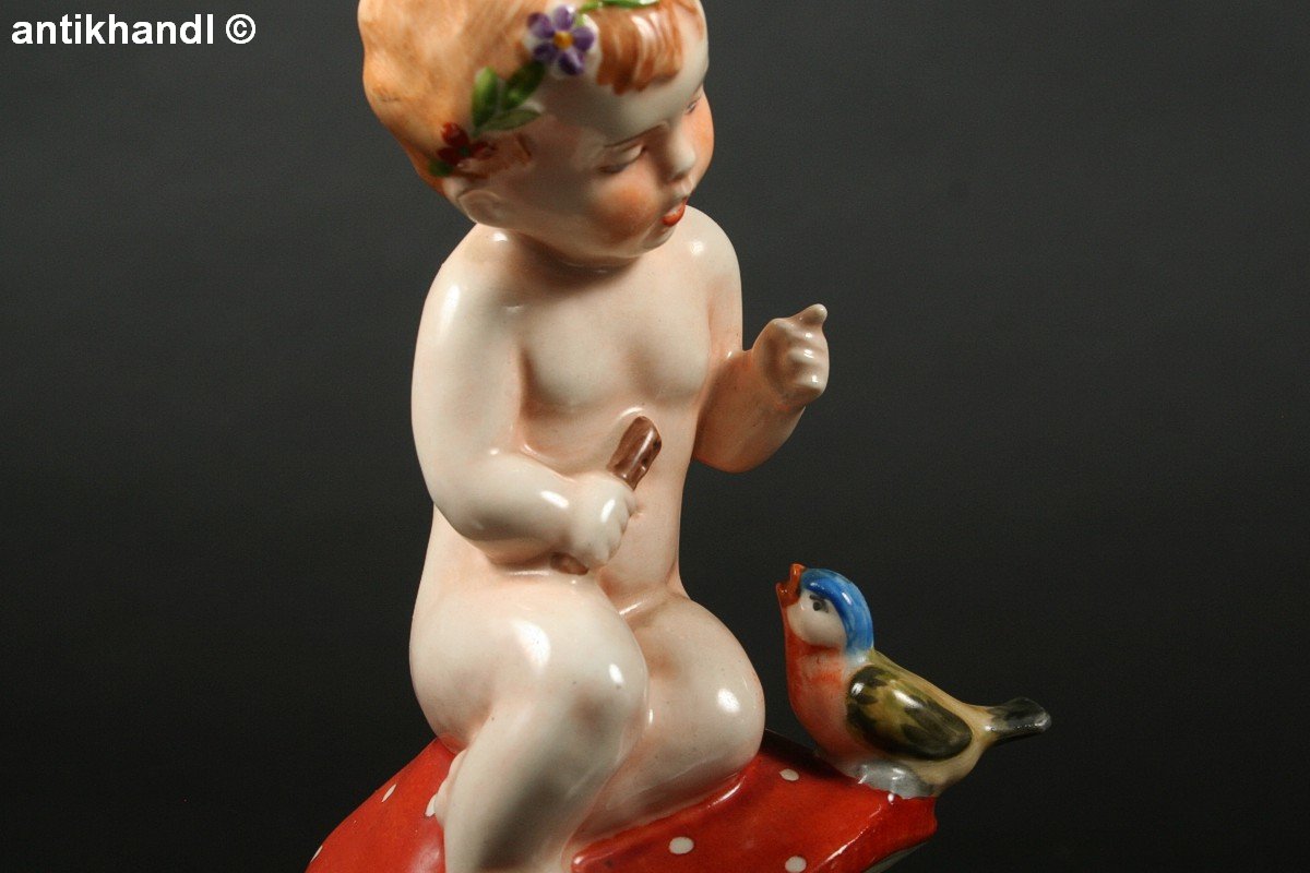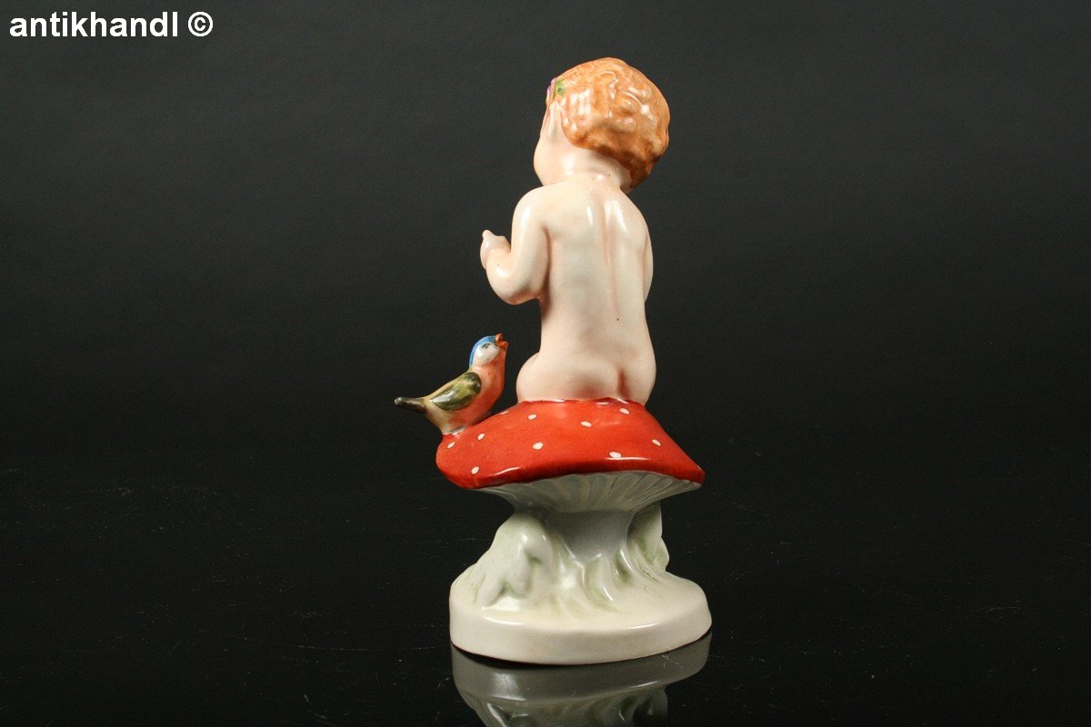 stará porcelánová soška, chlapeček sedící na mochomůrce a rozmloující s ptáčkem, patrně výuka zpěvu, bílý porcelán malovaný na dně značený tištěnou značkou Royal DUX Duchcov, 17 cm