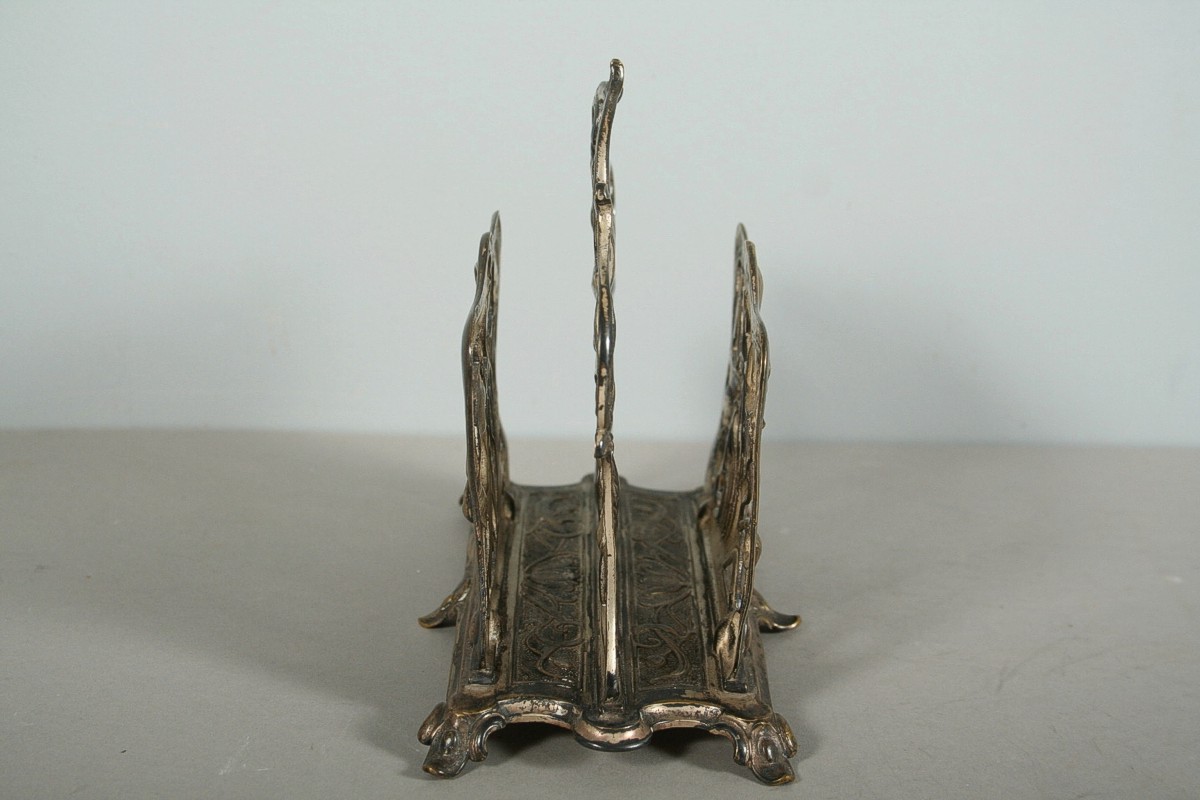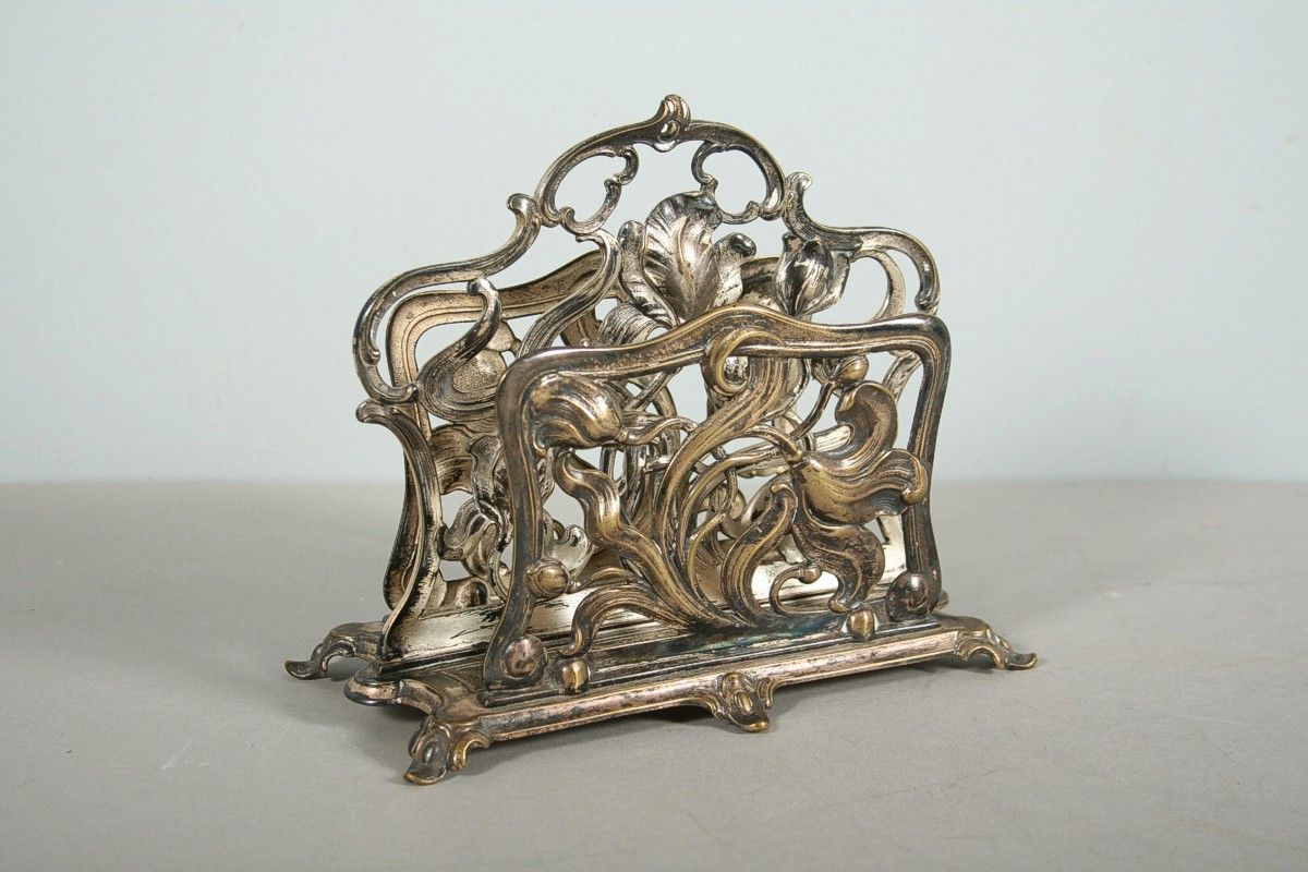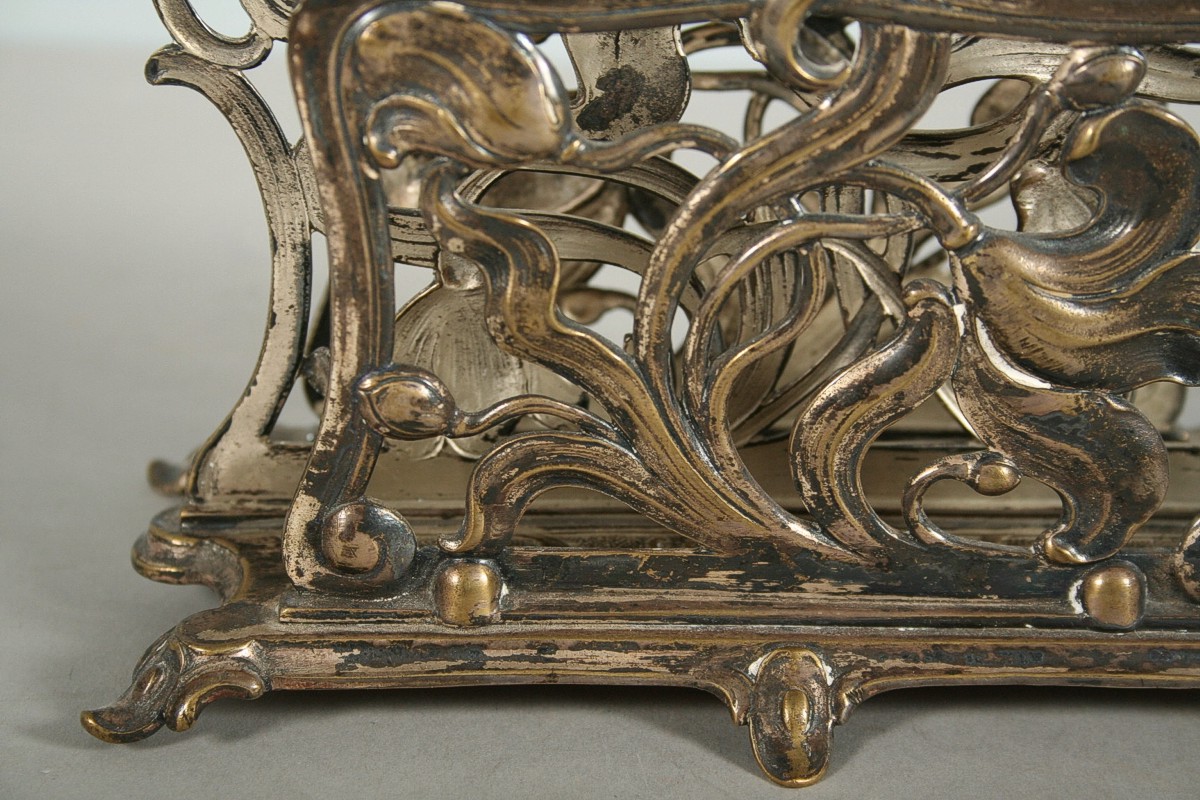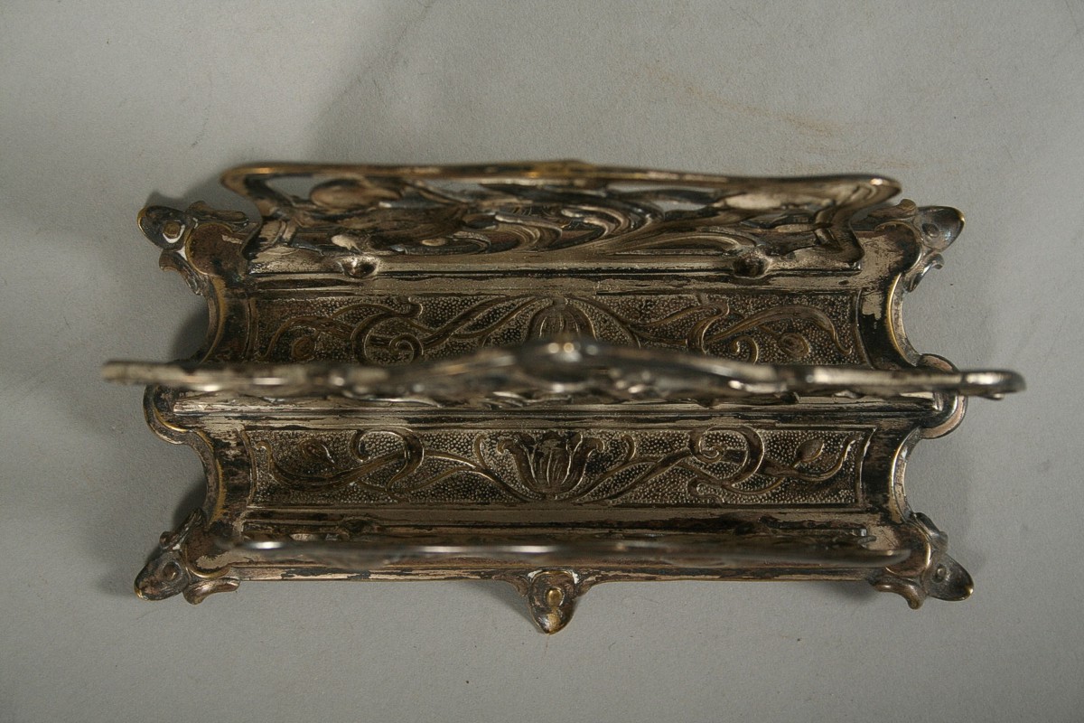 secesní stojánek z alpaky na dopisy, nebo ubrousky, kovové stříbřené provedení bohatě dekorováno plastickým reliéfem květin, vídeňská florální secese z přelomu 19. a 20. století, značeno na dně tlačenou značkou A.K.& Cie, 14 x 17 x 8 cm