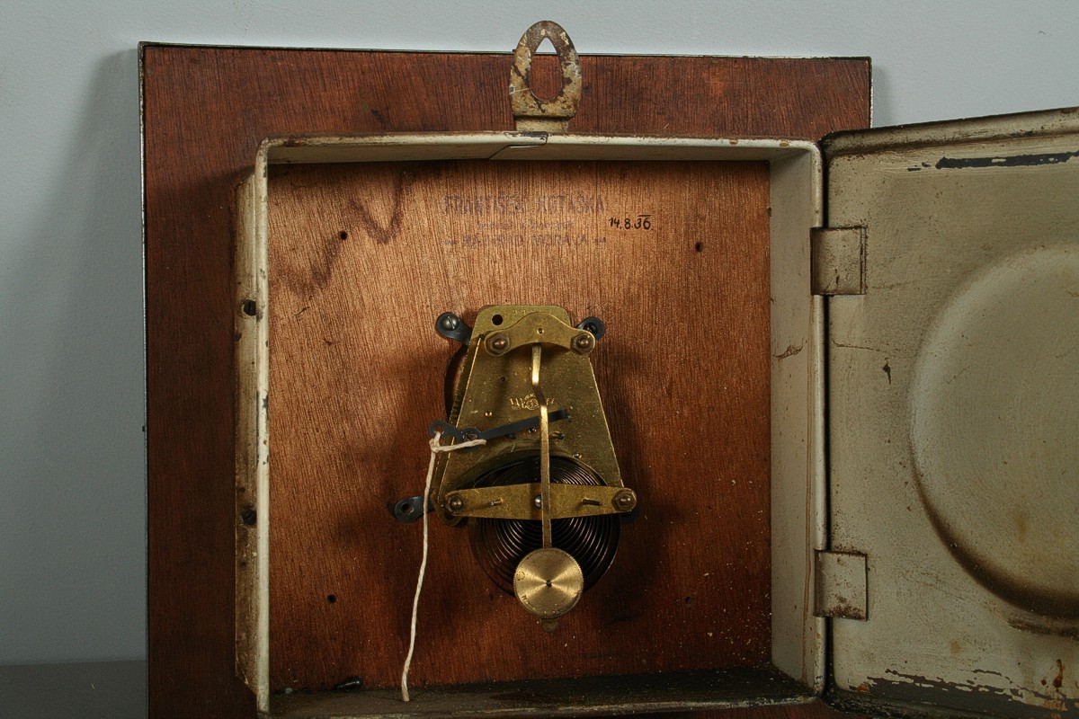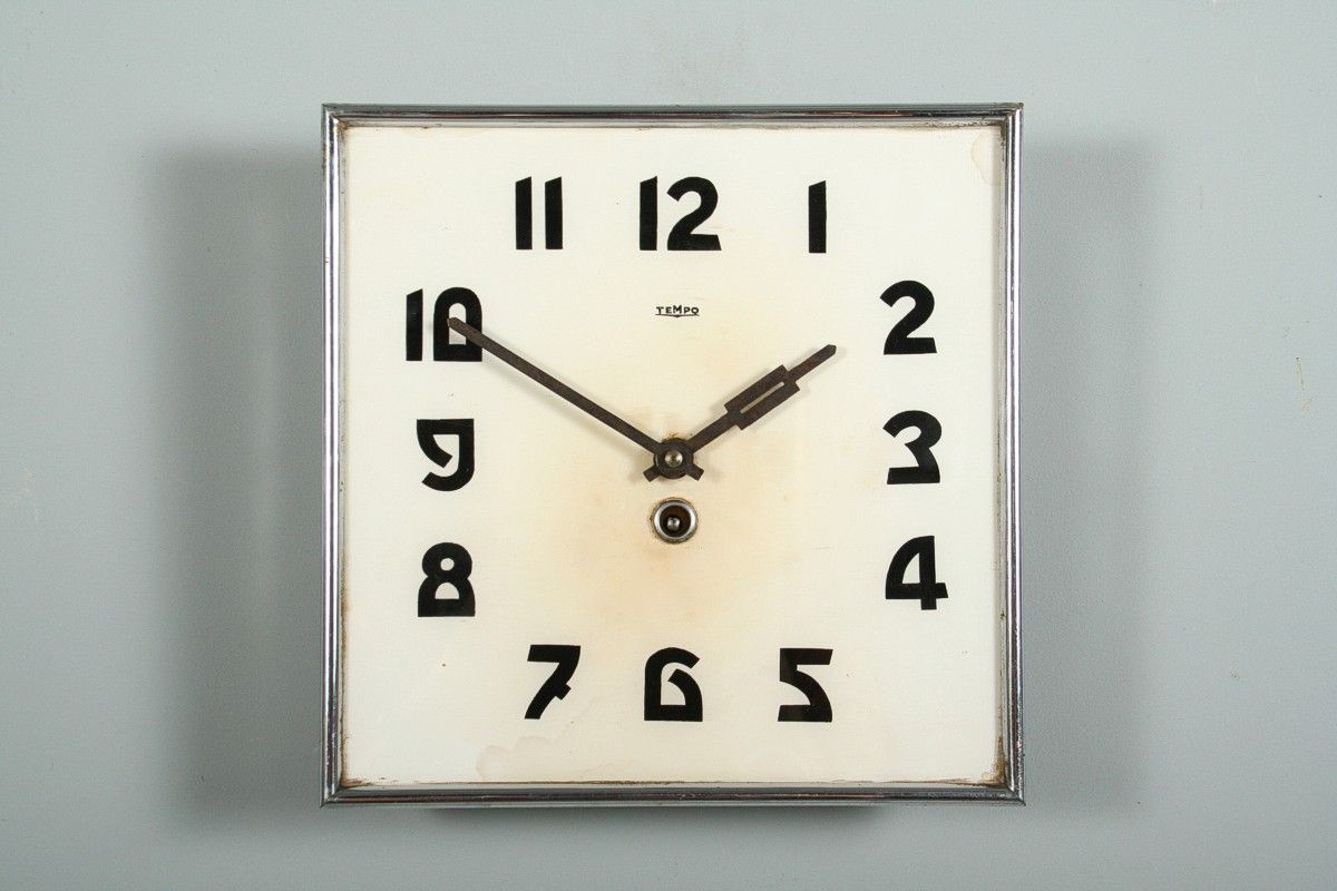 nástěnné hodiny čtvercového tvaru ve stylu art deco, ciferník skleněný s nápisem TEMPO, lemovaný chromovaným rámečkem z kovu, stroj funkční s klíčkem, značený Kienzle, 1. pol. 20. století, 24,5 x 24,5 cm