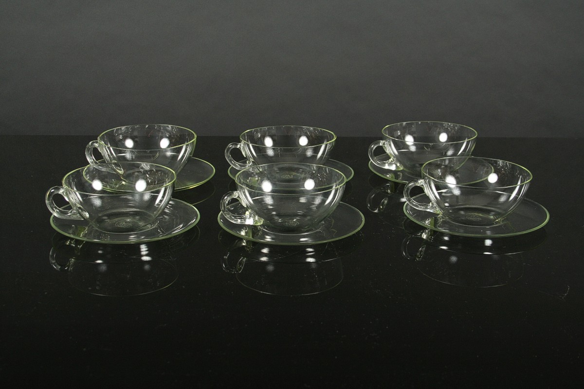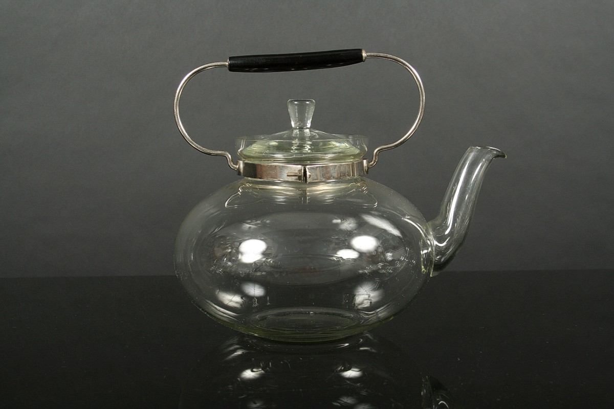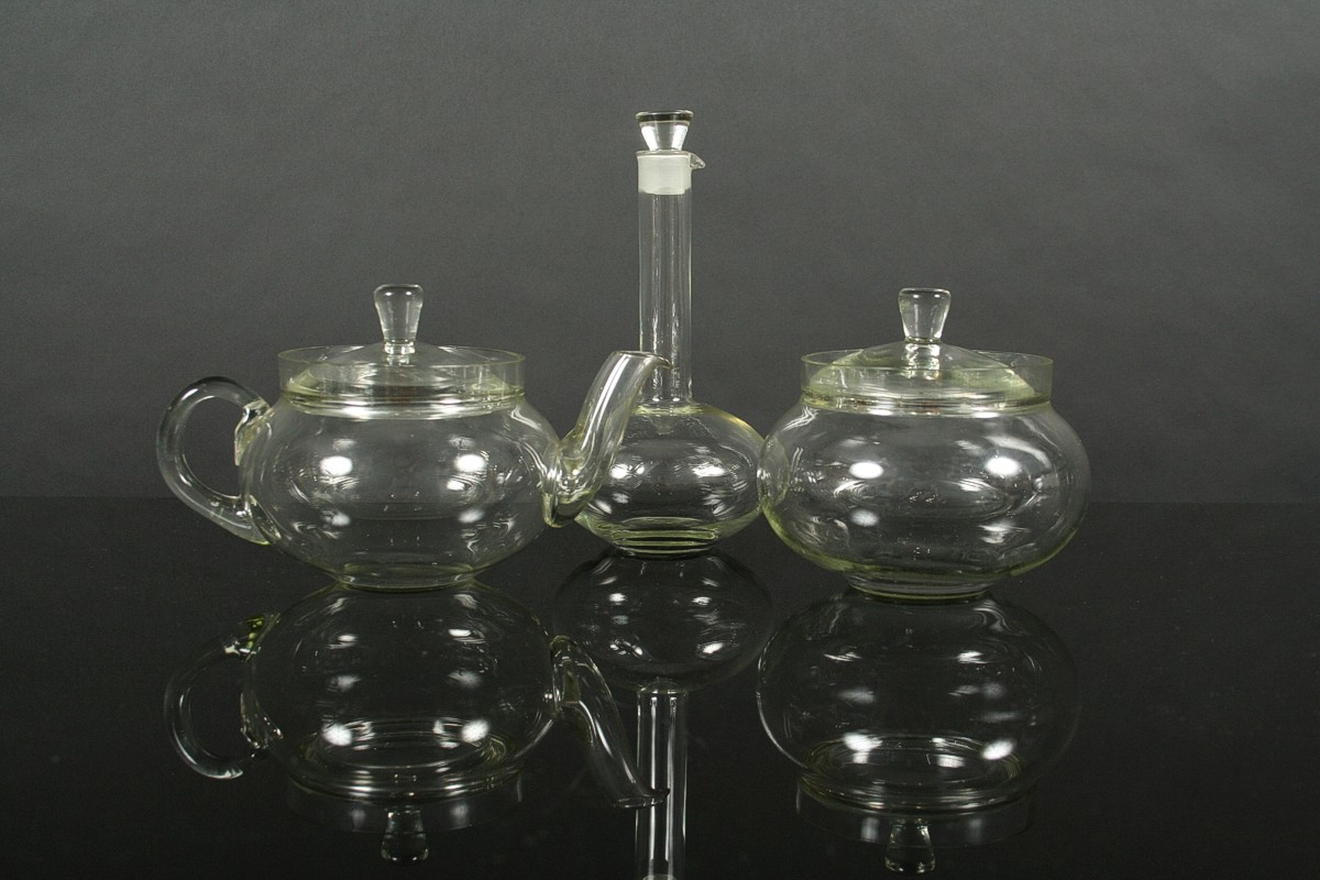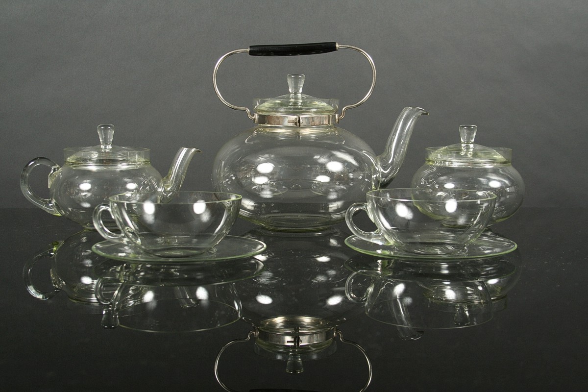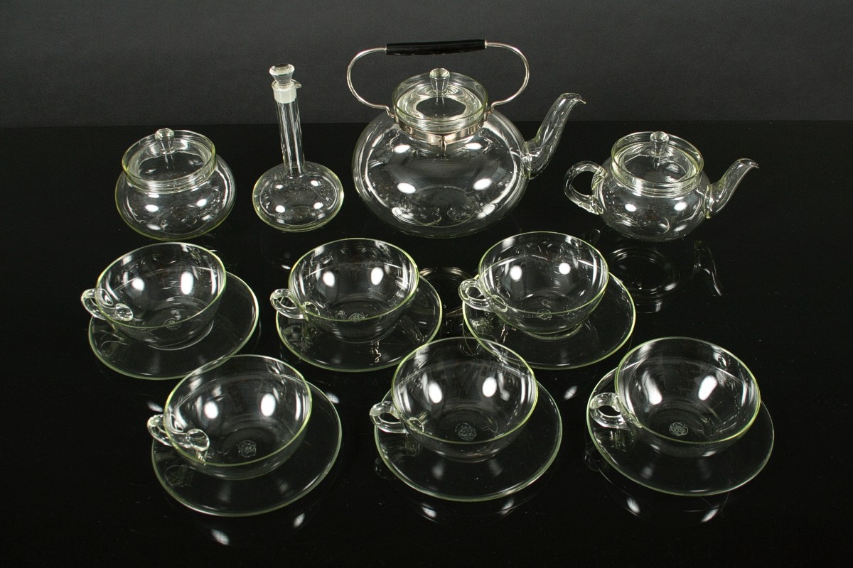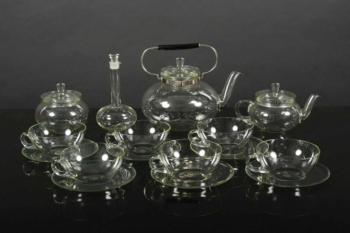 ikona českého designu, kompletní čajový servis pro šest osob z varného laboratorního skla, autor Ladislav Sutnar, 10 ks, 6x šálek s podšálkem, velká konvice s víčkem a kovovou montáží s dřevěným úchytem, konvička s víčkem, cukřenka s víčkem a karafa, všechny kusy značeny DP Palex, Družstevní práce pro Krásnou jizbu návrh r. 1931, v perfektním původním nepoškozeném stavu, bez jediného oťuku.