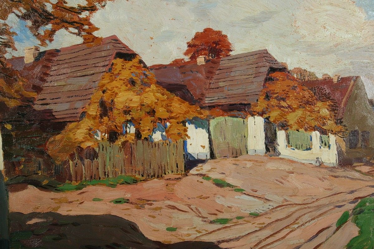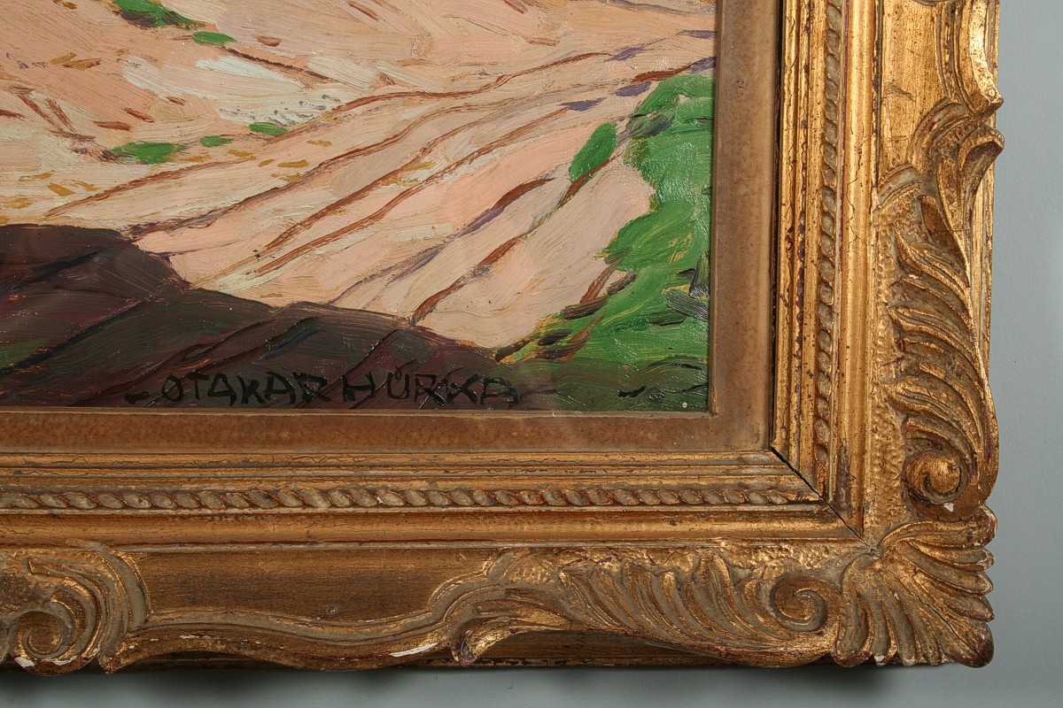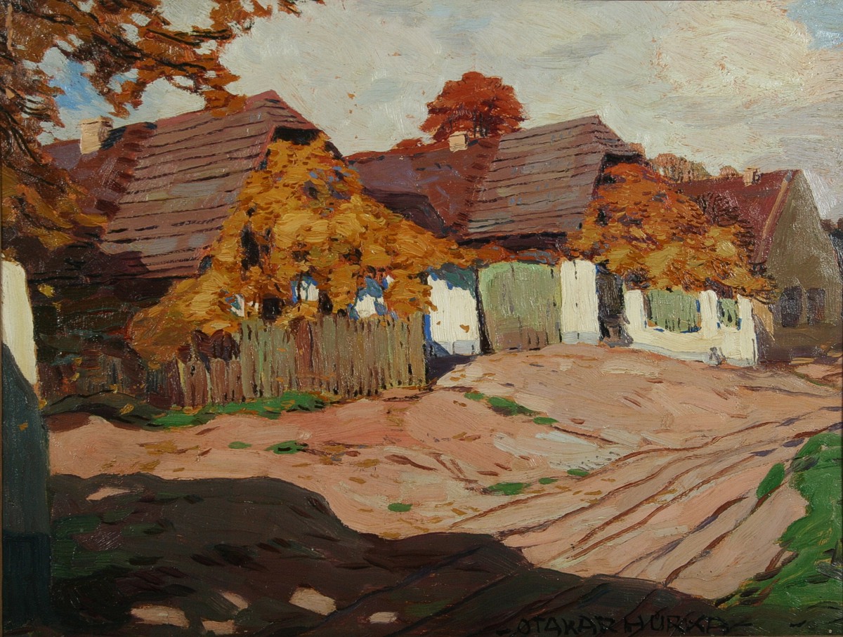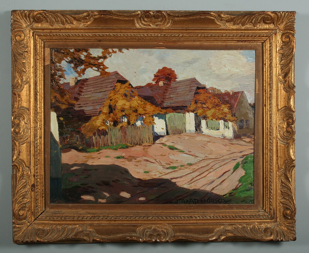 obraz návse, olej na kartonu, 45 x 60 cm, s rámem 68 x 83 cm, autor Otakar Hůrka, tento obraz patrí mezi obrazy tvořené bezprostředně pod vlivem jeho učitele Aloise Kalvody, podepsáno vpravo dole Otakar Hůrka, rámováno v řezaném a zlaceném rámu