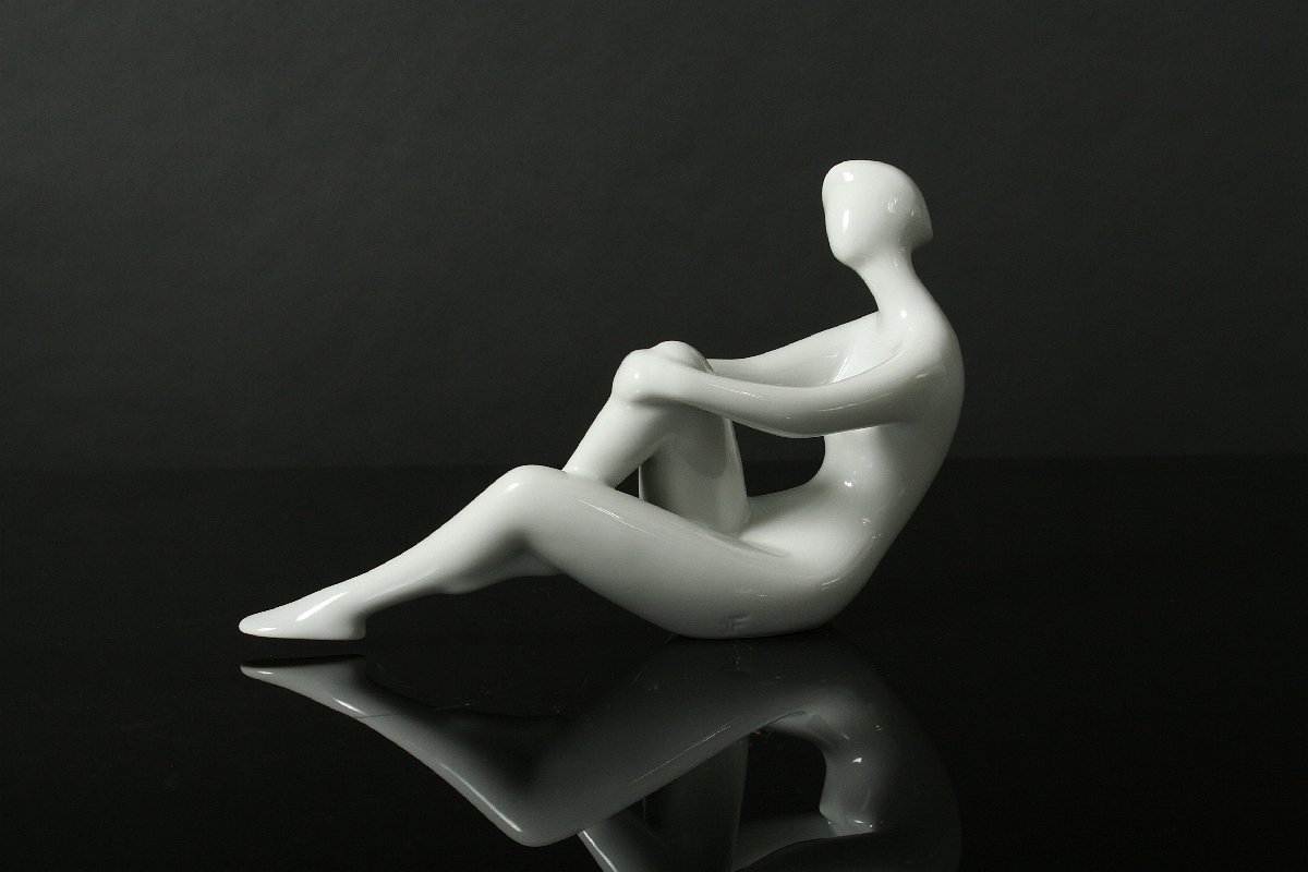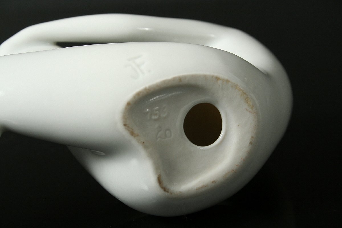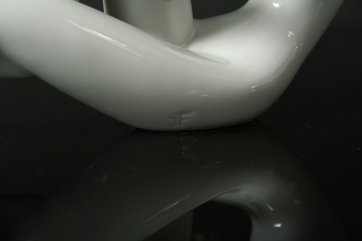 soška dívčího aktu, bílý glazovaný porcelán, autorka návrhu Jitka Forejtová, značené tlačeným monogramem JF, tlačené číslice, produkce Royal DUX Duchcov 60. léta 20. století, tzv bruselský styl, výška 13,5 x 21 cm