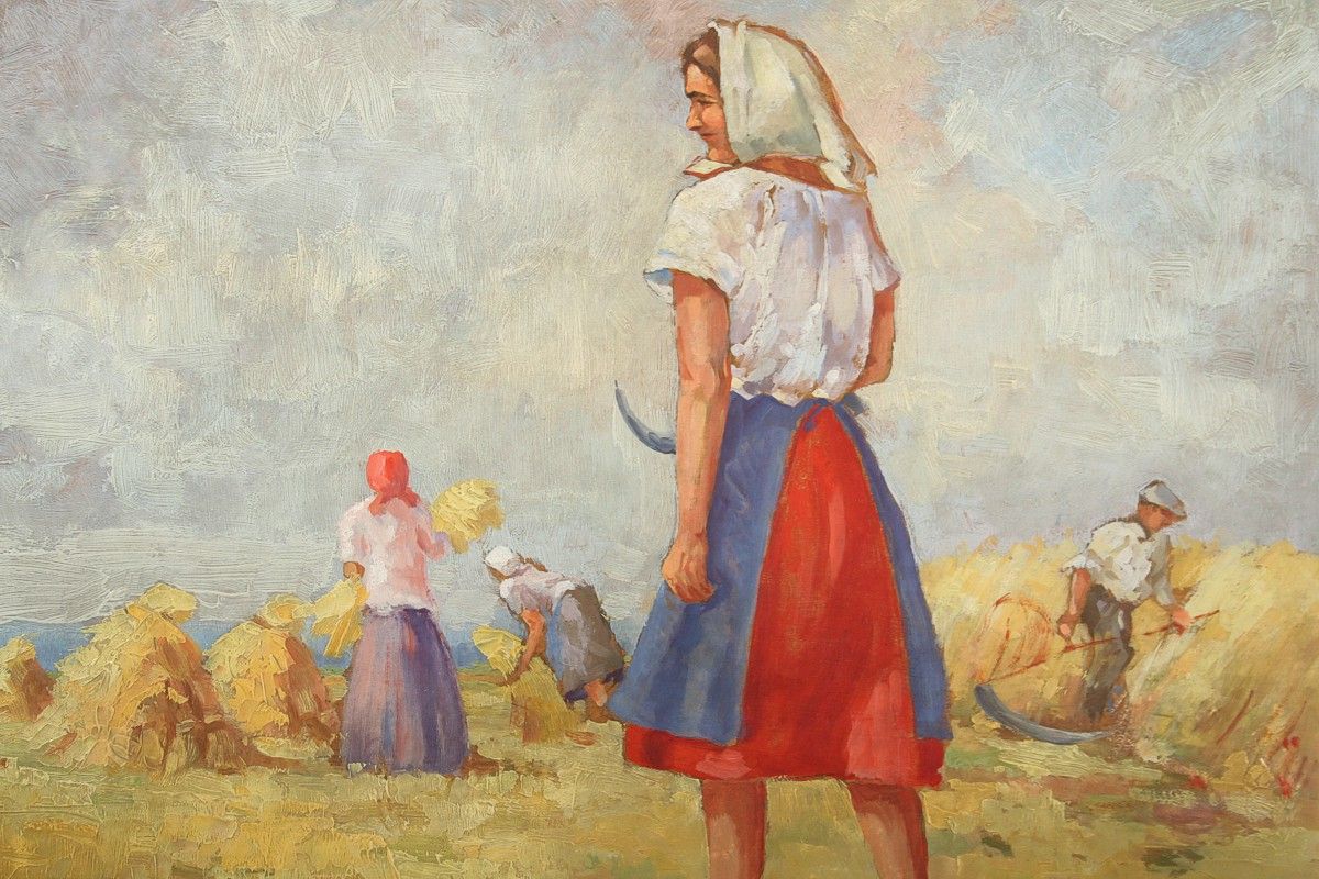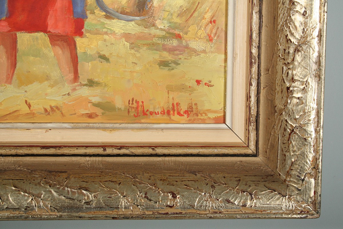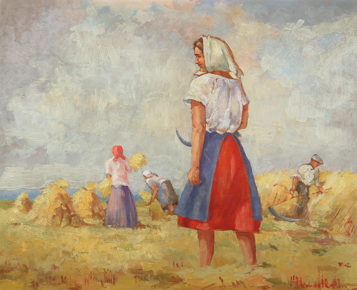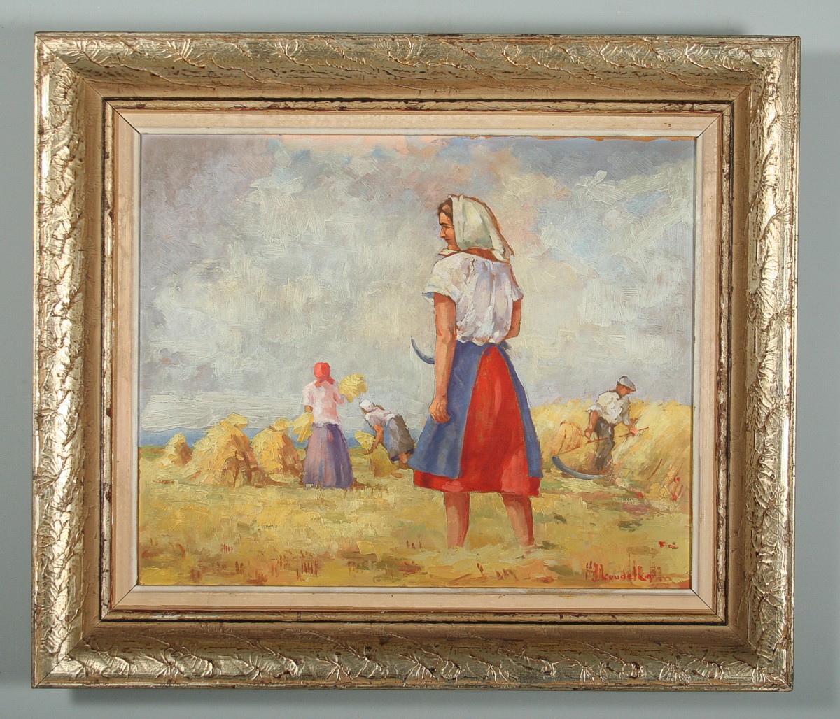 starý obraz selky a dalších postav při práci na poli, olej na dřevěné desce překližce, 50 x 60 cm s rámem 69 x 80 cm, autor Joža Koudelka, podepsáno vpravo dole J. Koudelka, rámováno v původním stříbřeném rámu