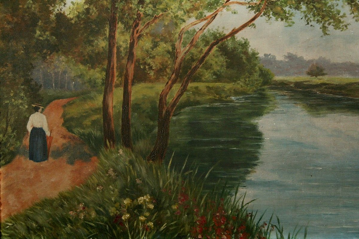 obraz dámy v klobouku se slunečníkem na procházce kolem vody, olej na plátně, 32 x 58 cm s rámem 44 x 69, autor neznámý, podepsáno uprostřed Fajfr 1906, rámováno v původním zdobeném a zlaceném rámu z konce 19. století