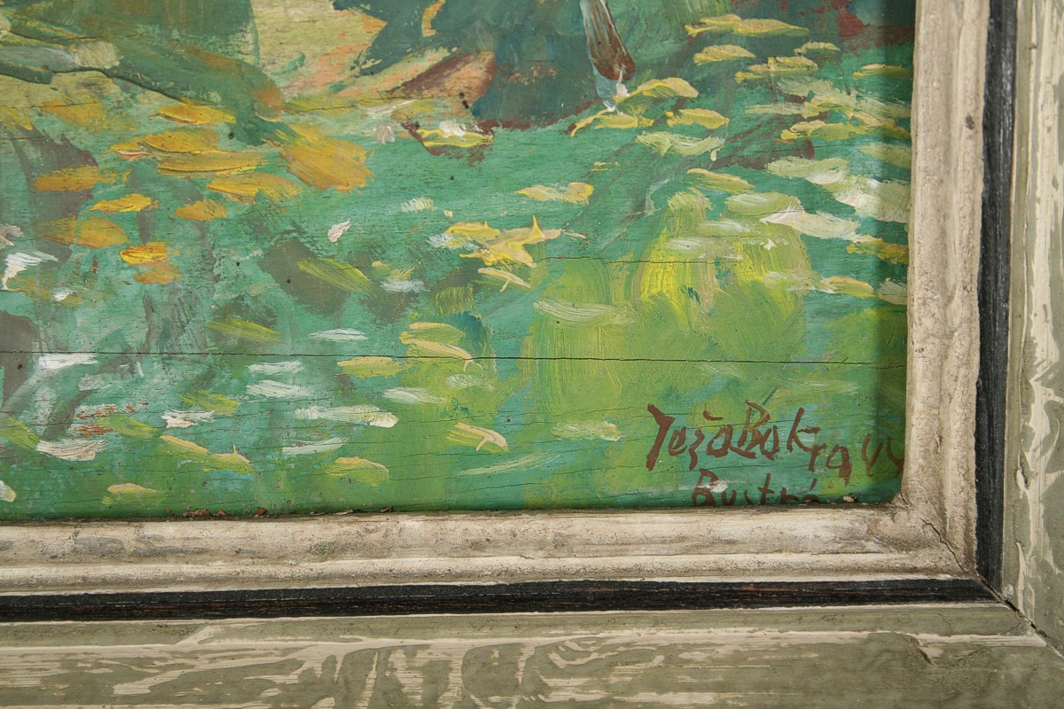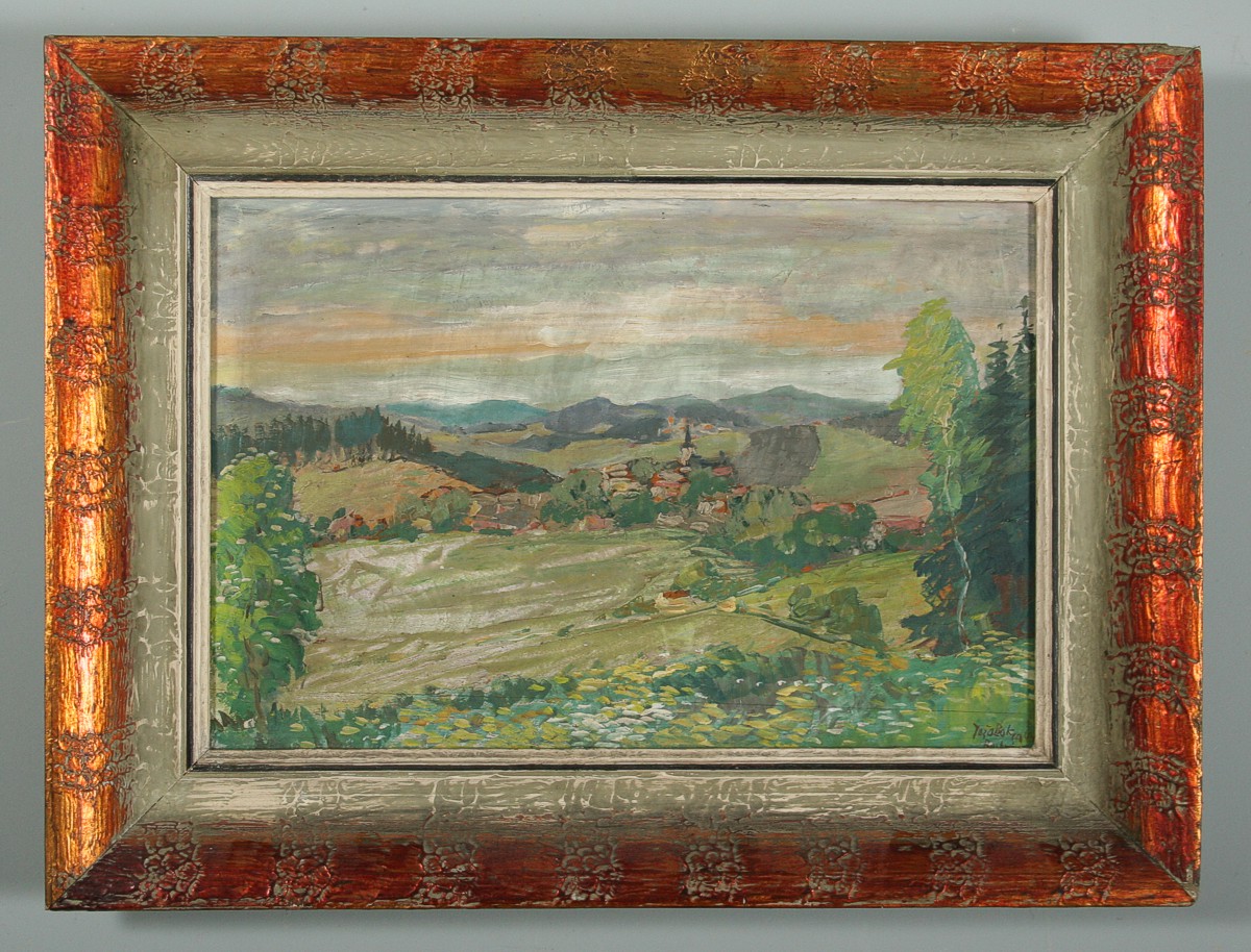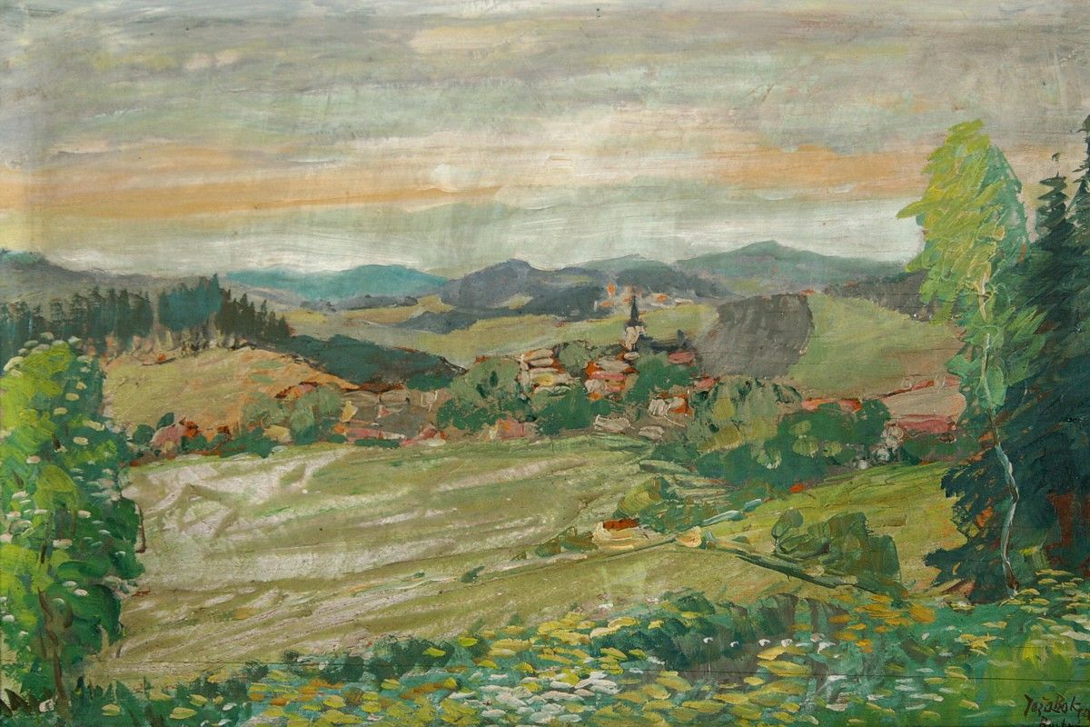 obraz vesnice Bystré v Orlických horách, olej na dřevěné desce 30 x 44 cm s rámem 44 x 58 cm, autor neznámý Joža Bok, podepsáno v pravo dole Joža Bok 1944 Bystré, rámováno v původním rámu