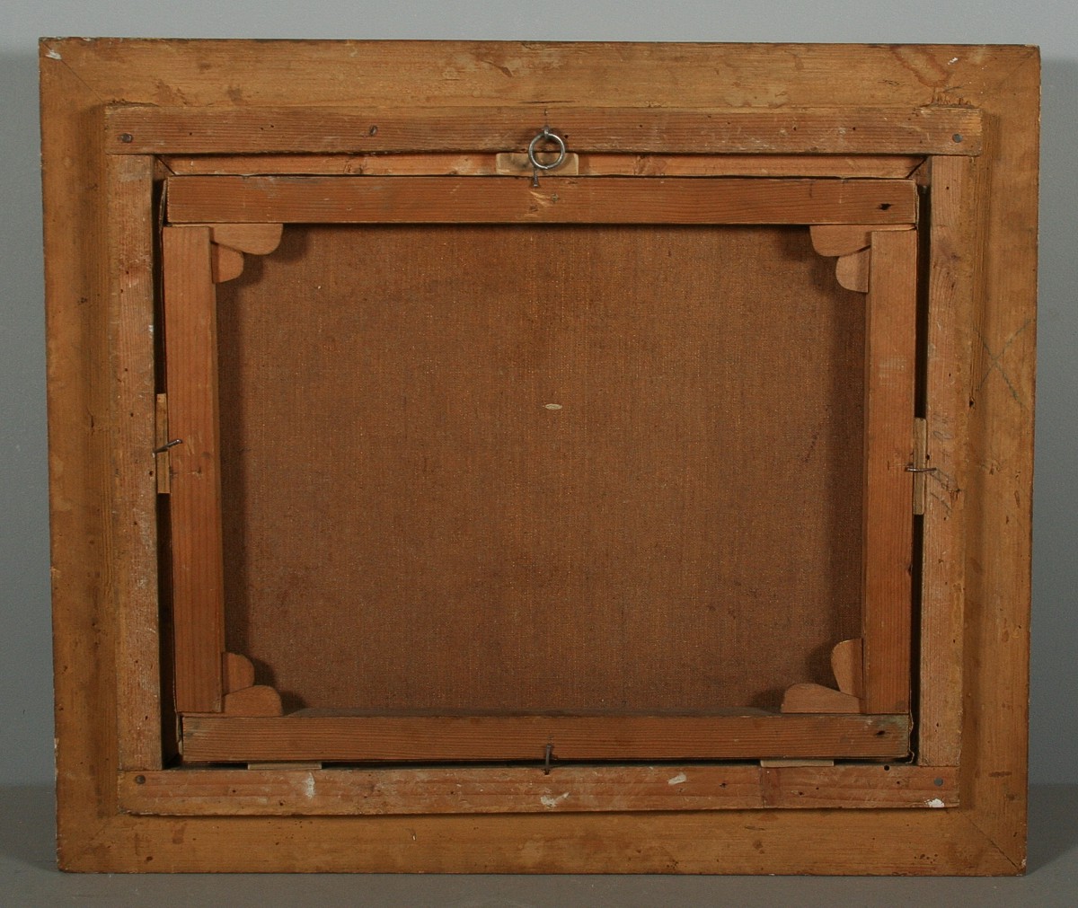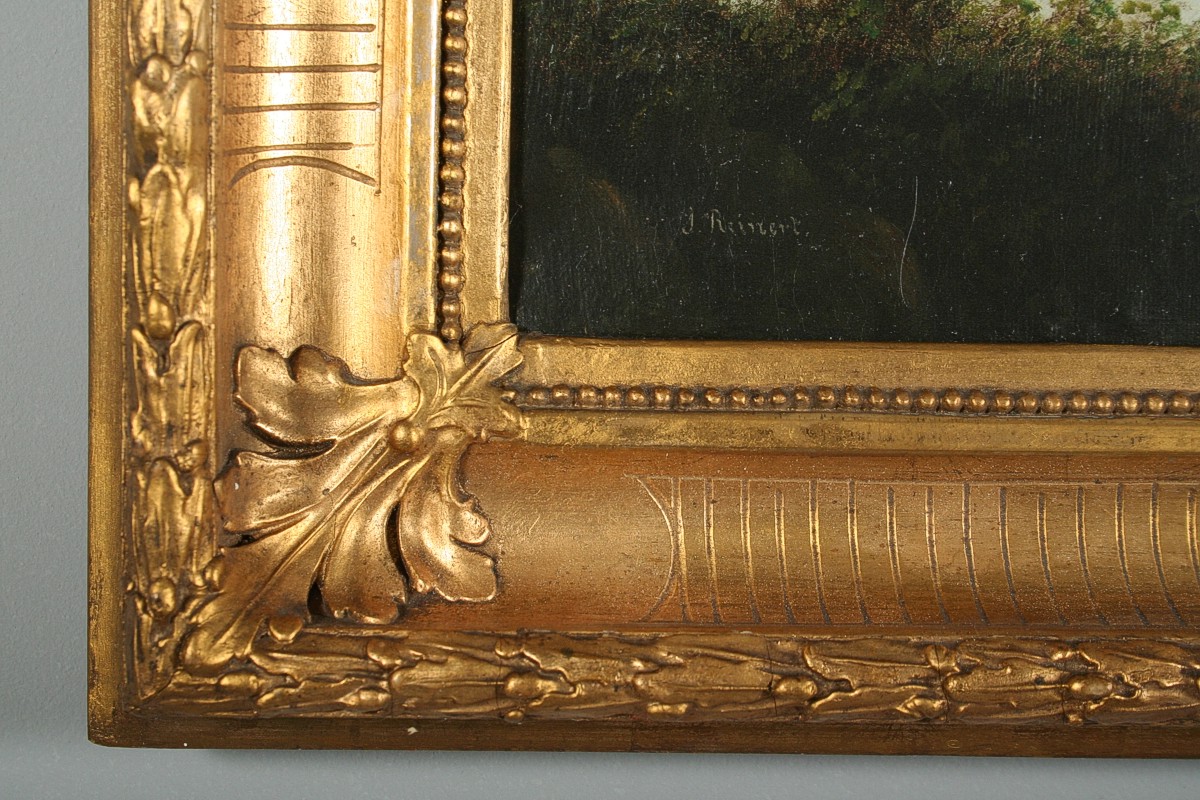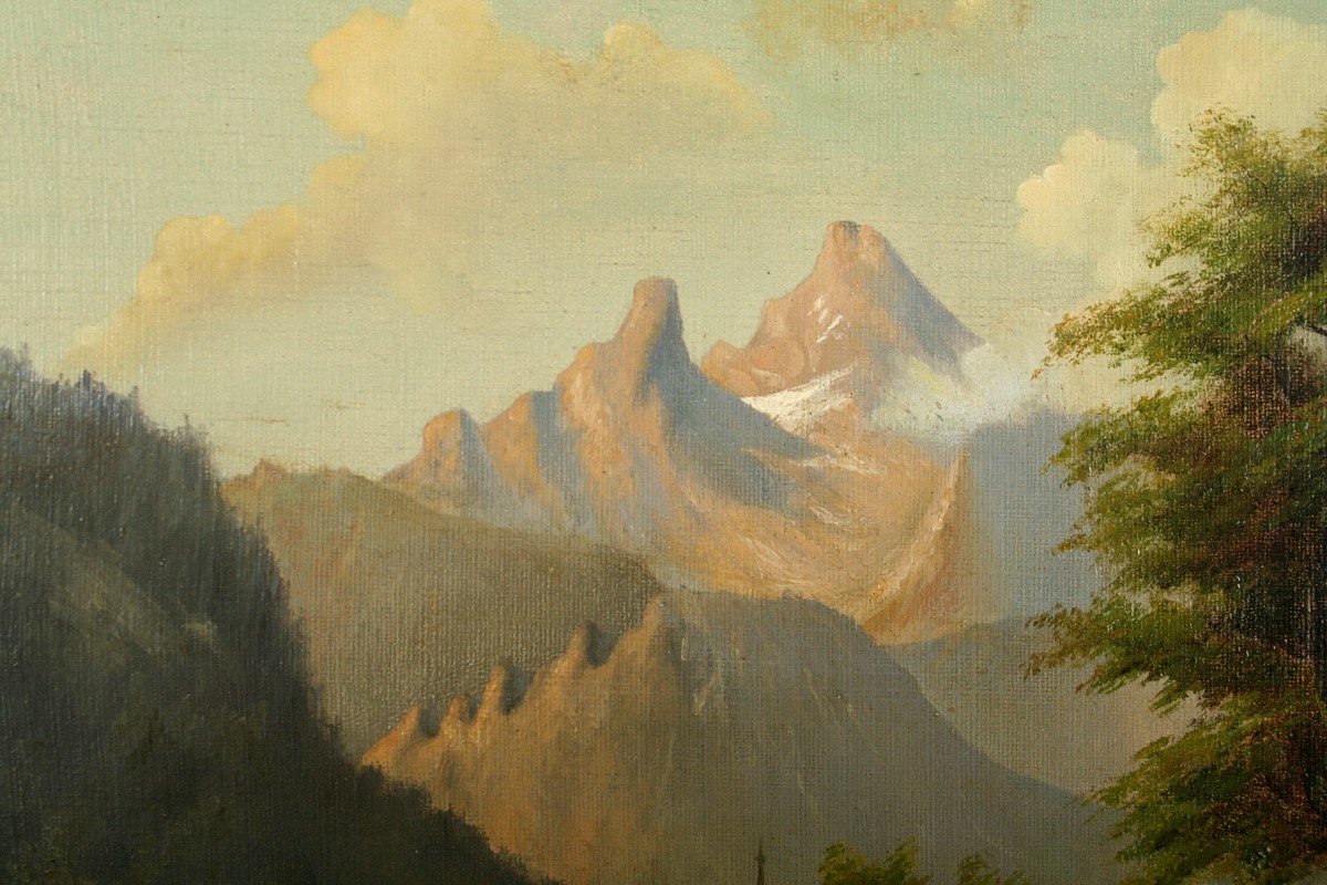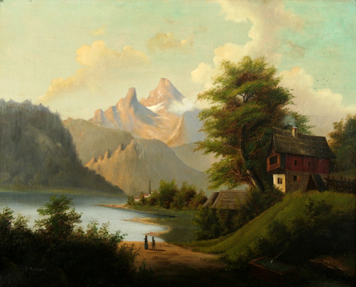 obraz romantické krajiny v horách s figurální stafáží u jezera a vesnicí vzadu, olej na plátně 32 x 40 cm, s rámem 47 x 55 cm, autor neznámý, 2. polovina 19. století, podepsáno vlevo dole J. Rainert, rámováno v původním zlaceném a zdobeném rámu