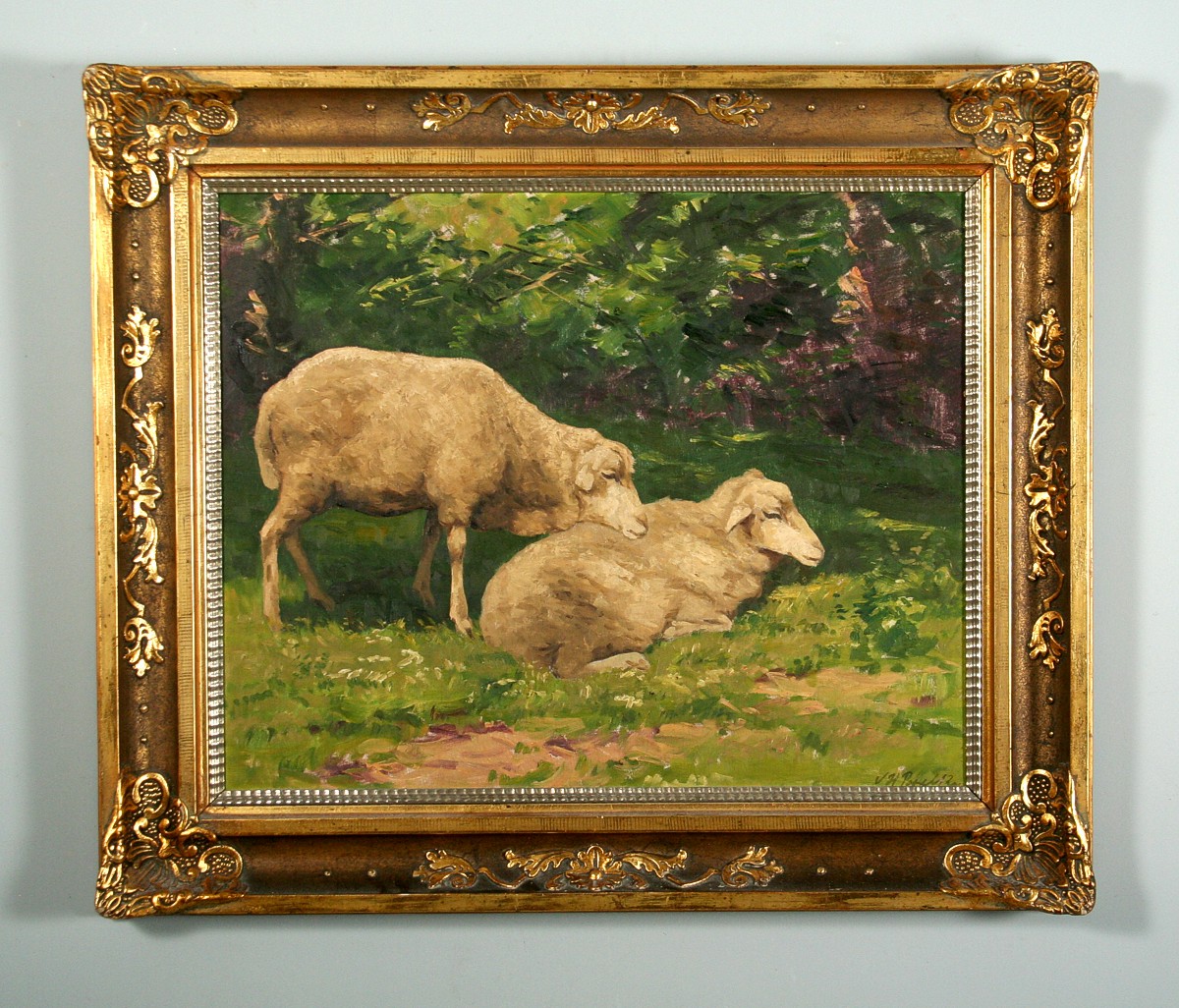 obraz oveček při odpočinku na slunci, olej na lepence 50 x 63 cm s rámem 71 x 83 cm, autor Vojtěch Popelka, podepsáno vpravo dole V.H. Popelka, rámováno v původním zdobeném rámu