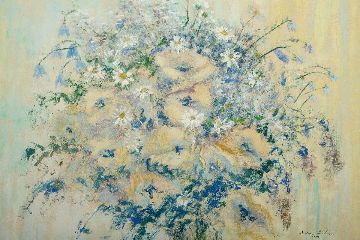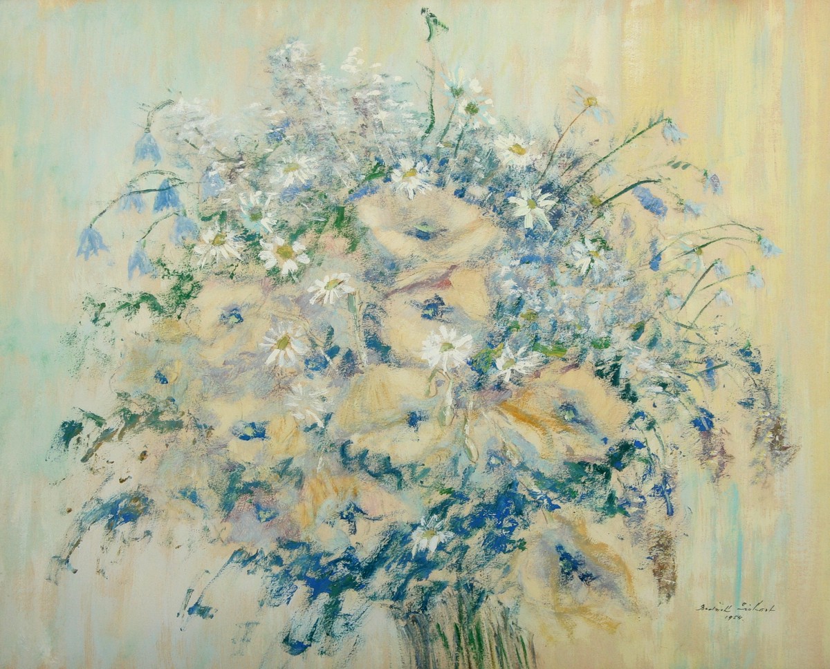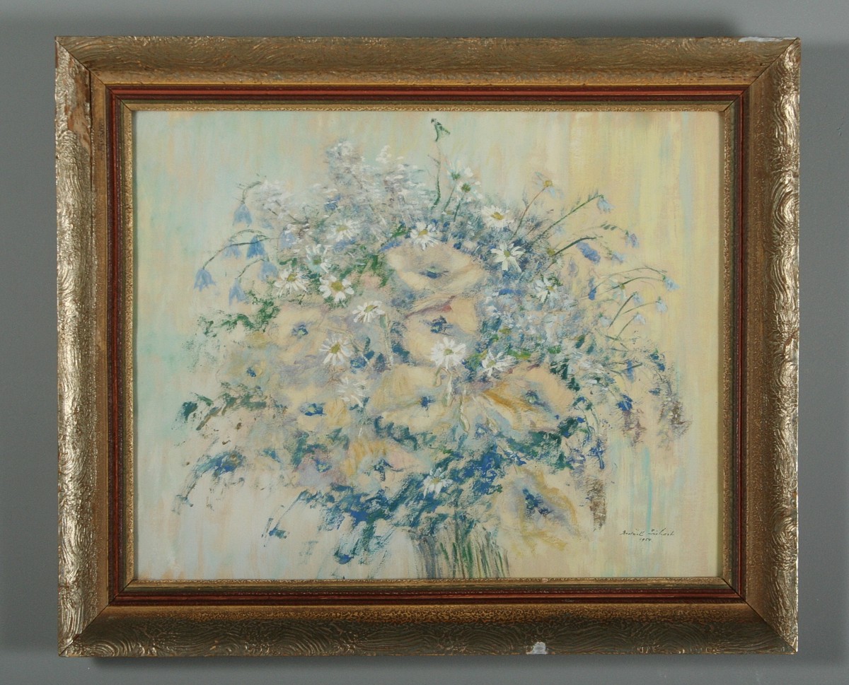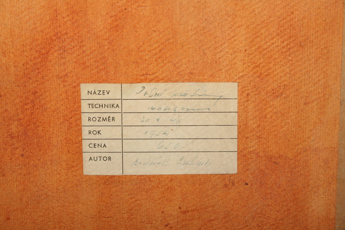obraz lučních květin, olej na lepence, lepenka 39 x 49 s rámem 50 x 60 cm, autor Bedřich Linhart, podepsáno vpravo dole Bedřich Linhart 1954, vzadu autorský štítek s autodedikací, rámováno v původním rámu pod sklem