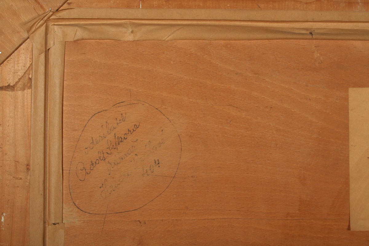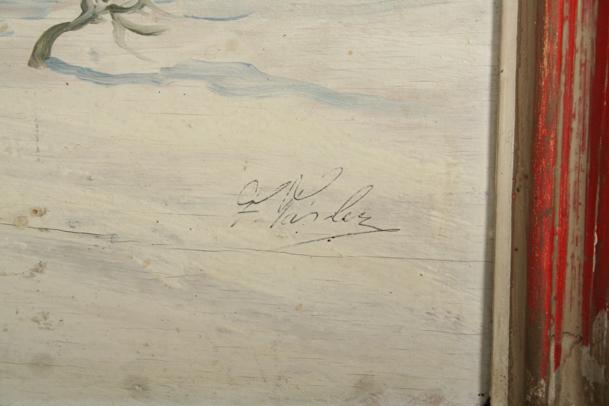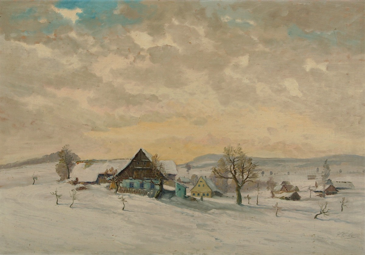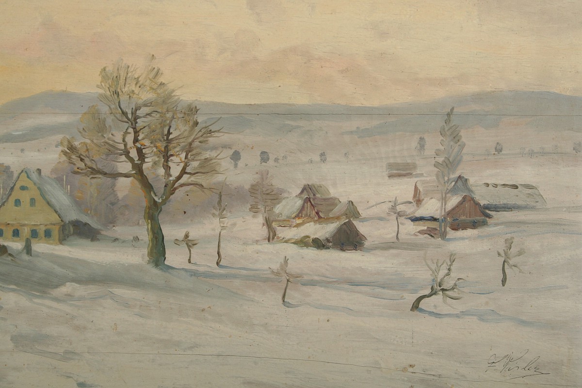 velký obraz zimní krajiny v okolí Nové Paky s chalupami, olej na dřevěné lepené desce (překližka), 69 x 99 cm, s rámem 85 x 114 cm, autor Ferdinand Tásler, podepsáno vpravo dole F. Tásler, na zadní straně autorský štítek s přípisy, opravdu vkusně namalovaná zimní krajina vycházející z mistrovských děl Františka Kavána, rámováno v původním zdobeném rámu