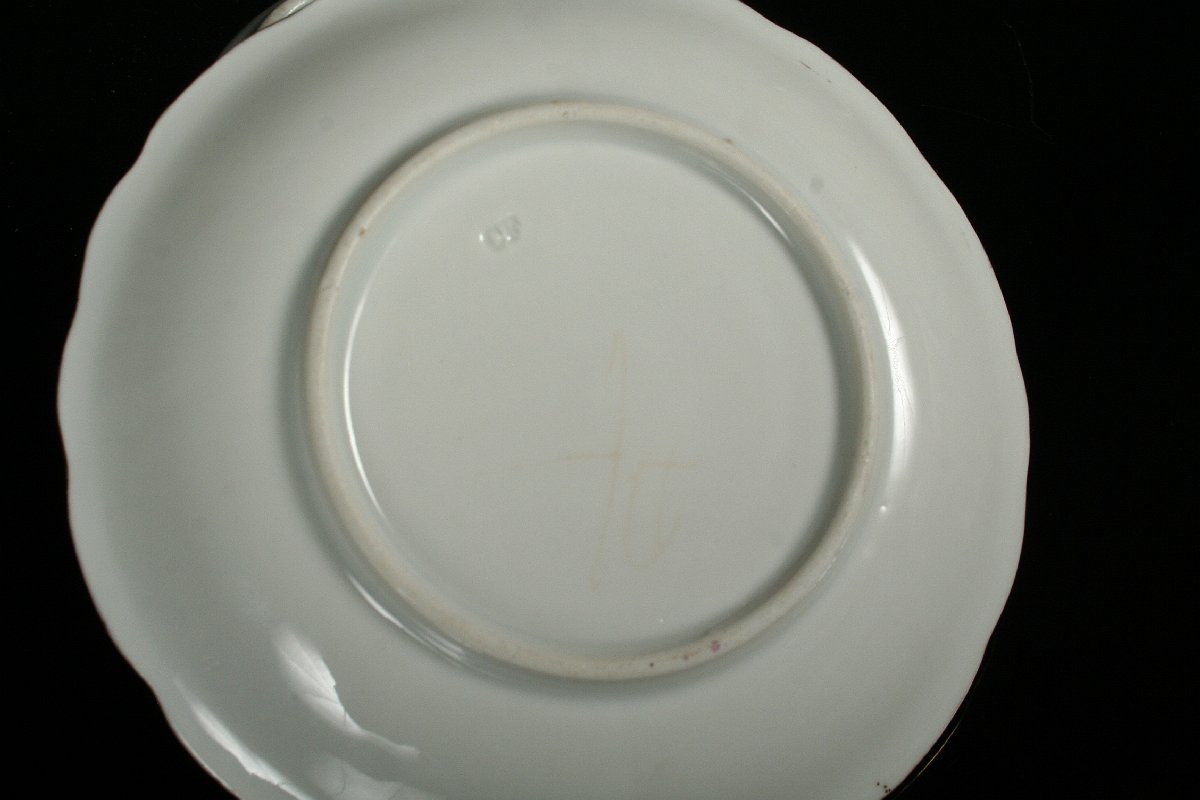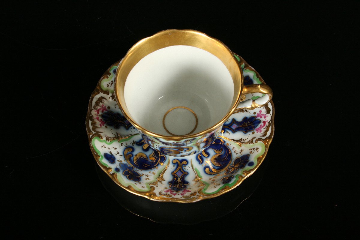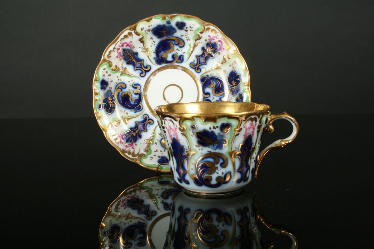porcelánový šálek s podšálkem plasticky projímaného tvaru s malovaným ornamentálním dekorem v kombinaci s kobaltovou modří, bohatě zlacené detaily, oba kusy značeny tlačenou značkou CF Cristian Fischer (Březová) 1846 - 53, vše v perfektním nepoškozeném stavu (to co na podšálku vypadá jako pavouk v glazůře, je značka dekoratéra pod glazůrou, asi tenkou rudkou a nejedná se o poškození), 8 x 15 cm