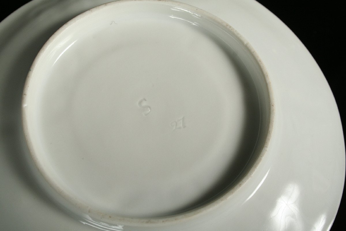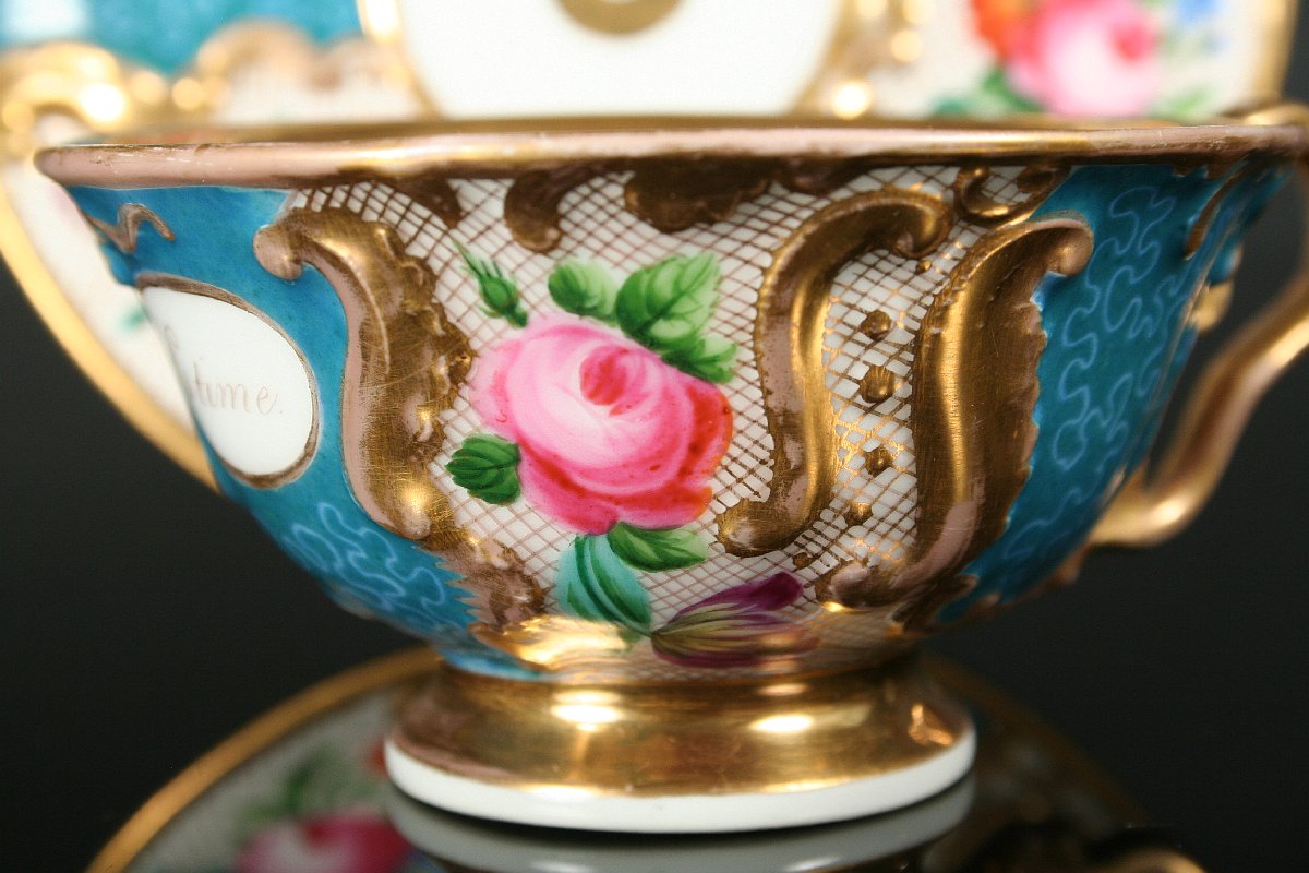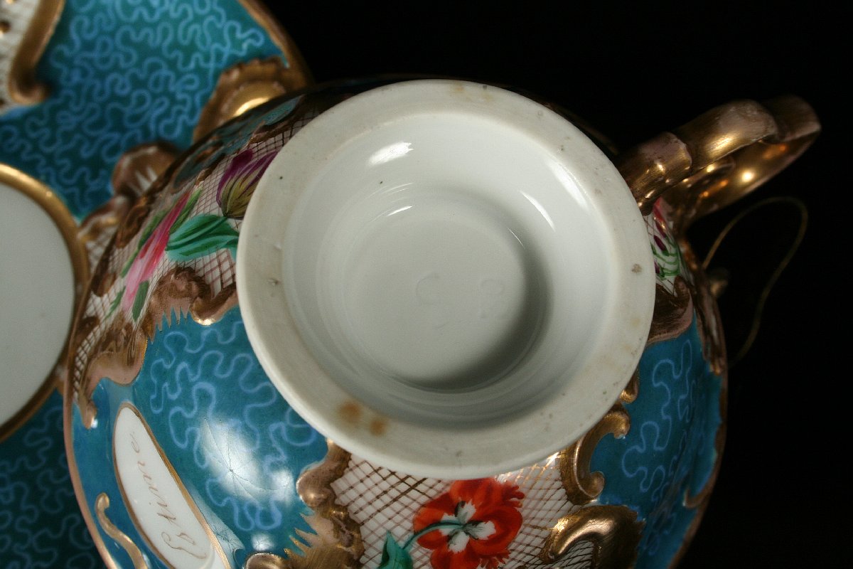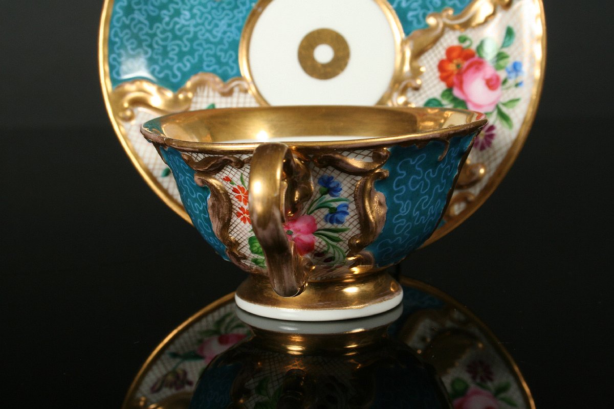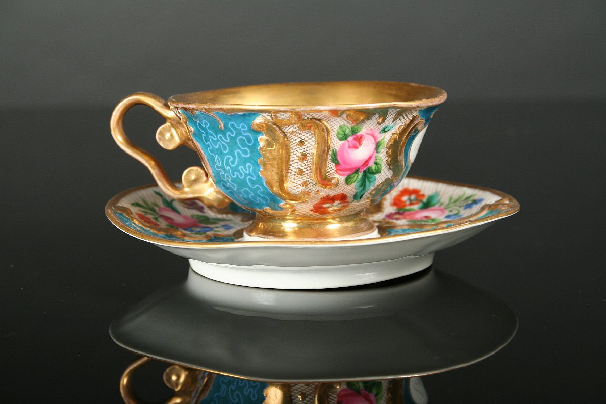 porcelánový šálek s podšálkem plastického tvaru s malovaným dekorem růží a květin v kombinaci s bohatě zlacenými detaily, v oválném medailonku francouzský nápis Estime (úcta) může se jednat o exportní zboží,  oba kusy značeny tlačenou značkou S (Slavkov) 1. polovina 19. století, vše v perfektním nepoškozeném stavu, 5,5 x 13,5 cm