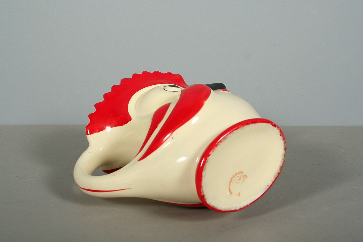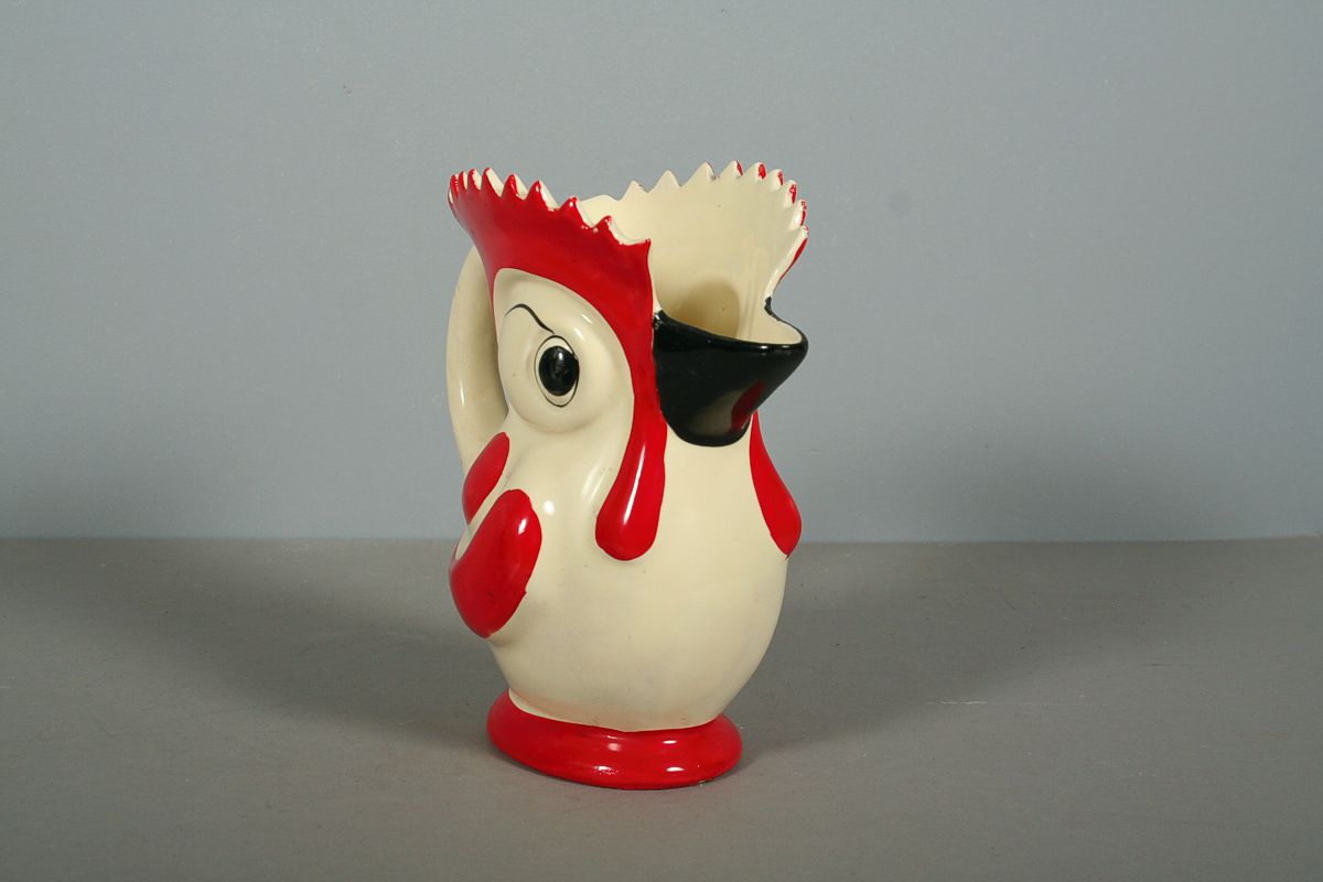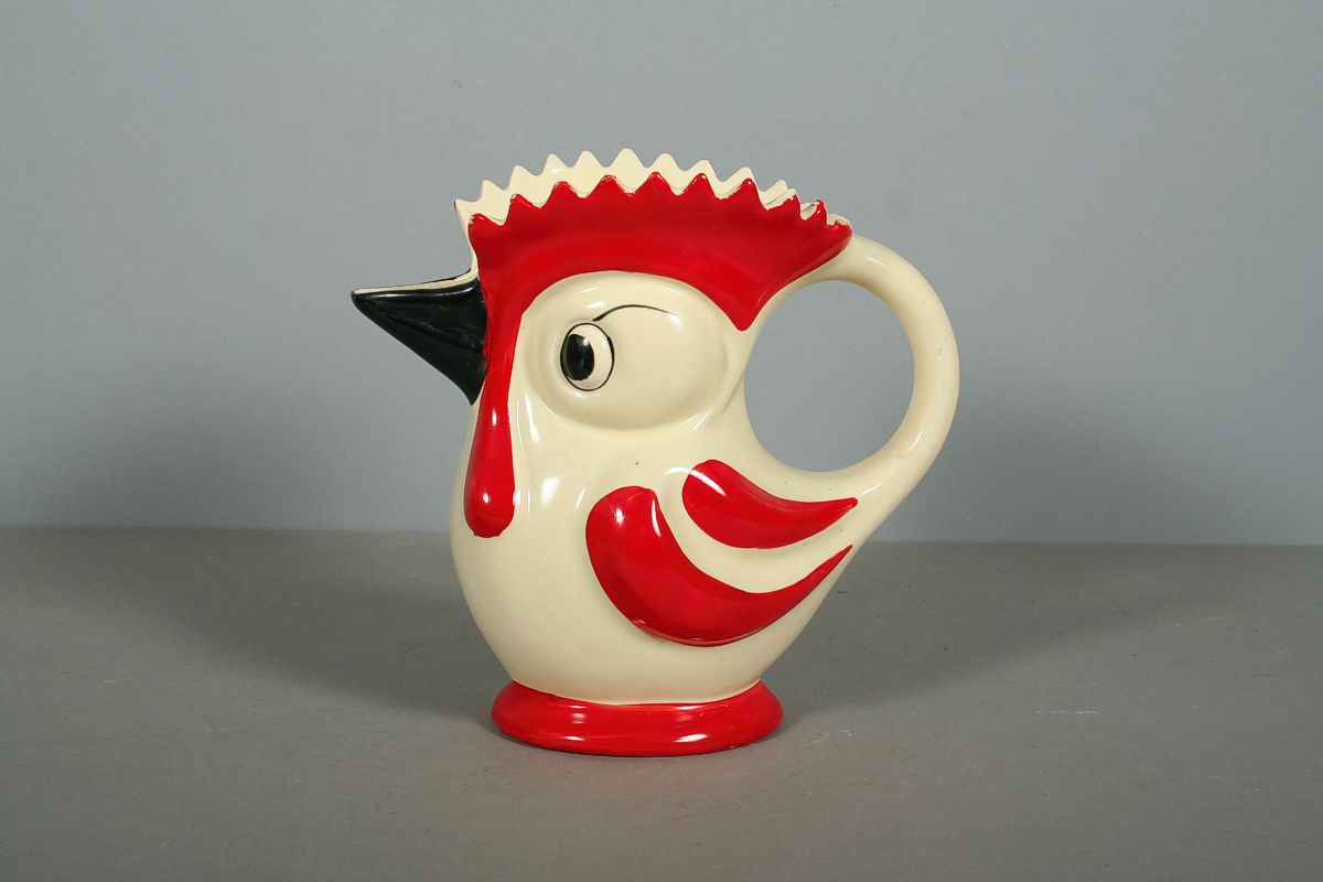 velká konvička nebo džbánek tvaru kohouta, malovaná keramika ve stylu art deco, značený na dně tištěnou značkou Ditmar Urbach, 19 x 20 cm