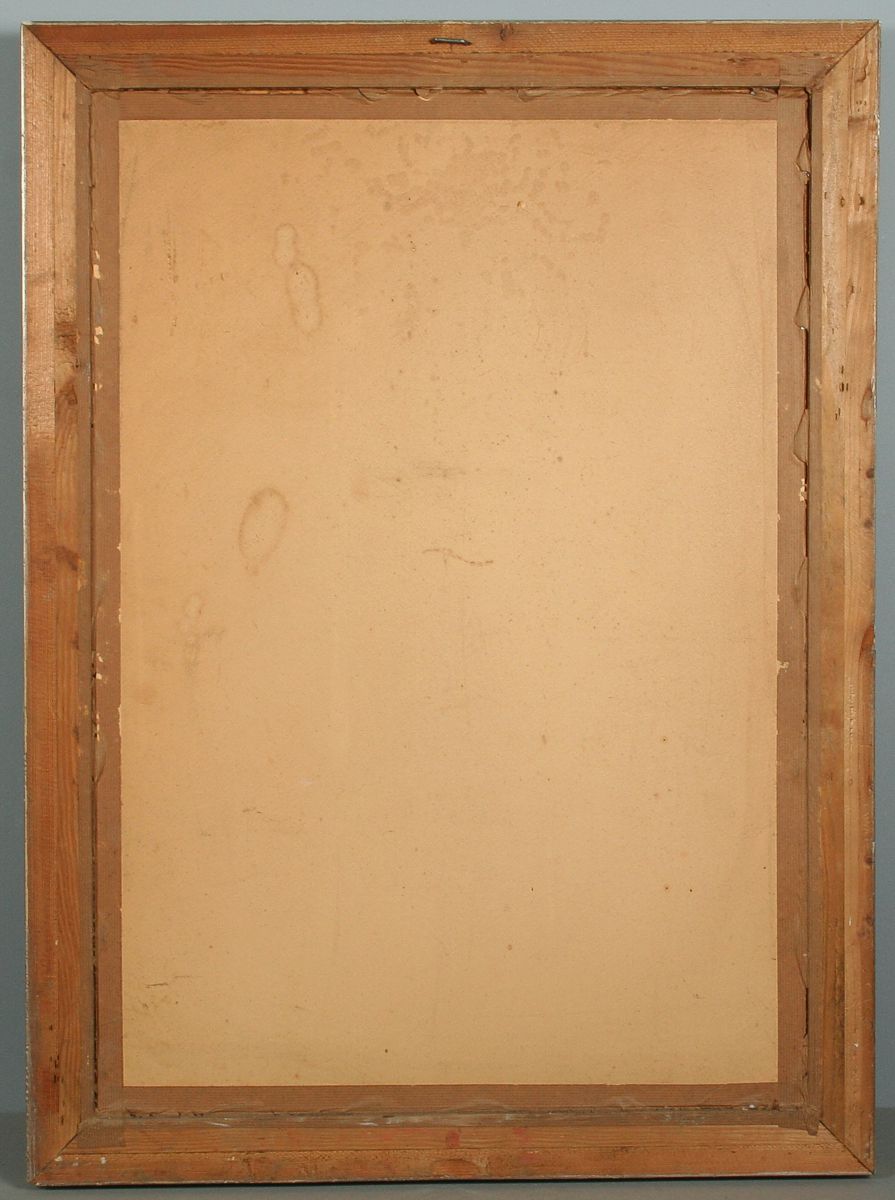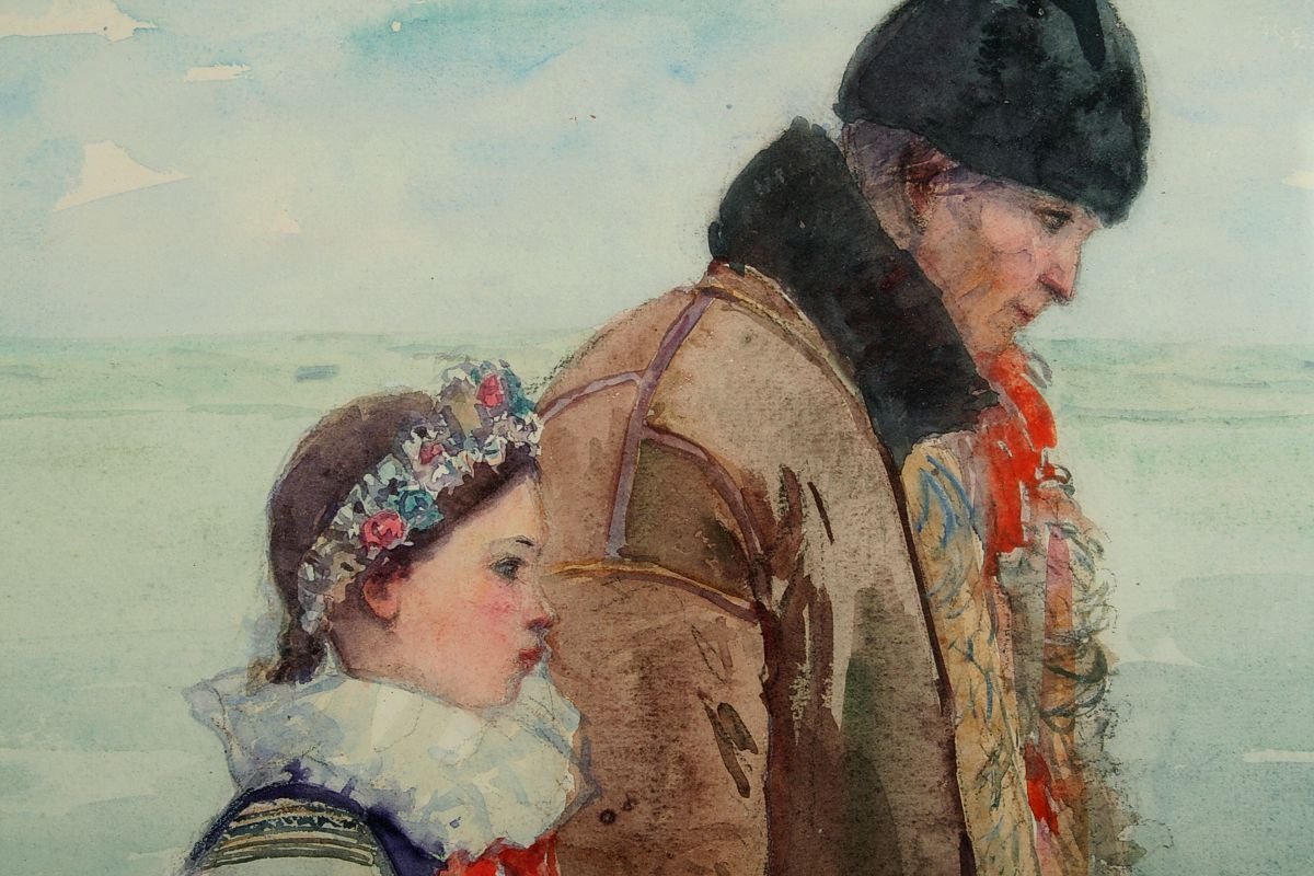 obraz dívky a děda v krajině v moravském lidovém kroji z Uherského ostroha, akvarel na papíře, 50 x 32 cm s rámem 76 x 56 cm, autor Vincent Plesnivý, podepsáno vpravo dole Plesnivý okr. Uh. Ostroh, rámováno v původním rámu pod sklem
