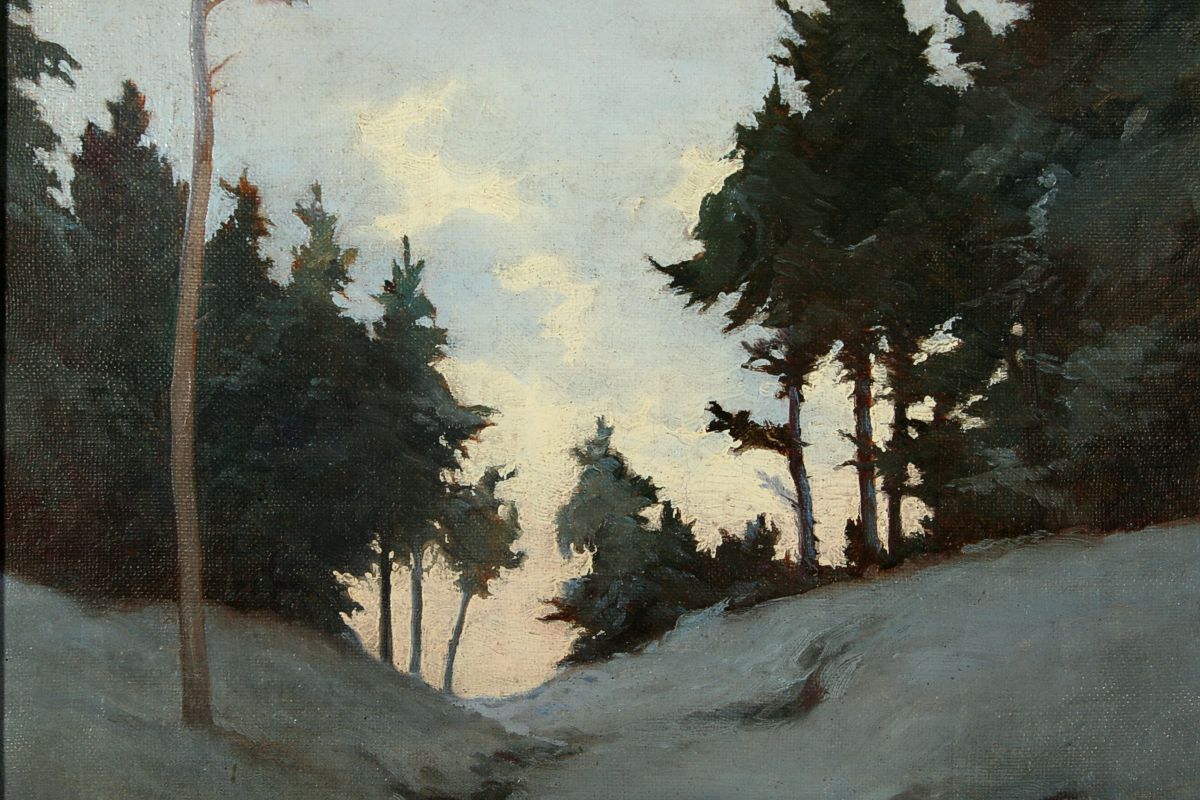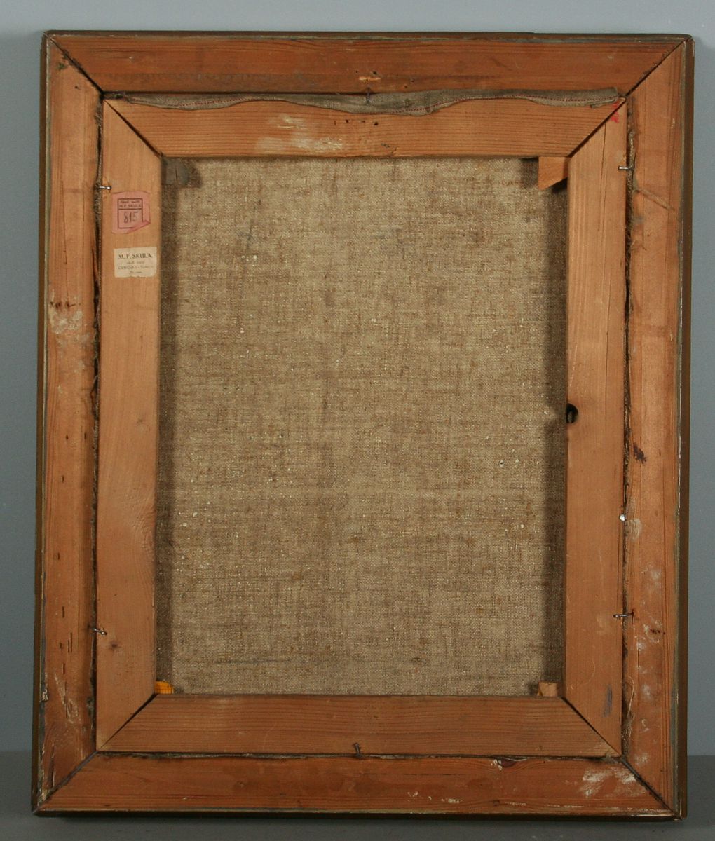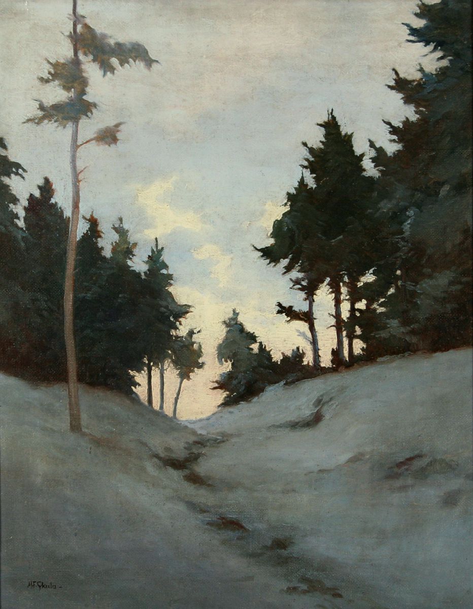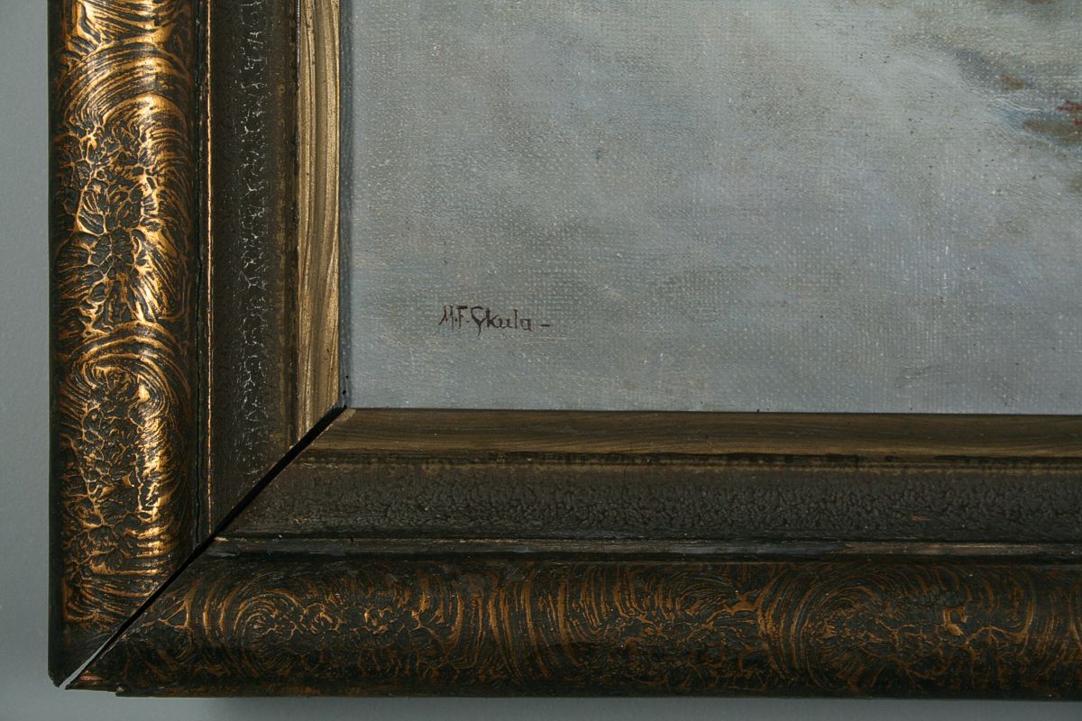 obraz zimní krajiny za soumraku, olej na plátně, 49 x 38 cm s rámem 62 x 51 cm, autor Matěj František Skula, podepsáno vlevo dole M. F. Skula, na zadní straně autorské štítky, rámováno v původním rámu