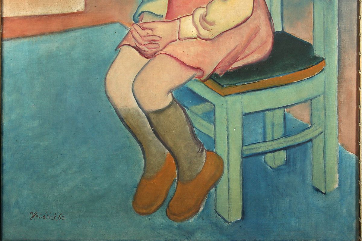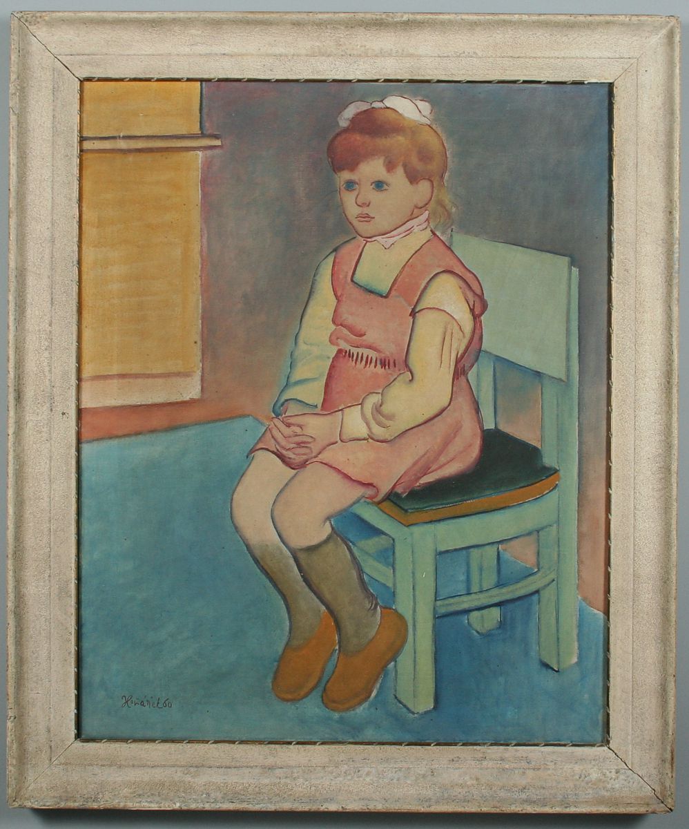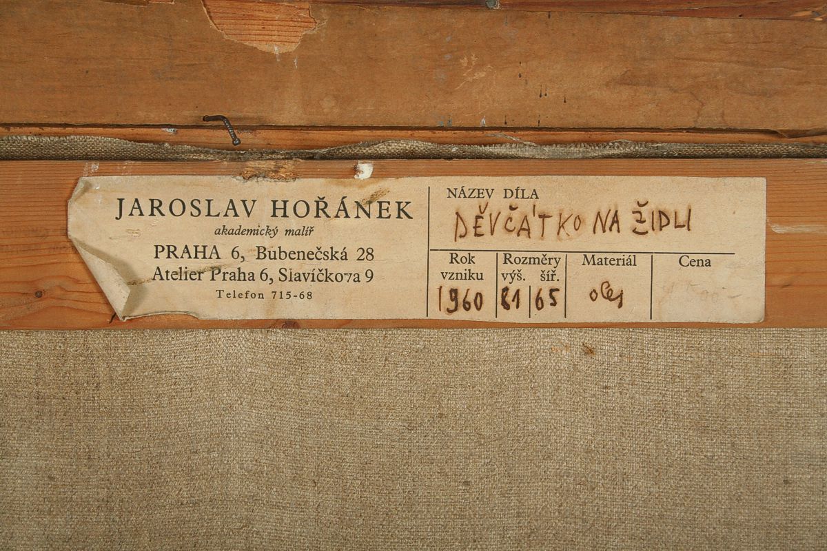 obraz děvčátka sedící na židli, olej na plátně, 81 x 65 cm s rámem 97 x 81 cm, autor Jaroslav Hořánek, podepsáno vlevo dole Hořánek 60, na zadní straně autorský štítek, rámováno v původním rámu