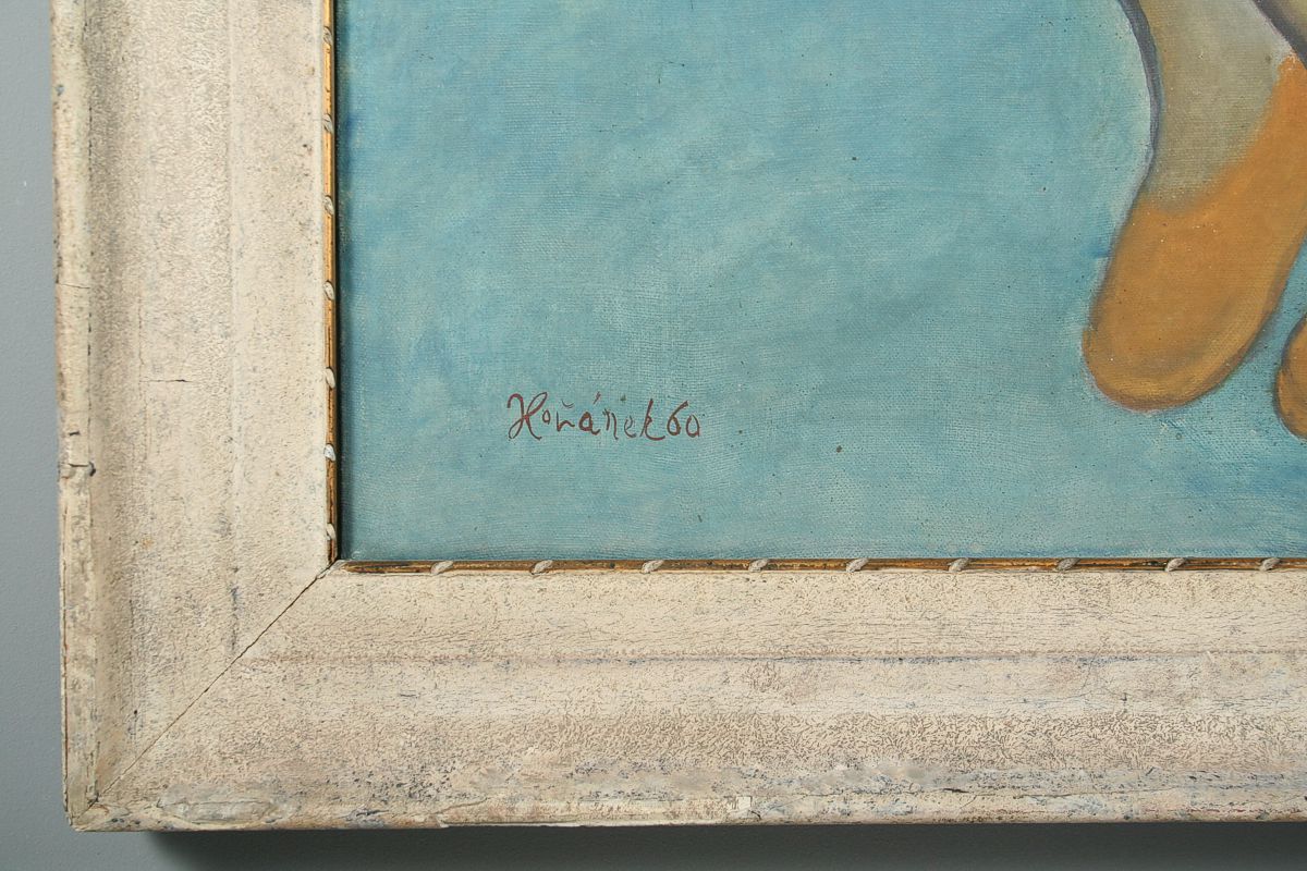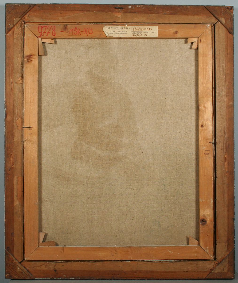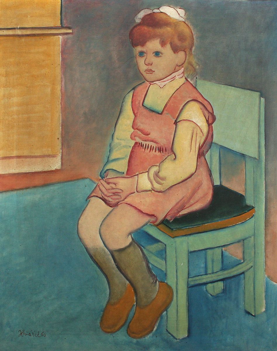 obraz děvčátka sedící na židli, olej na plátně, 81 x 65 cm s rámem 97 x 81 cm, autor Jaroslav Hořánek, podepsáno vlevo dole Hořánek 60, na zadní straně autorský štítek, rámováno v původním rámu