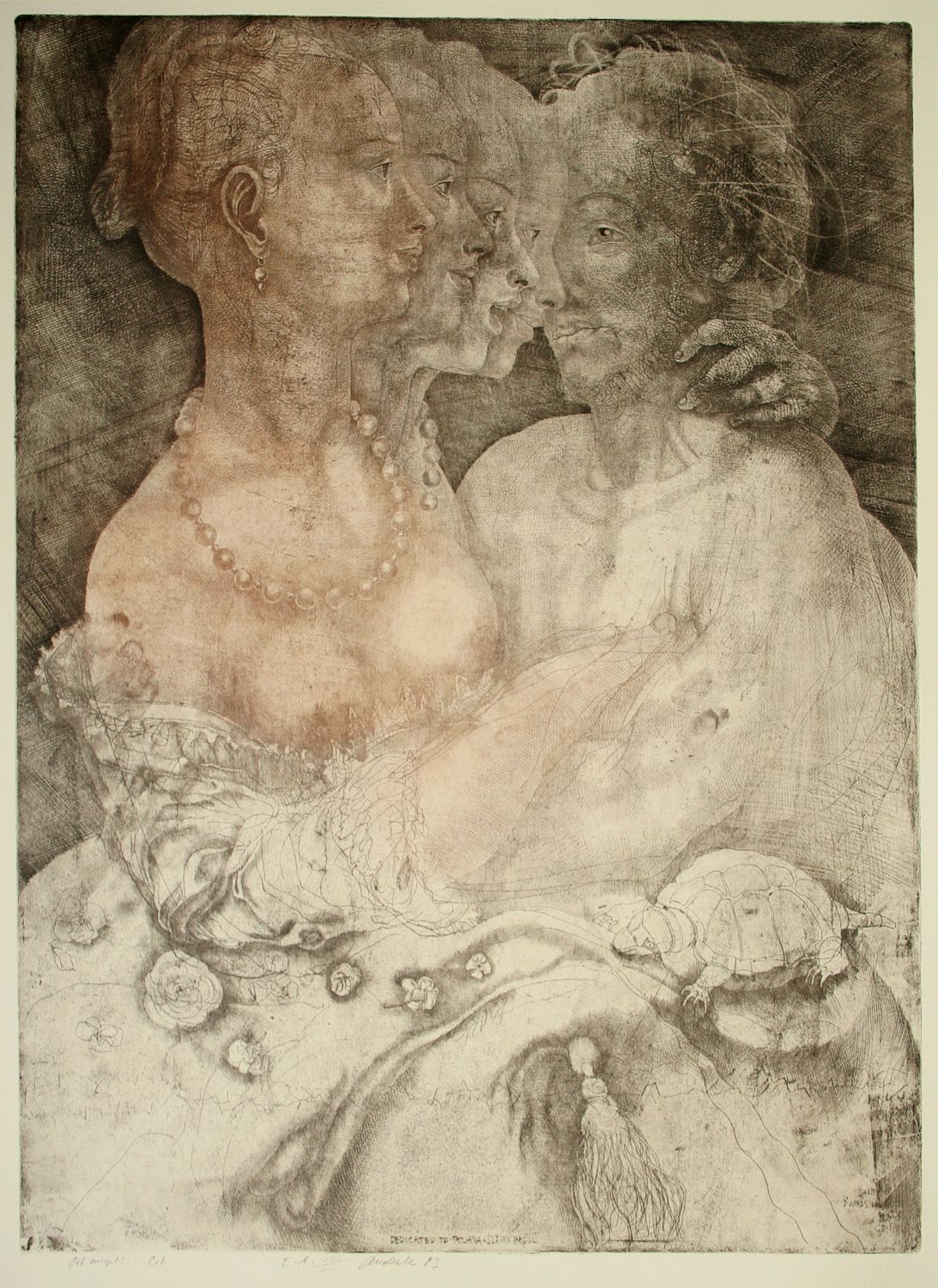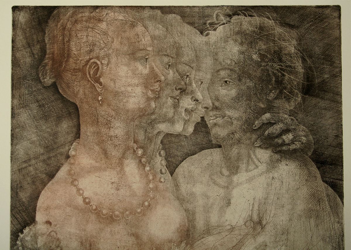 velká originální původní grafika z 80. let, pět smyslů: Cit  z cyklu dialogy se starými mistry, autor Jiří Anderle, ruční papír s vodotiskem HOLLAND, 82 x 64,5 cm, rozměr tiskové plochy 66,5 x 50 cm, barevný lept suchá jehla mezotinta, podepsáno vlastní rukou tužkou Anderle 83 a přípis, volný list, zcela původní a originální práce světově známého autora pocházející od sběratele jež se osobně přátelil s autorem