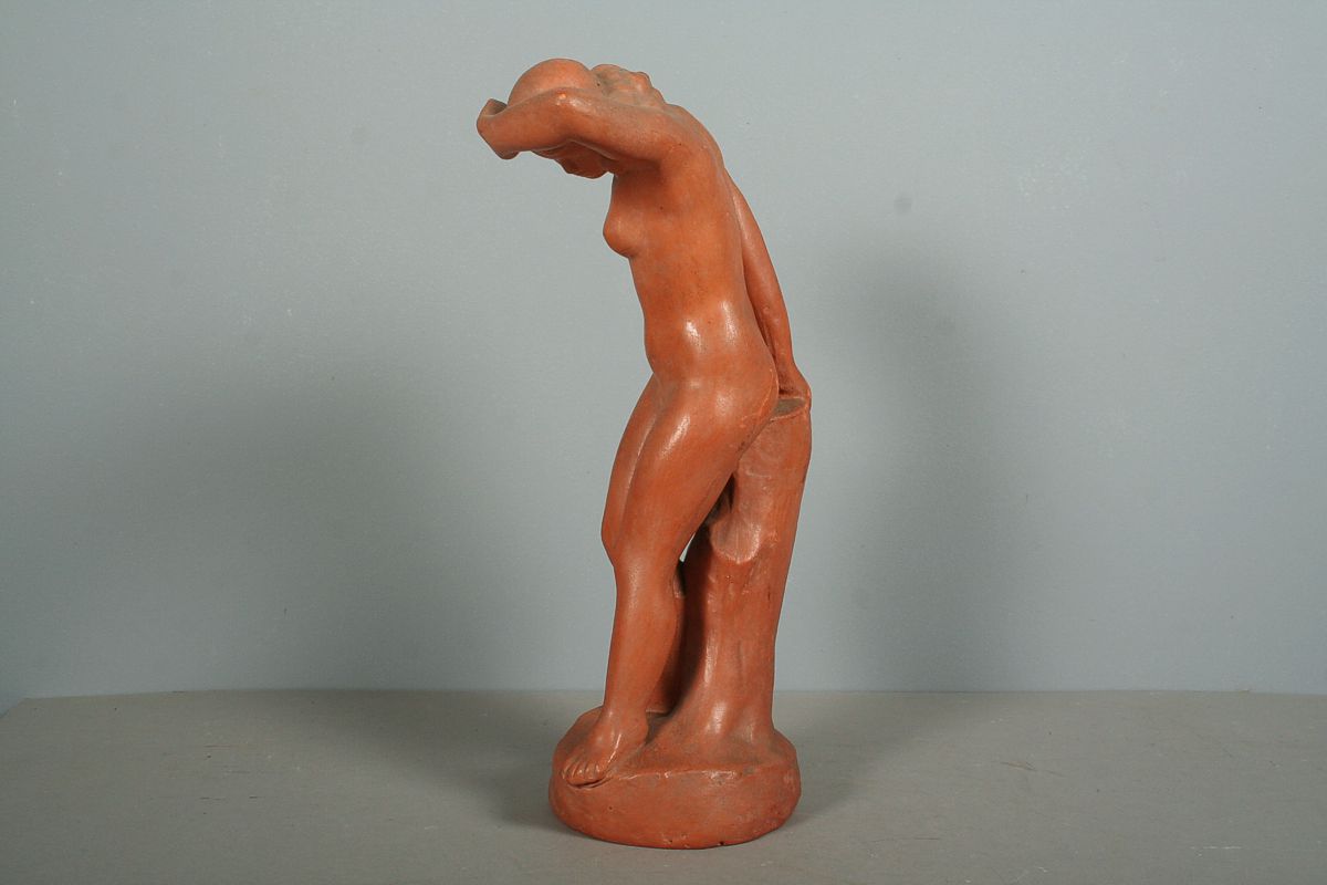 socha dívčího aktu, pálená keramika terakota 33 cm, autor neznámý, značeno naspodu čísly, 1. polovina 20. století