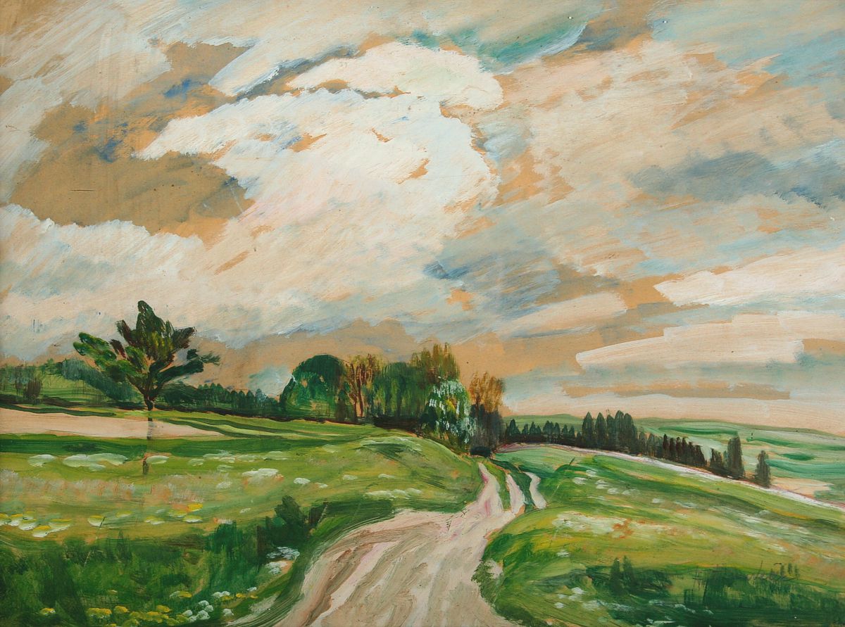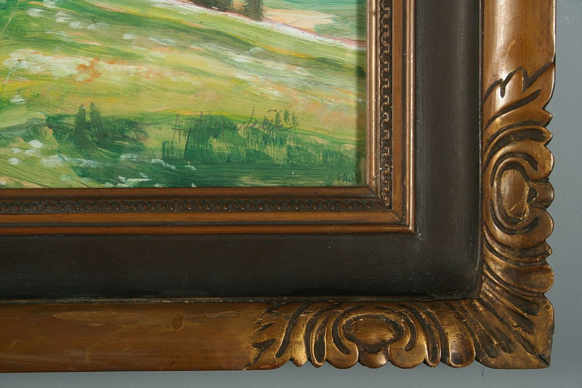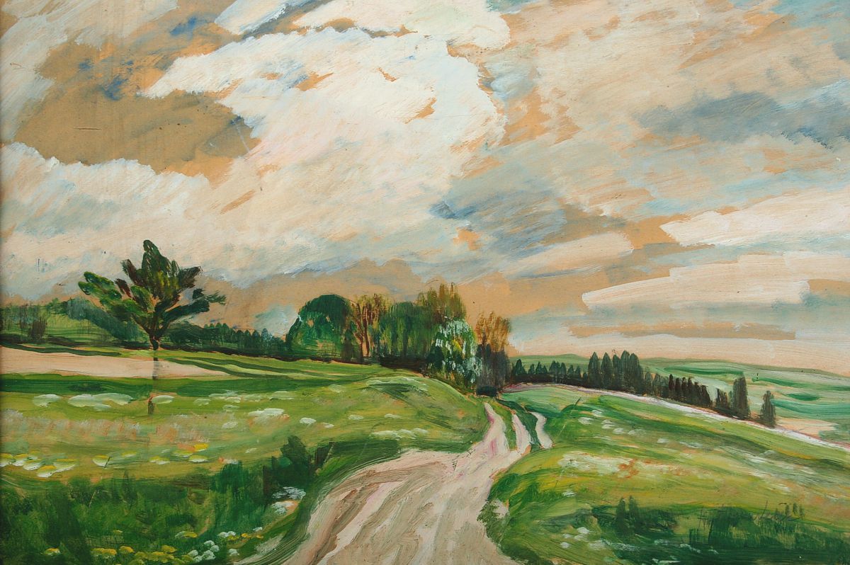 obraz letní krajiny s cestou, olej tempera kvaš na lepence, 31 x 44 cm s rámem 46 x 58 cm, autor Antonín Hudeček, podepsáno vpravo dole Ant. Hudeček, rámováno v původním zdobeném rámu
