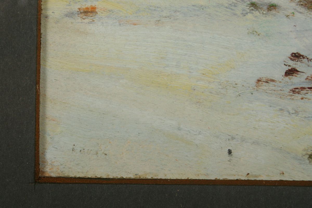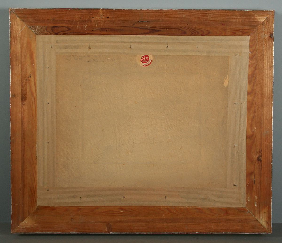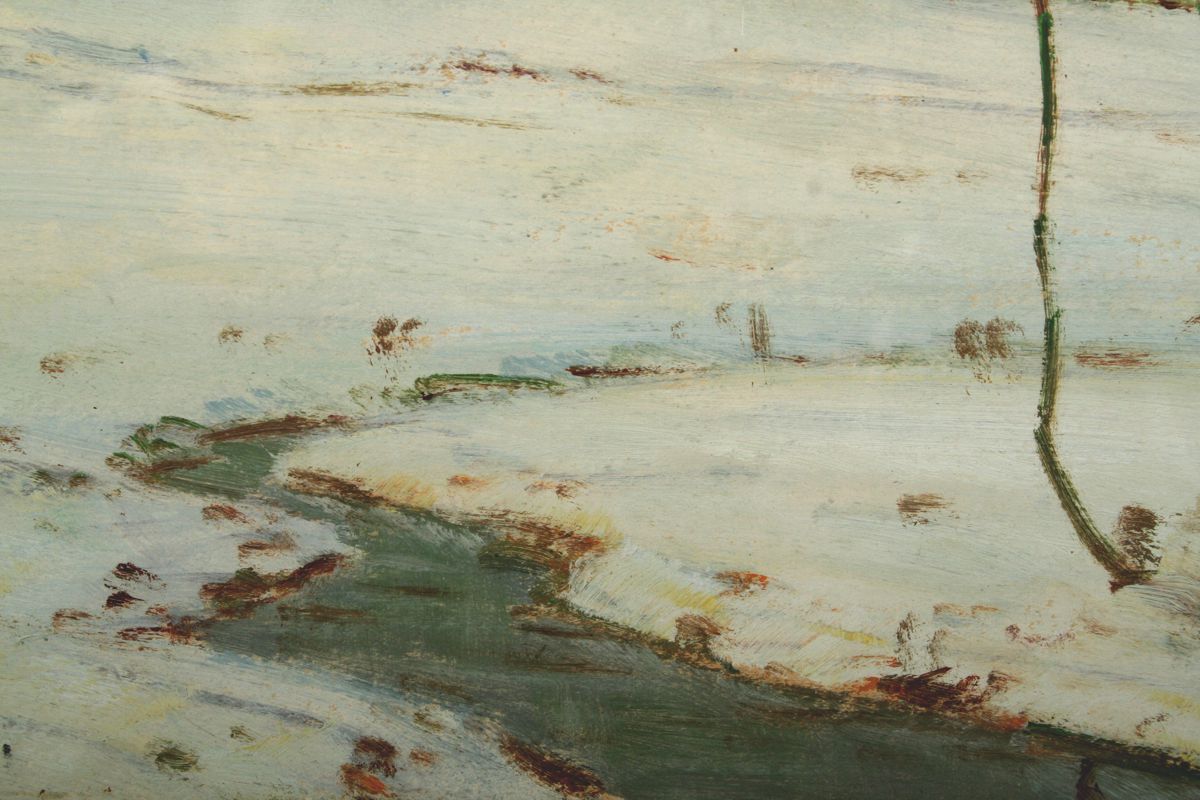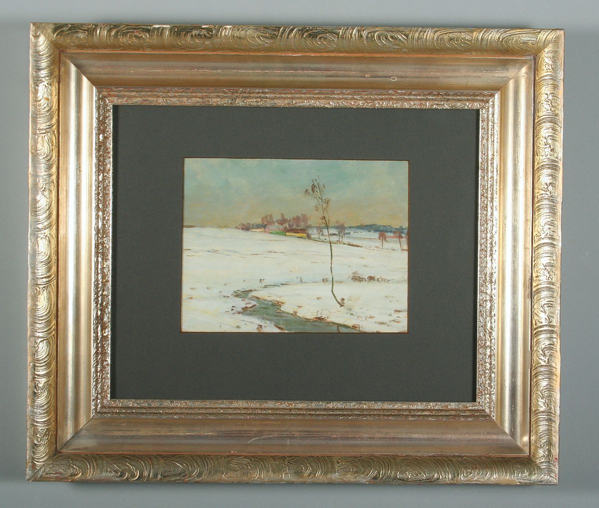 obraz zimní krajiny s potůčkem z okolí Vítanova, olej na kartonu, 23 x 30 cm s rámem 59 x 68 cm, autor František Kaván, podepsáno v malbě v levo dole Kaván, konzultováno a určeno s datací kolem roku 1915 z okolí Vítanova PhDr. Michalem Zachařem, rámováno v původní paspartě a rámu pod sklem