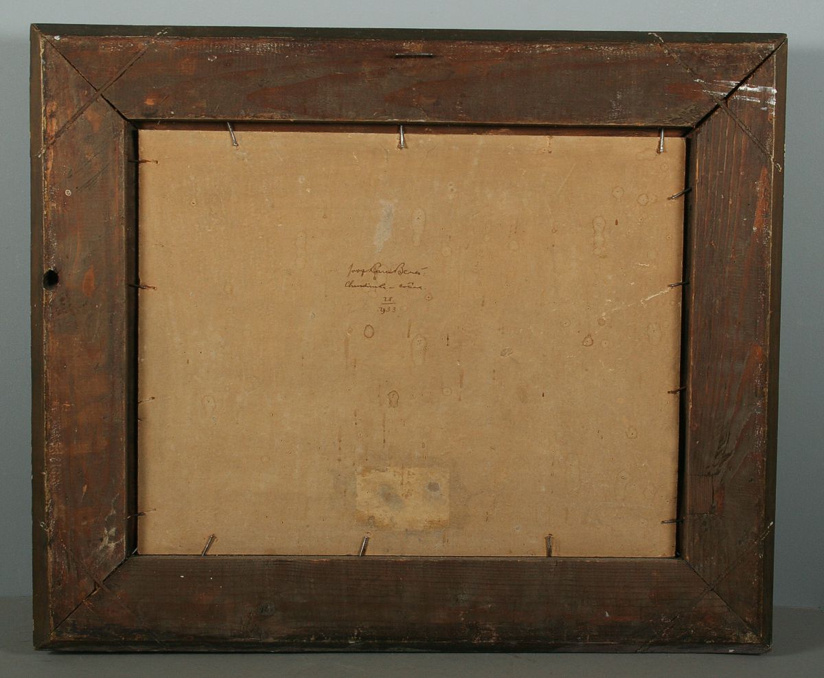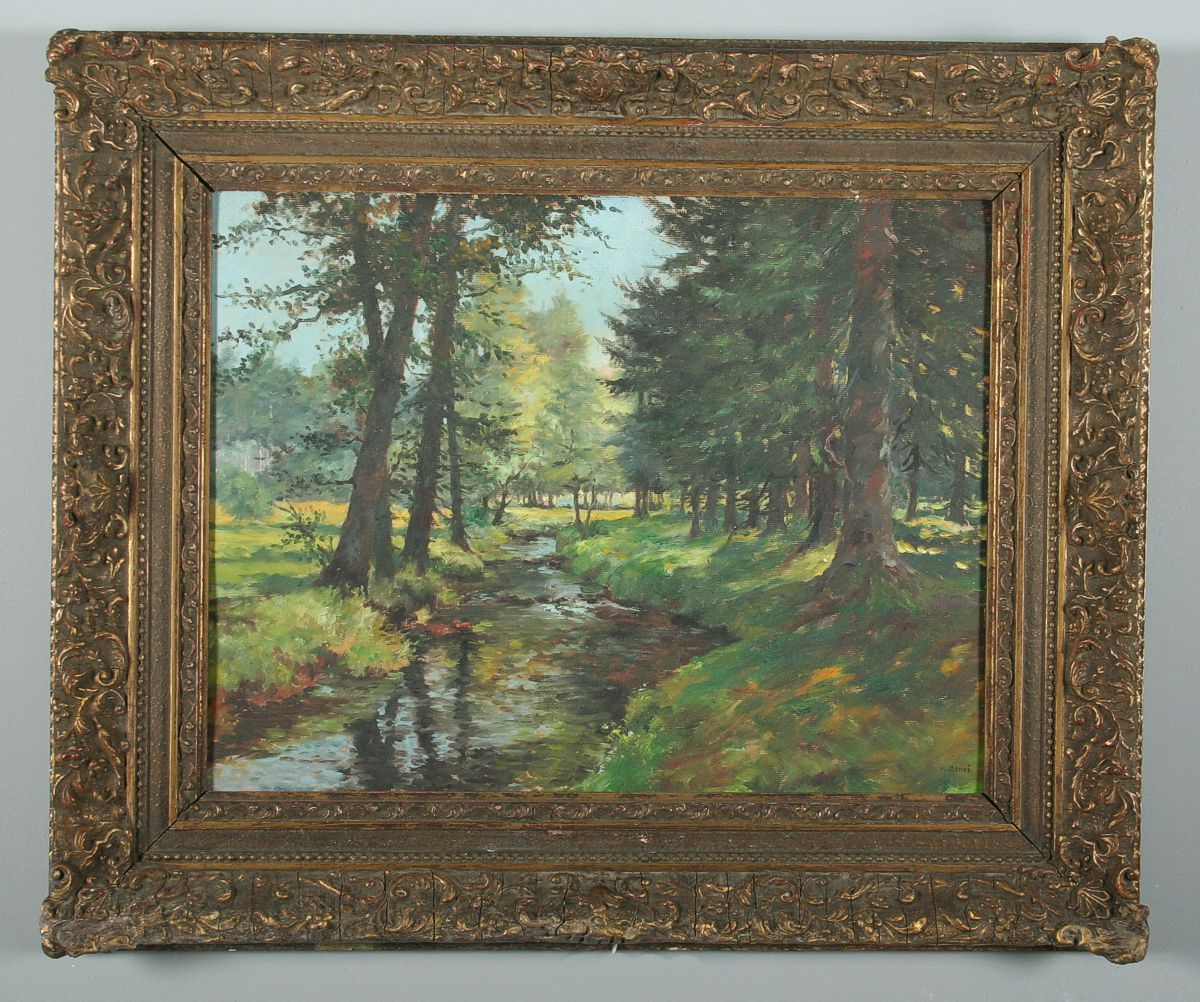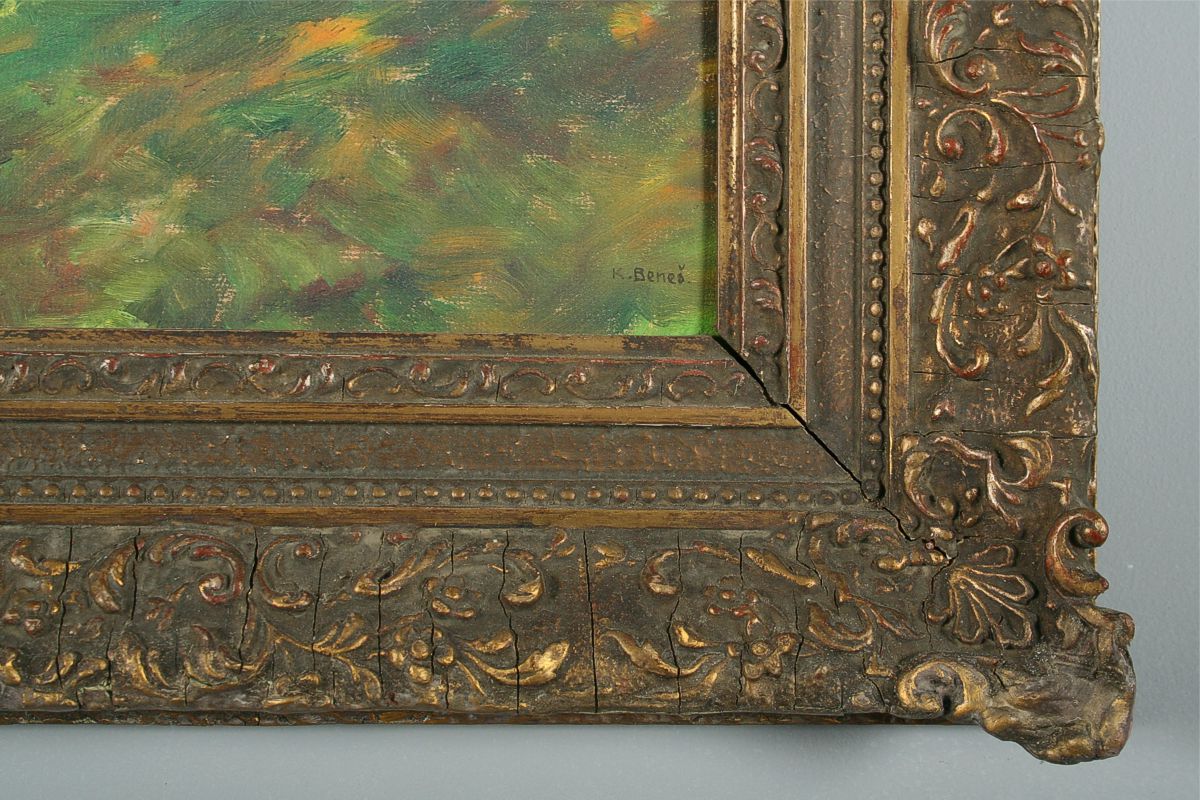 obraz protékající říčky Chrudimky letní krajinou u Ovčína, olej na kartonu, 33 x 43 cm s rámem 51 x 61 cm, autor Karel Beneš, podepsáno vlevo dole K. Beneš na zadní straně autorský přípis, rámováno ve zdobeném rámu