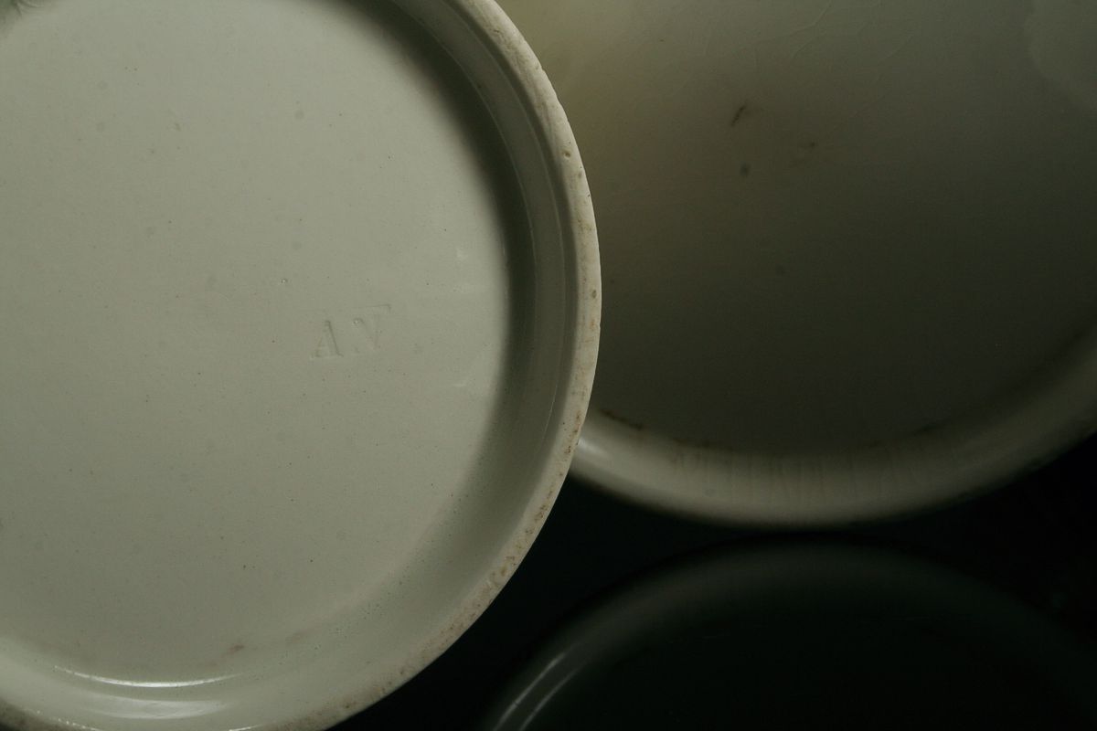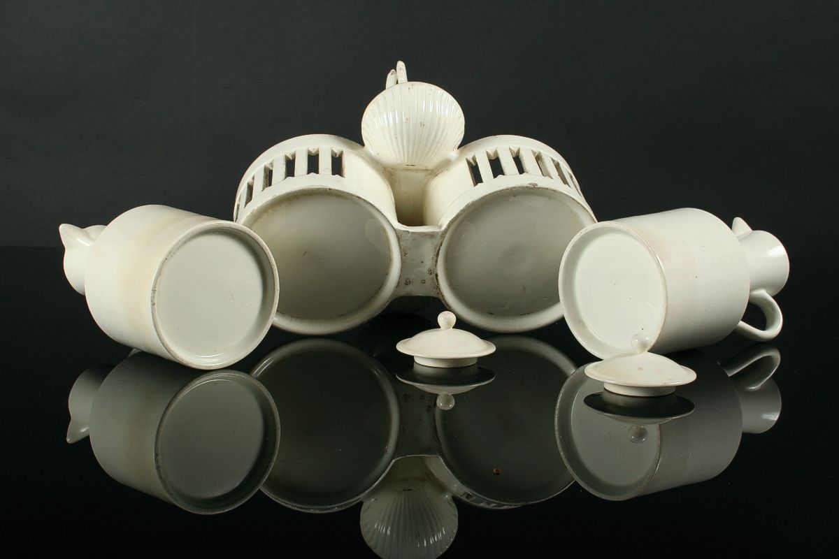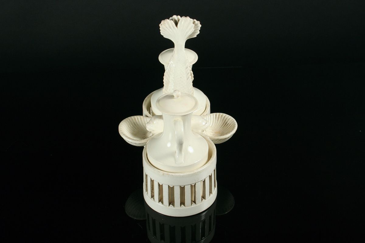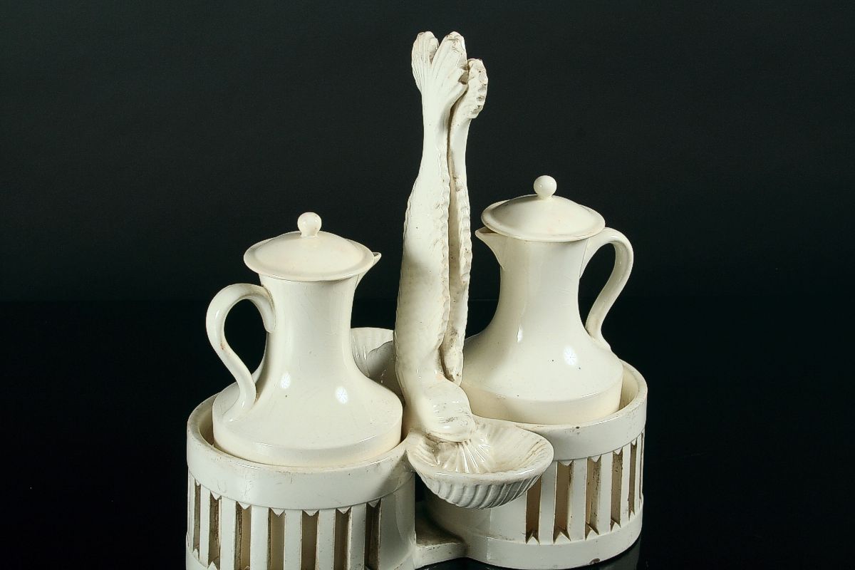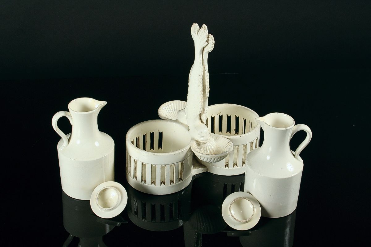 stolní souprava, úchyt ve tvaru dvou ryb držících v ústech slánky tvaru mušle s košíky na ocet a olej, bílá glazovaná keramika z 1. poloviny 19. století (kolem 1830), na dně značeno tlačenou značkou A N, A. Nowotny Stará role, 24 x 22 cm