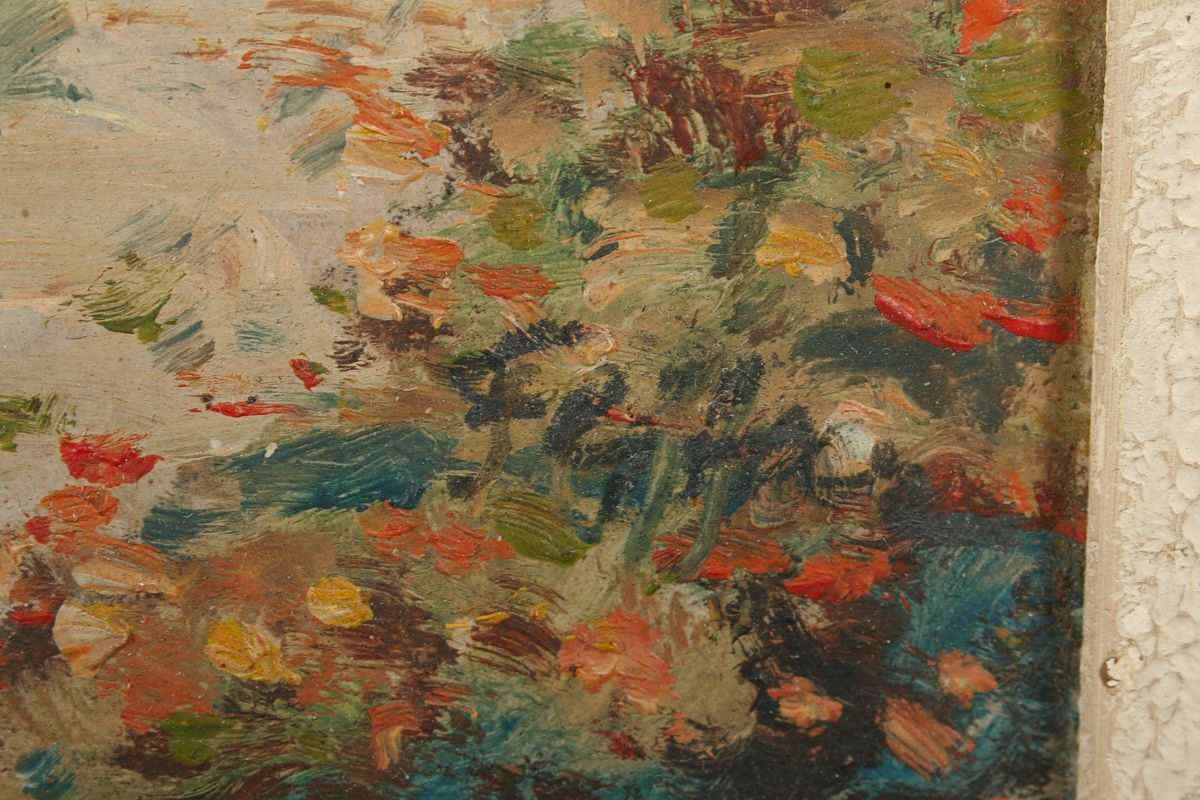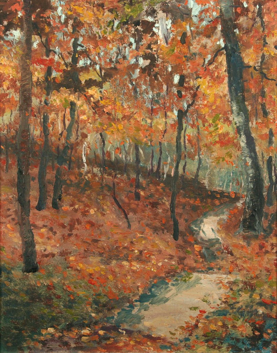 obraz podzimní krajiny v listnatém parku, olej na kartonu, 26 x 20 cm s rámem 45 x 40 cm, autor Stanislav Feikl, maloval pod silným vlivem A. Slavíčka, což tento obraz jen dokládá, podepsáno vpravo dole Feikl, rámováno v původním stříbřeném rámu