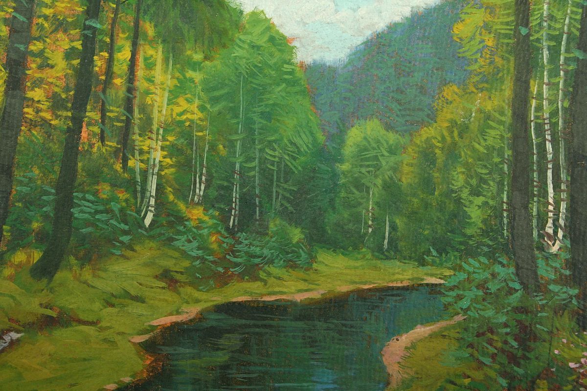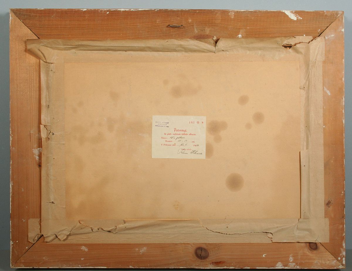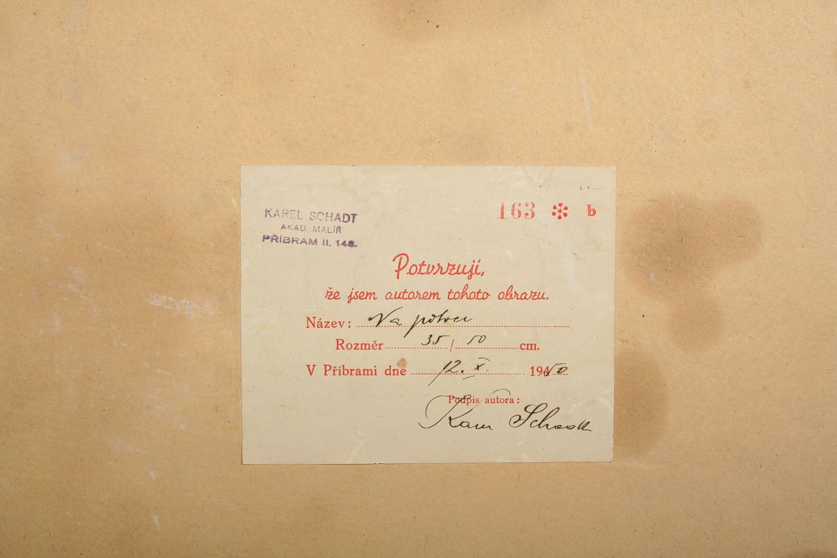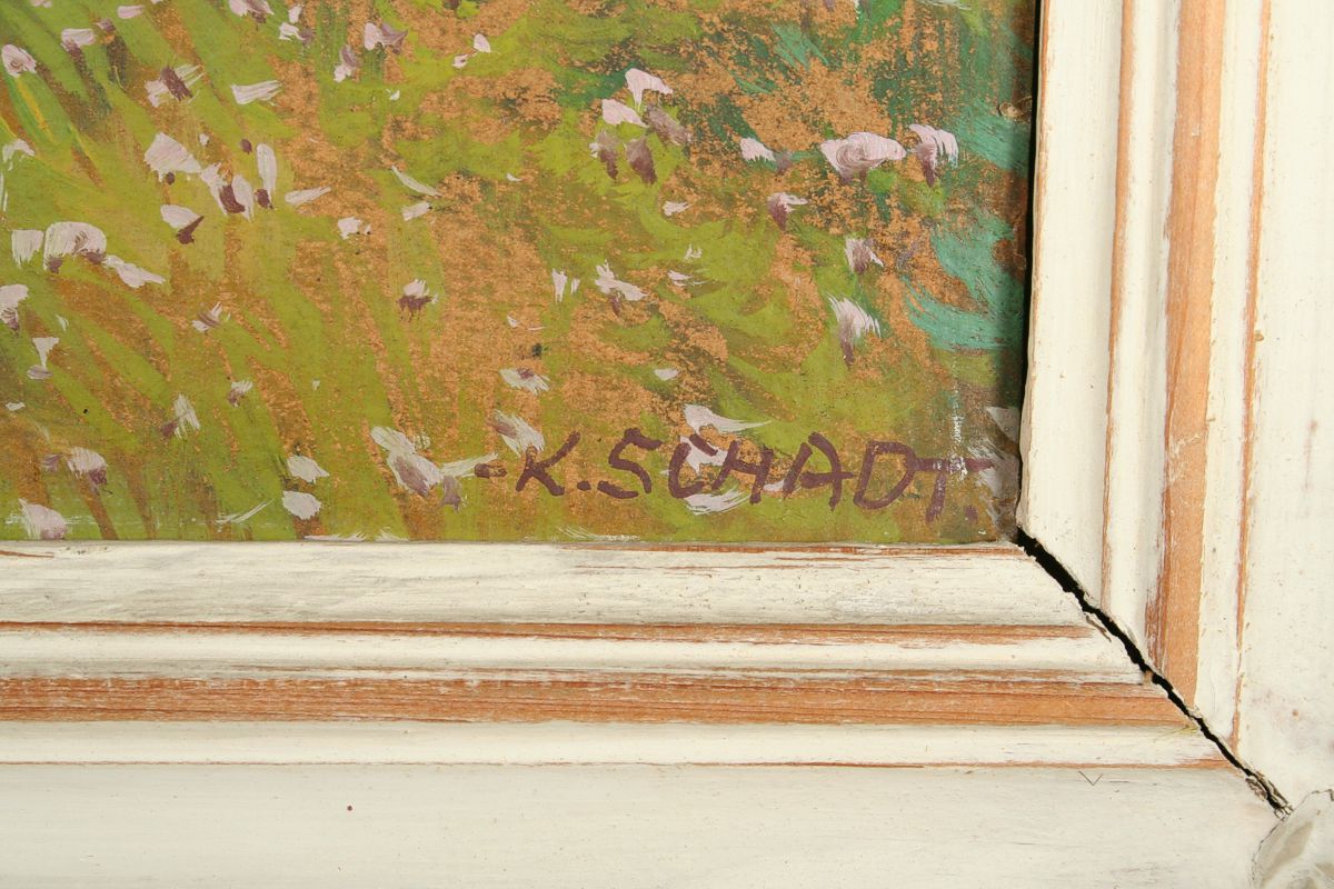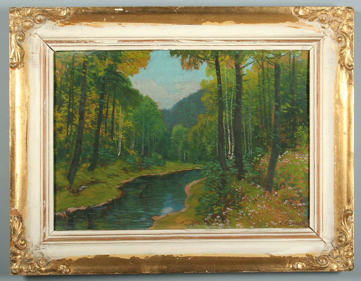 obraz letní krajiny s říčkou, olej na kartonu, 34 x 48 cm s rámem 50 x 64 cm, autor Karel Schadt, podepsáno vpravo dole K. Schadt, vzadu autorský štítek s dedikací, rámováno v původním zdobeném rámu