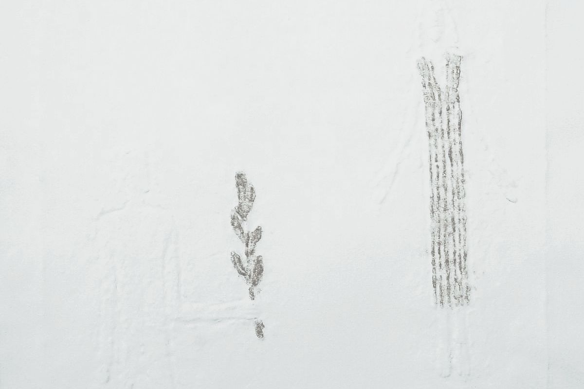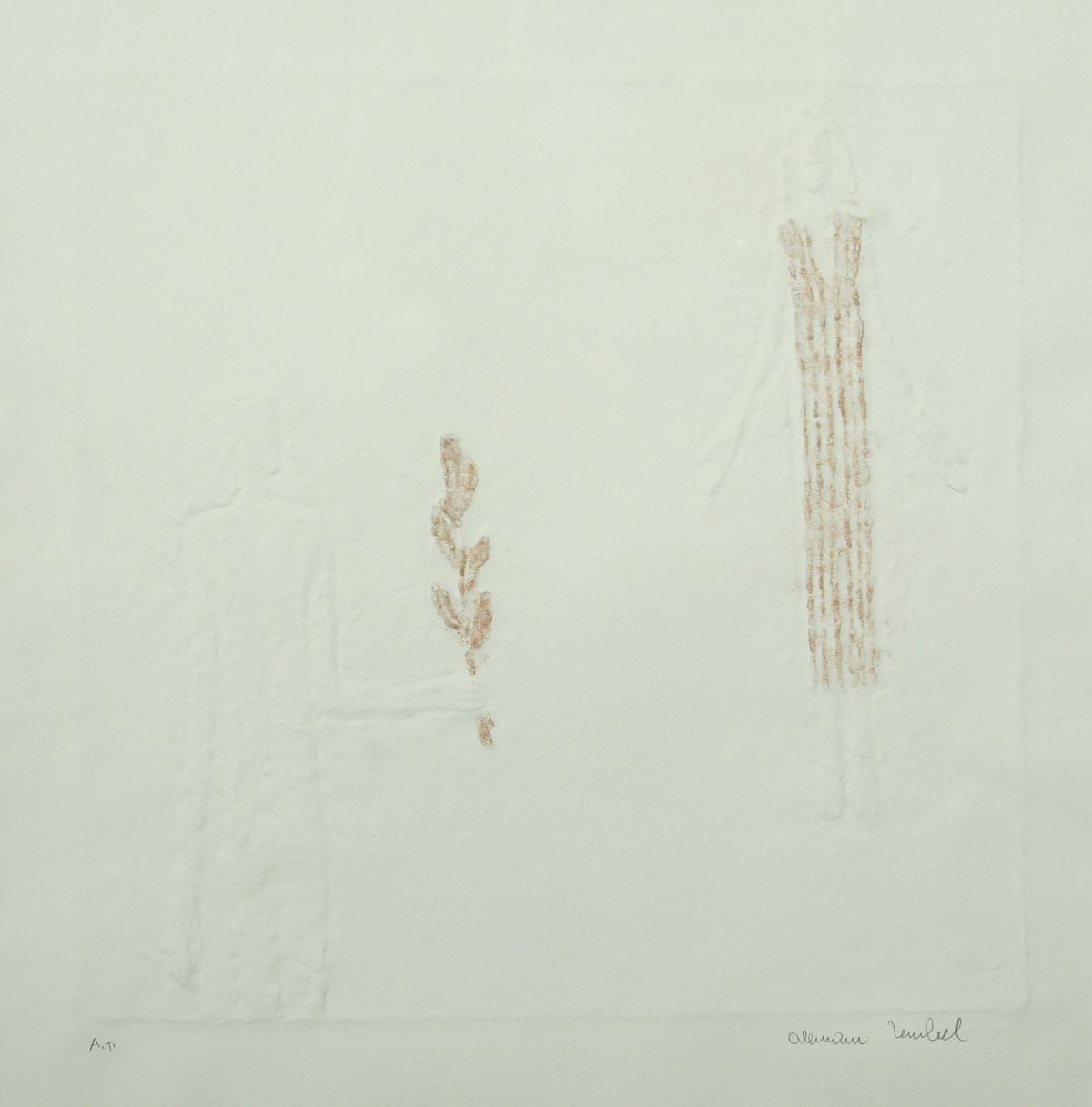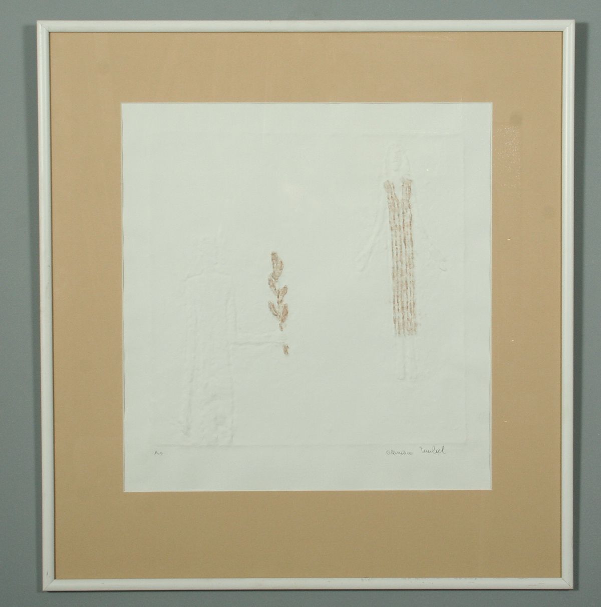 Marie a Josef s ratolestí 1996, zlacený slepotisk na papíře, výřez pasparty 42 x 40 cm s rámem 62 x 58 cm, autor Olbram Zoubek, podepsáno vpravo dole Olbram Zoubek, na zadní straně listu přípis Marie a Josef s ratolestí r. 1996, rámováno v paspartě a rámu pod sklem