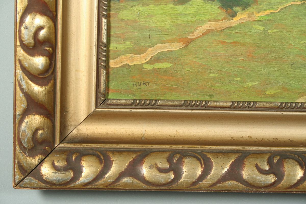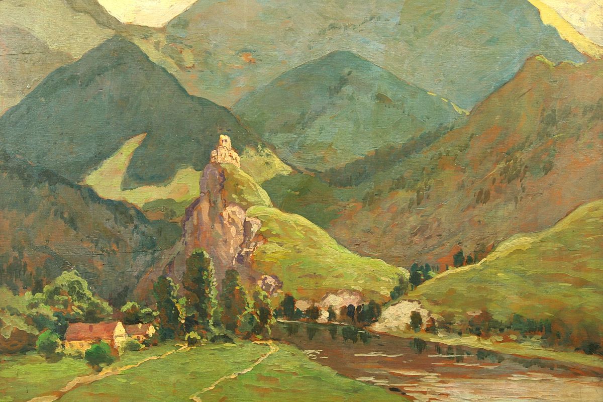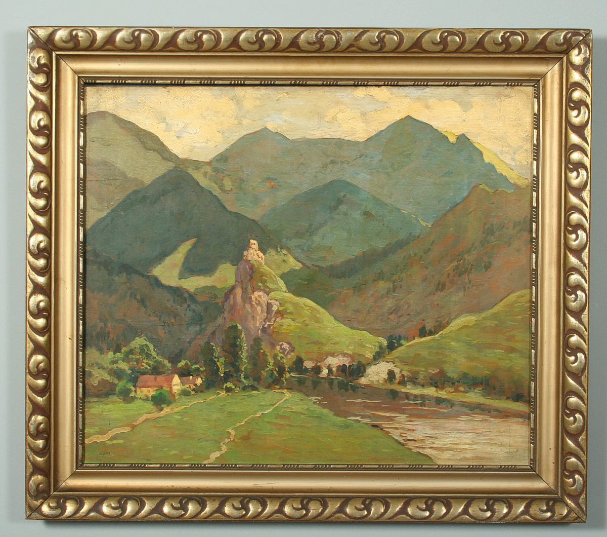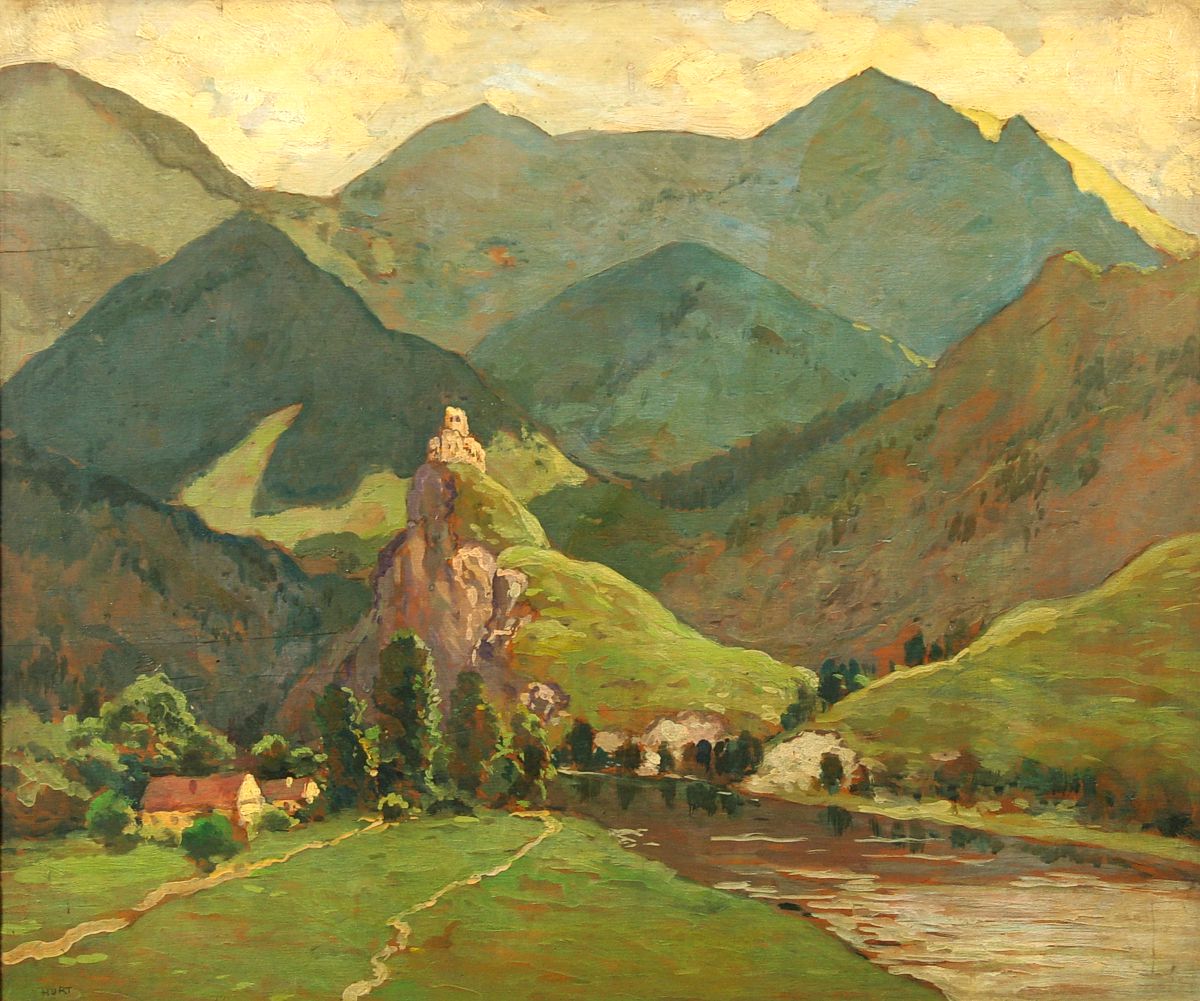 obraz slovenské krajiny s hradem Strečno nad řekou Váh, olej na dřevěné desce, 50 x 60 cm, s rámem 65 x 73 cm, autor Josef Hurt, podepsáno vlevo dole HURT, vzadu přípis tužkou hrad Strečno, rámováno v původním stříbřeném rámu
