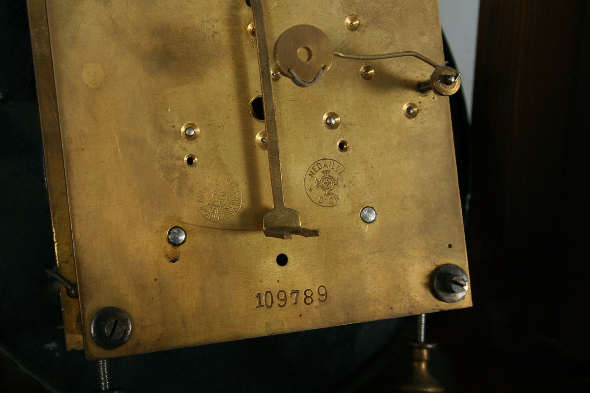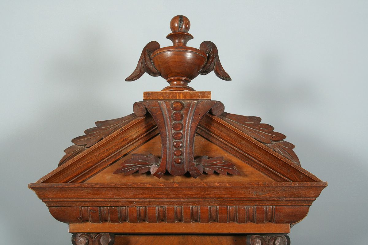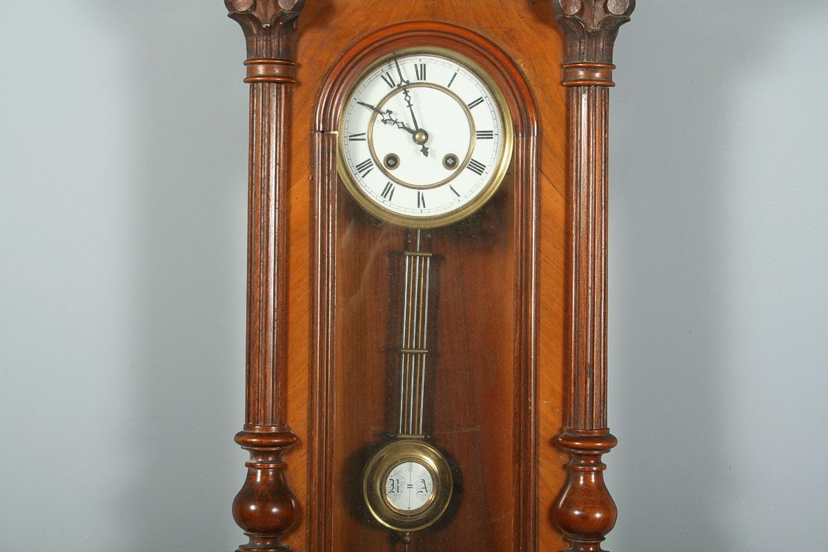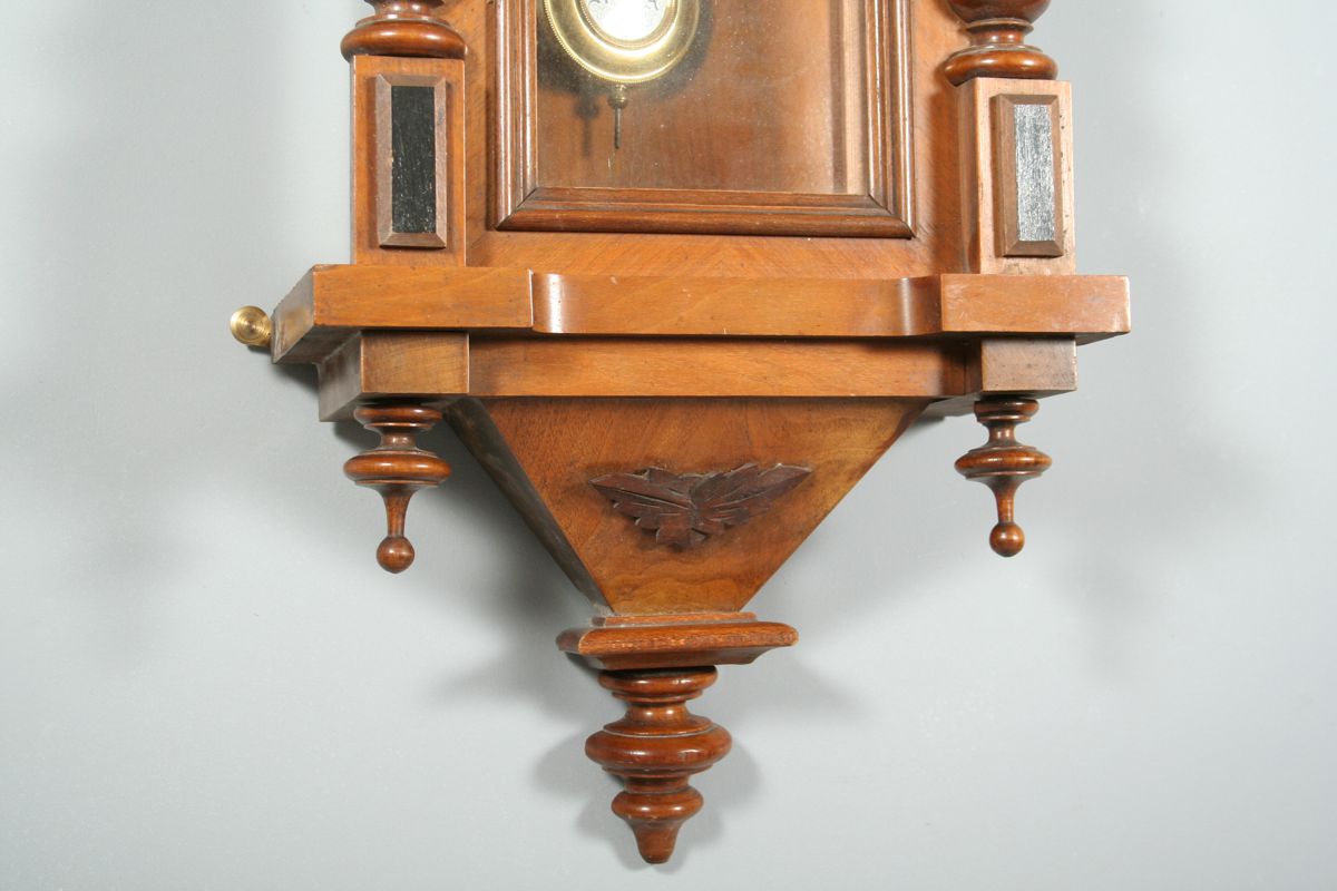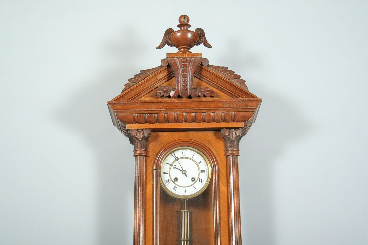 závěsné hodiny v dřevěné vyřezávané skříni v pseudorenesančním stylu dýhované ořechem, v pěkném původním stavu včetně původní koruny z přelomu 19. a 20. století, ciferník smaltovaný, stroj pérový, značený Gustav Becker, půlové bití do gongové tyče, funkční s klíčkem, 100 x 42 cm