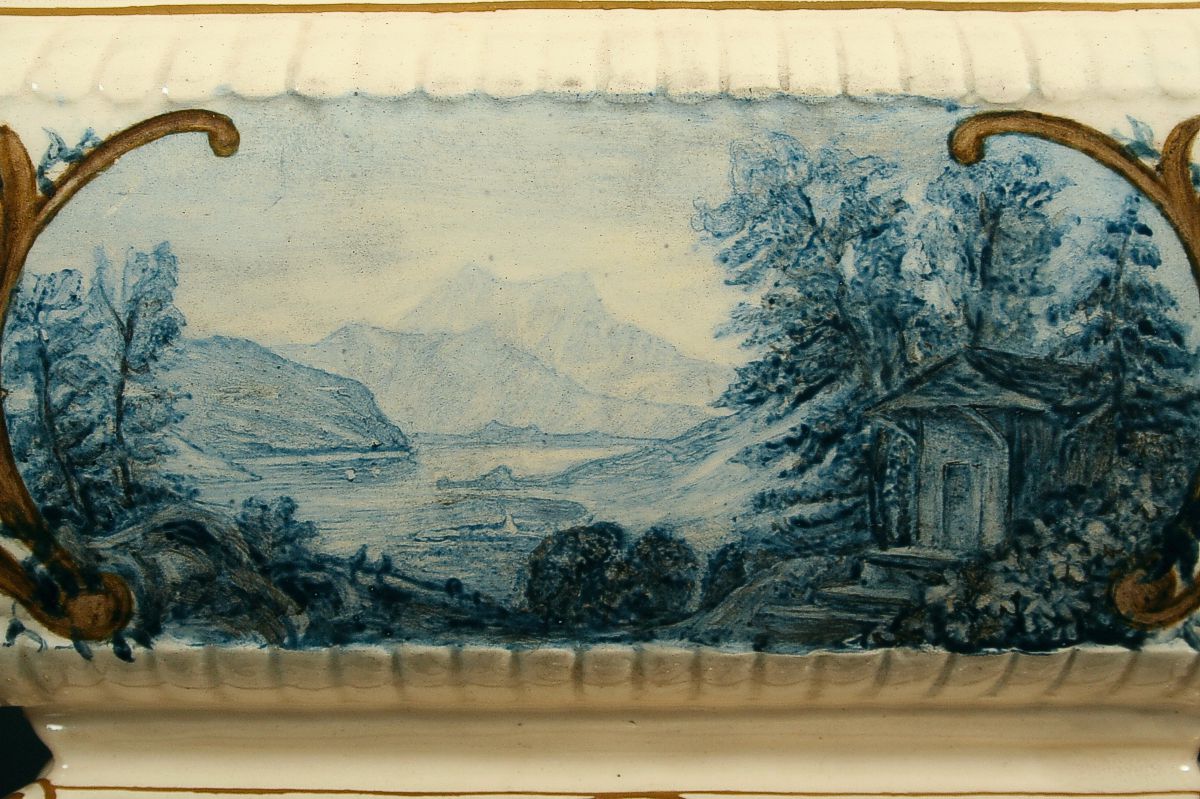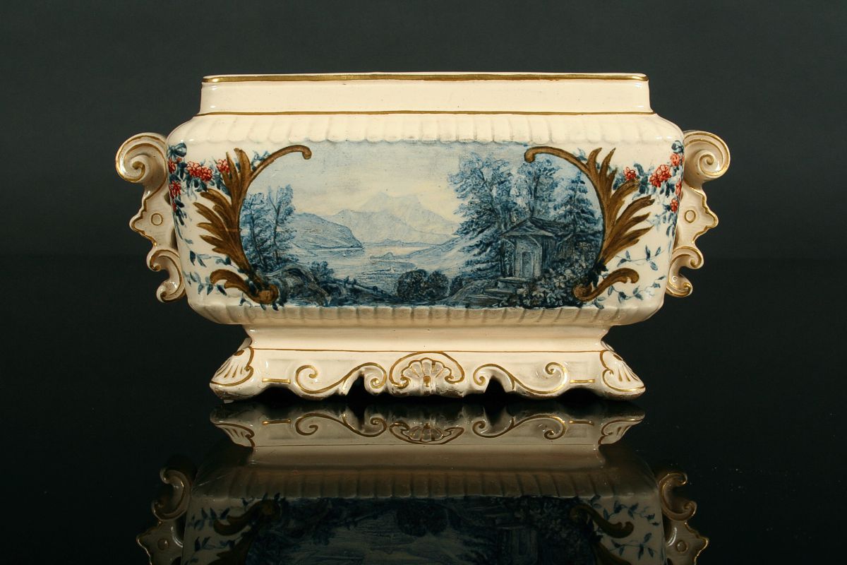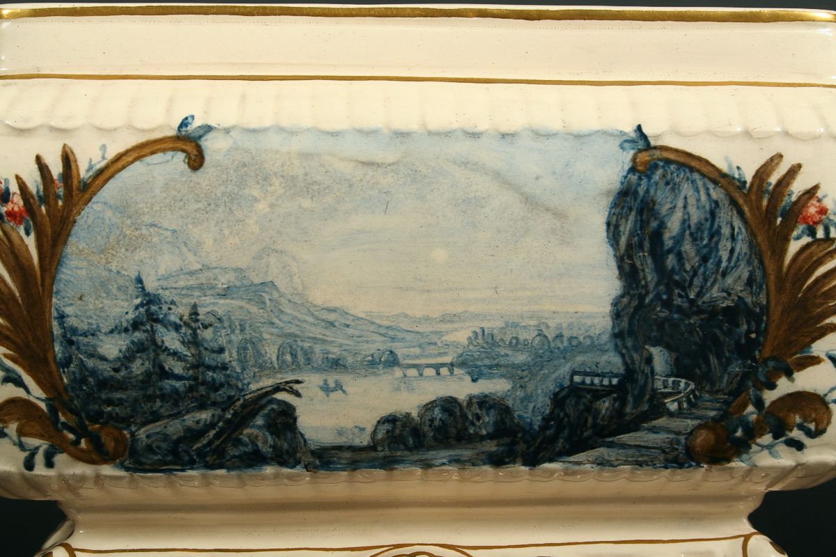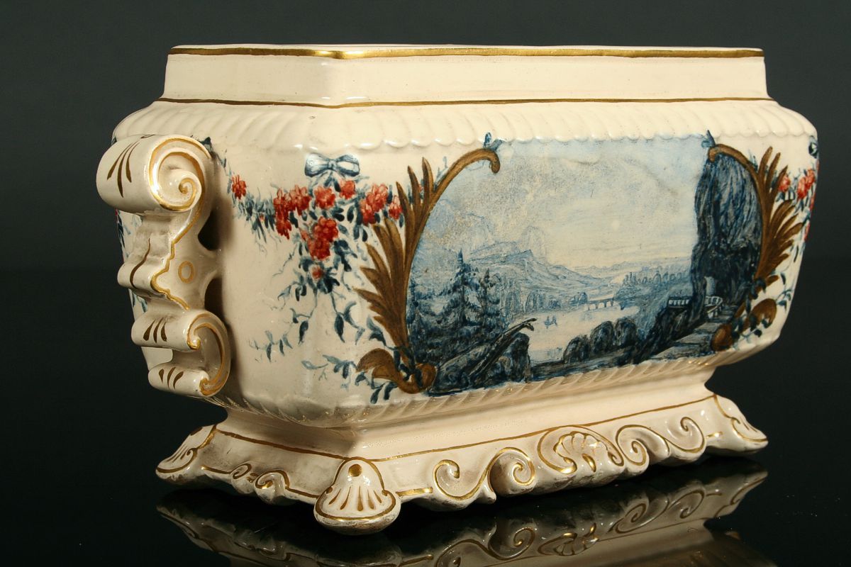 keramiká žardiniera na rokajovitém podstavci s úchyty na stranách, po obvodu ručně malováno zlatem a malbou se dvěmi vedutami, romantickýmy motivy krajiny, značeno na dně tlačenou značkou Schütz CILLI (Olomoučany), přelom 19. a 20. století, 12 x 24 x 10 cm