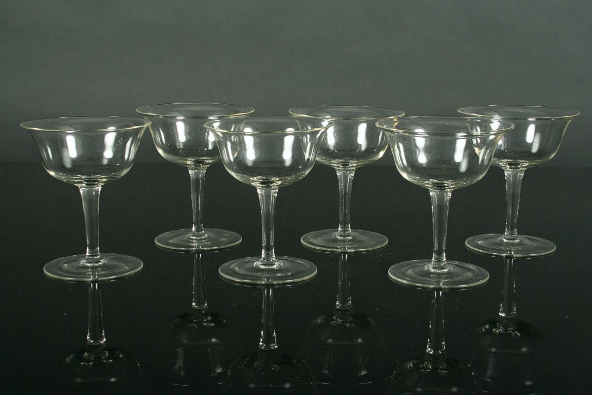 kompletní skleněný nápojový servis na aperitiv od známého autora českého designu Ladislava Sutnara, 6 x sklenice na aperitiv z bélého tenkého skla, bez poškození, 11 x 10 cm