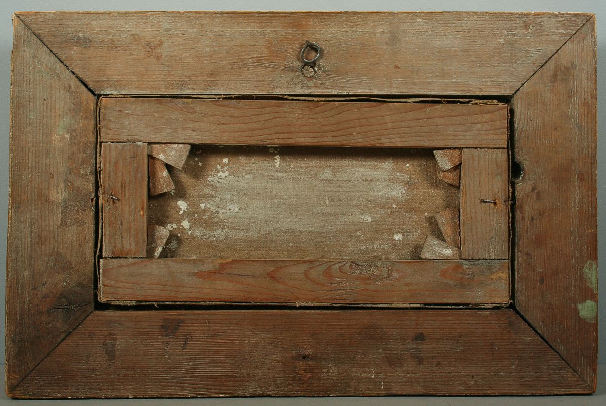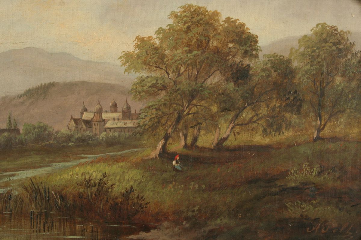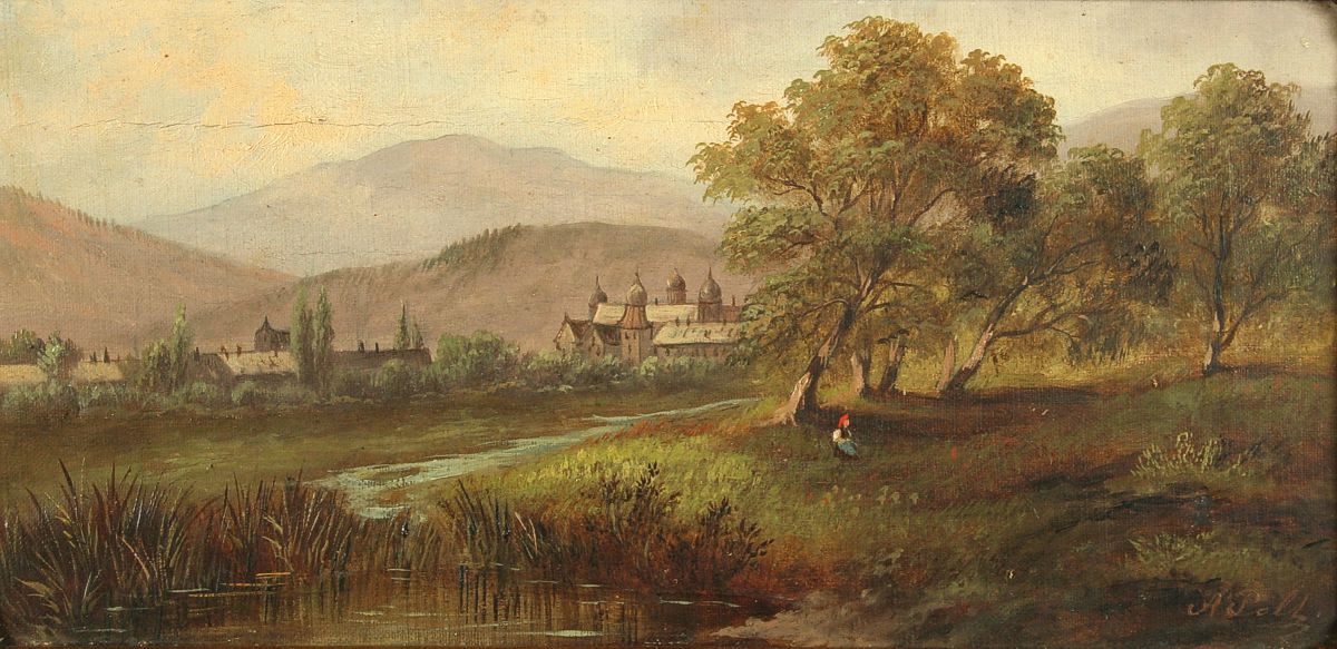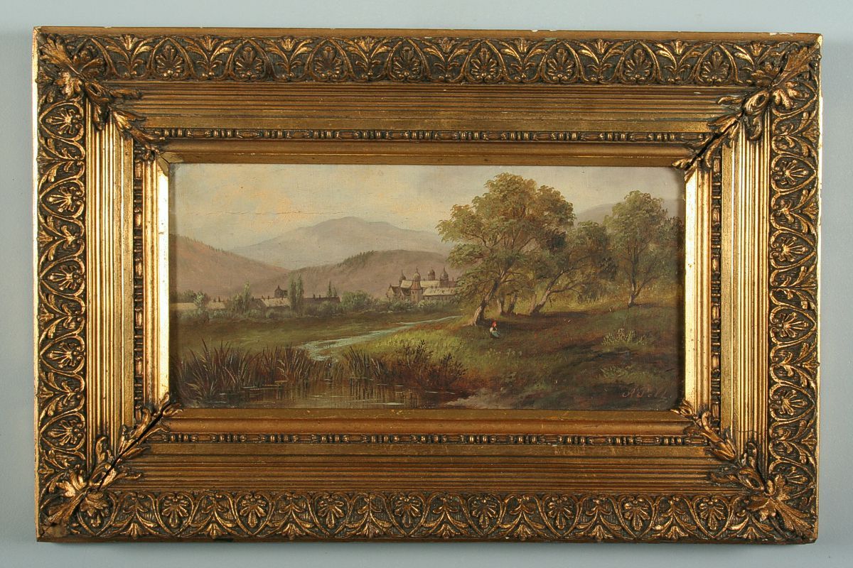 obraz romantické krajiny s figurální stafáží a městem v pozadí z konce 19. století, olej na plátně napnutém na dřevěném vyklínkovaném rámu, 16 x 31 cm s rámem 30 x 46 cm, autor J. Poltz, podepsáno vpravo dole J. Poltz, rámováno v původním zlaceném a zdobeném rámu