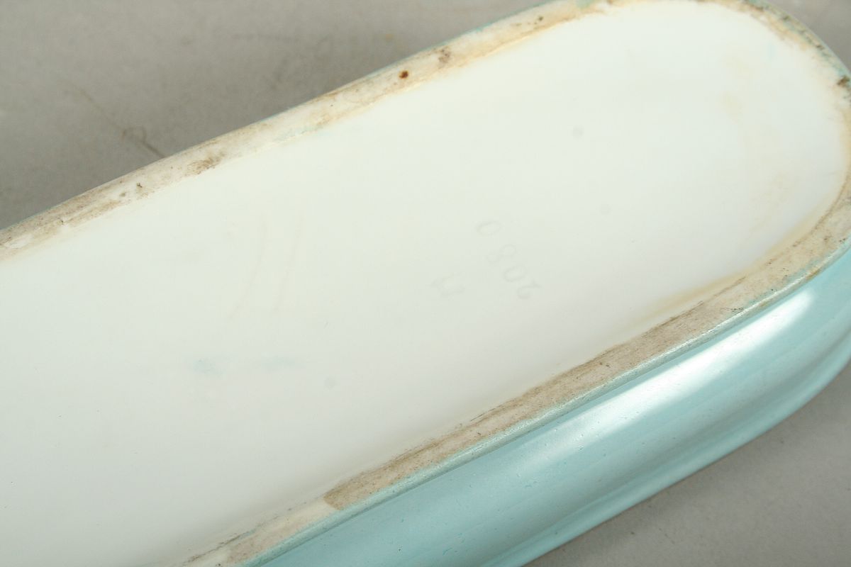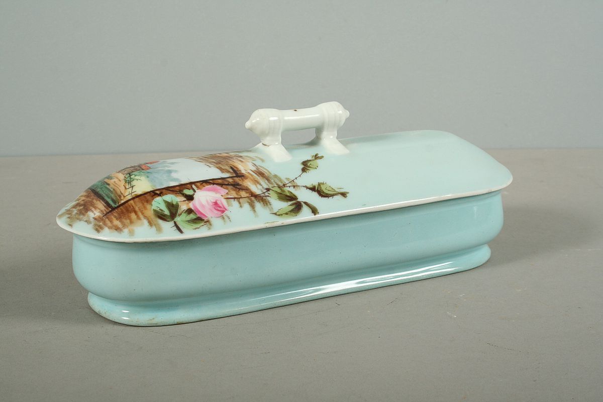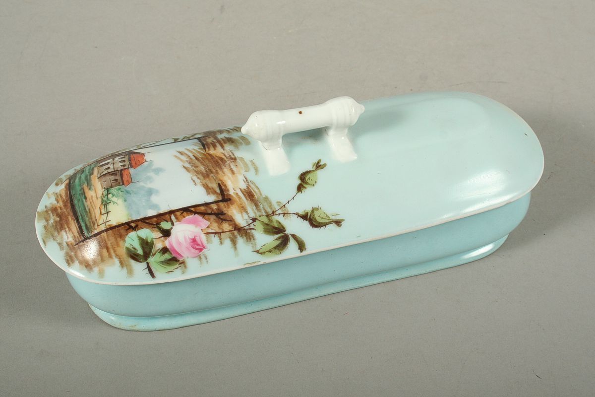 dóza na mýdlo s malovaným víkem, býlý porcelán značený na dně tlačenou značkou Loket, 19. století, 8 x 24 cm