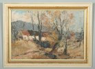 obraz krajiny s chalupami, olej na kartonu 29 x 42 cm s rámem 38 x 52 cm, autor Jan Plíva, podepsáno v málbě vpravo dole Plíva, rámováno v původním rámu pod sklem