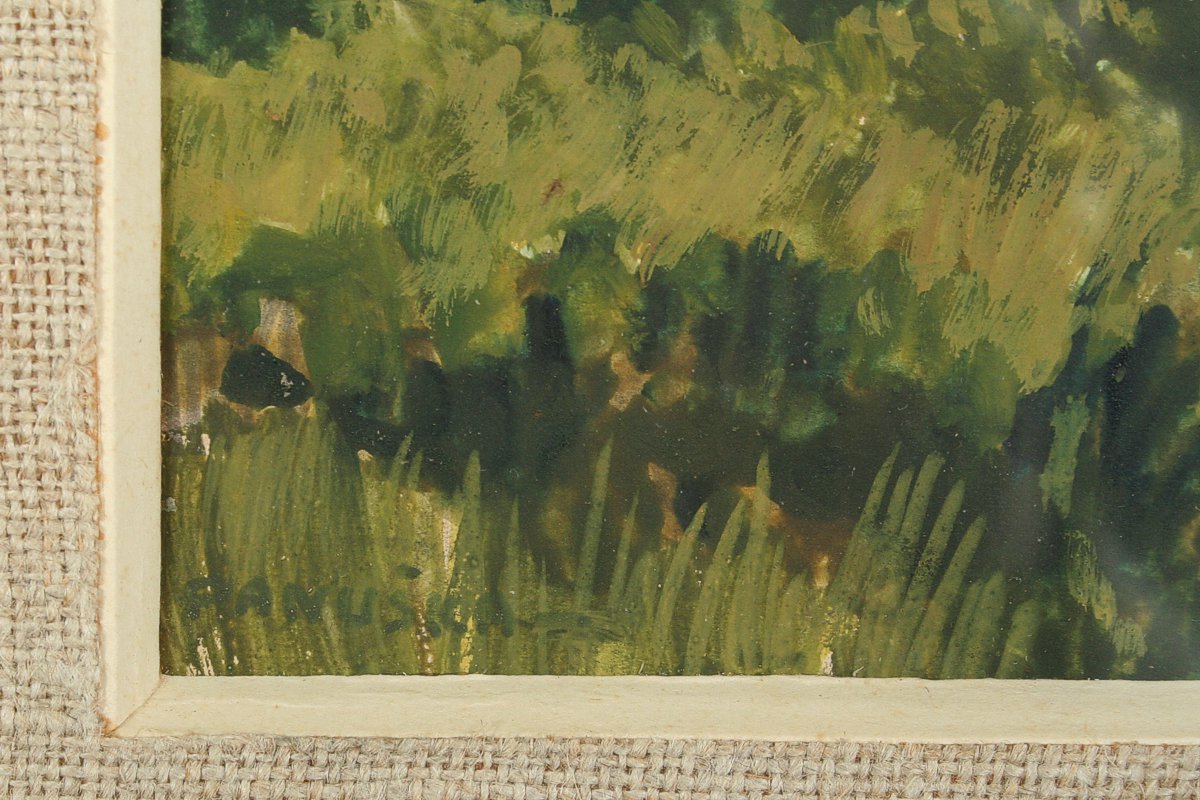 obraz letní krajiny, tempera a kvaš na kartonu, 12 x 15 cm s rámem 38 x 40 cm, autor Jaroslav Panuška st., podepsáno vlevo dole PANUŠKA, dílo posouzeno Dr. Zachařem, rámováno v rámu a paspartě pod sklem
