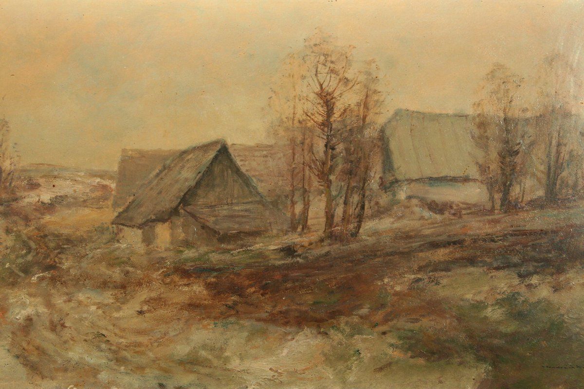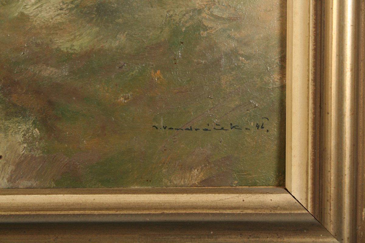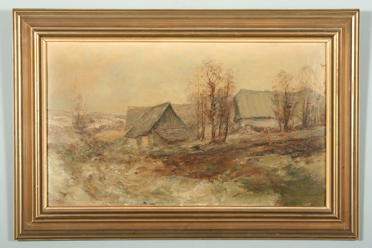 obraz zimní krajiny chalupami, olej na kartonu, 30 x 50 cm, s rámem 42 x 62 cm, autor Josef Vondráček, podepsáno vpravo dole J. Vondráček 46, rámováno v původním rámu