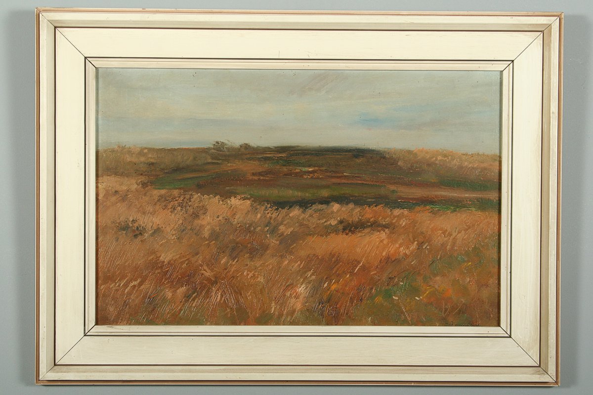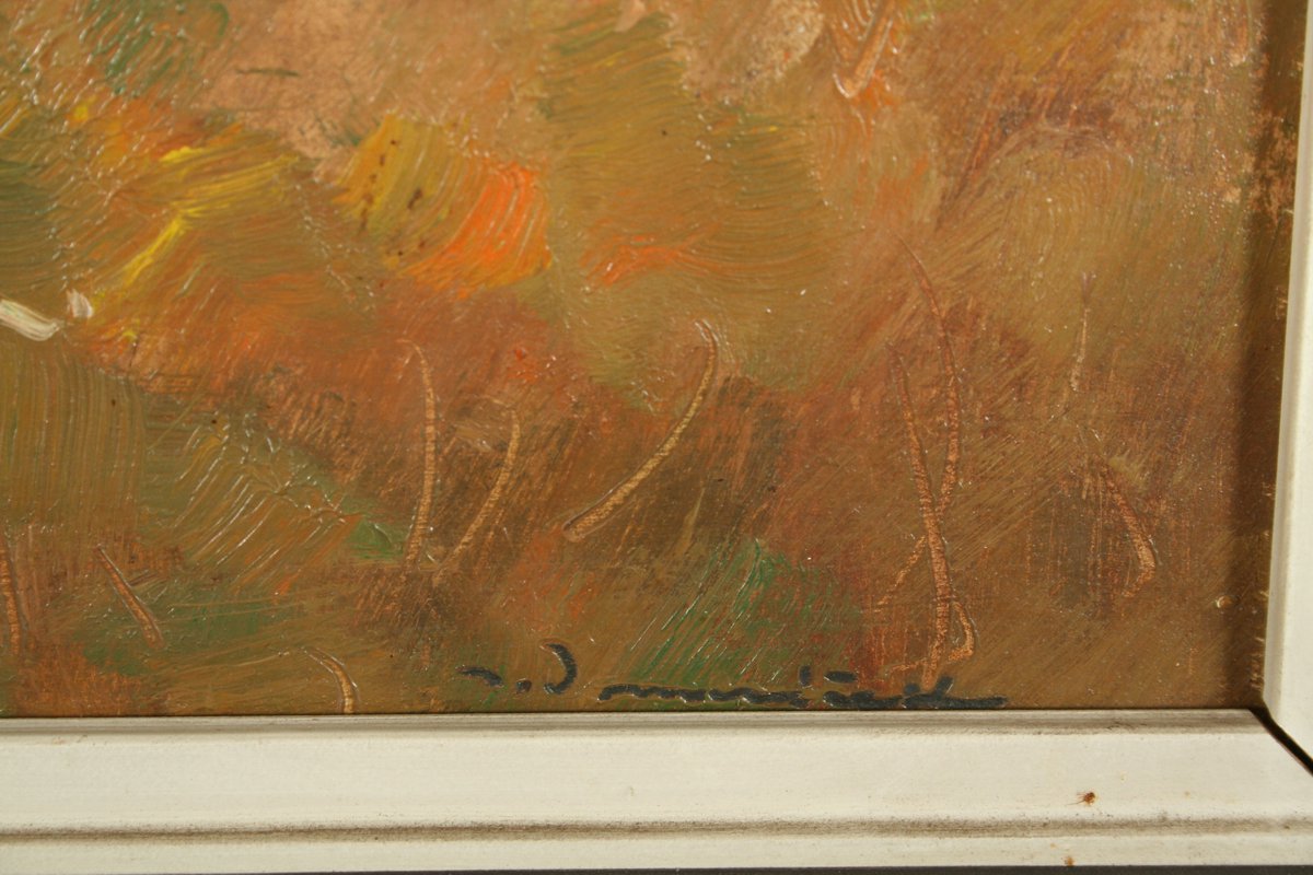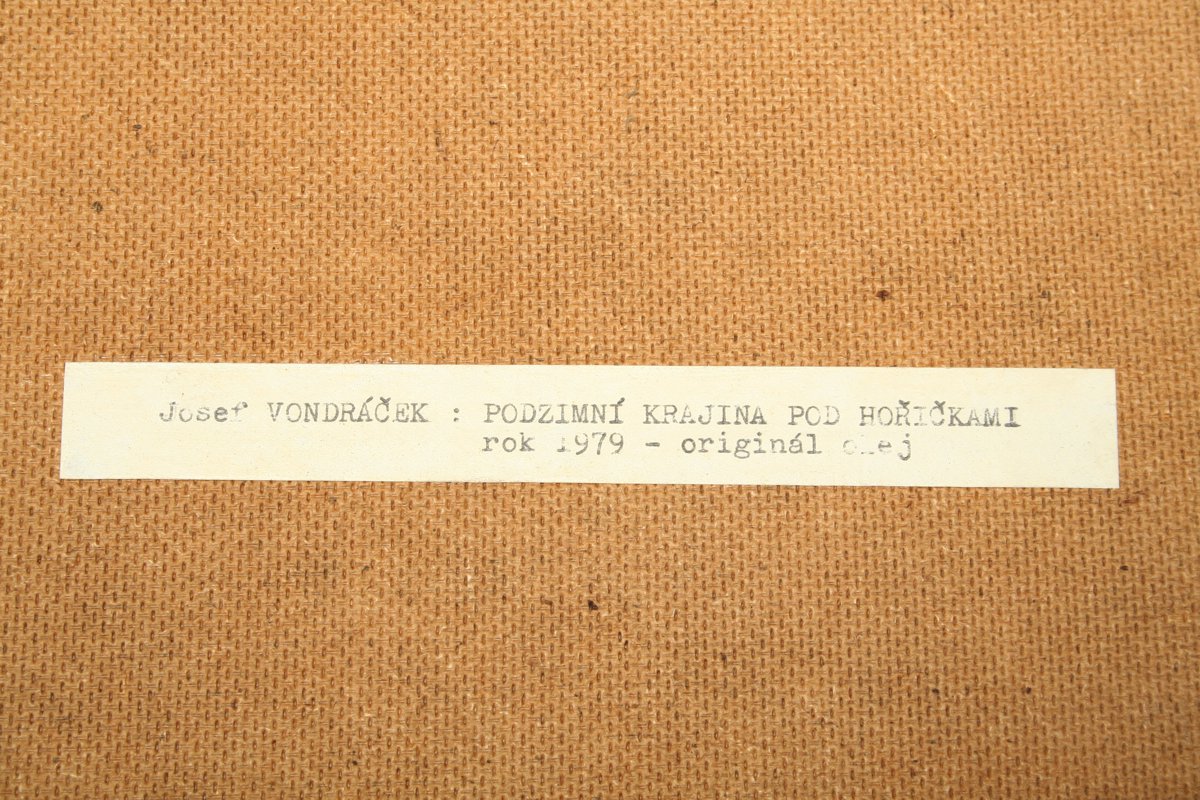 obraz podzimní krajiny pod Hořičkami, olej na desce, 32 x 50 cm, s rámem 45 x 63 cm, autor Josef Vondráček, podepsáno vpravo dole J. Vondráček a vzadu přípis s dedikací a vročením 1979, rámováno v původním rámu