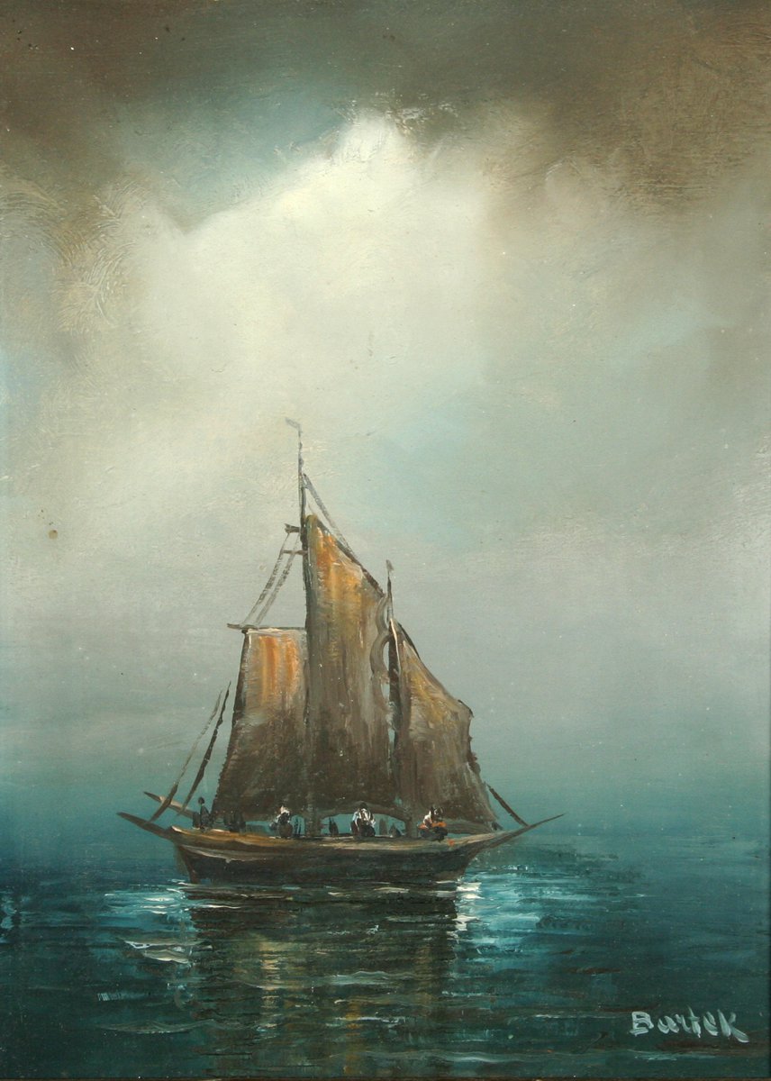 obraz marína u Splitu, olej na dřevěné desce, 22 x 16 cm, s rámem 35 x 29 cm, autor J. Bartek, podepsáno vpravo dole Bartek a vzadu přípis J. Bartek - Split, rámováno v původním částečně poškozeném rámu