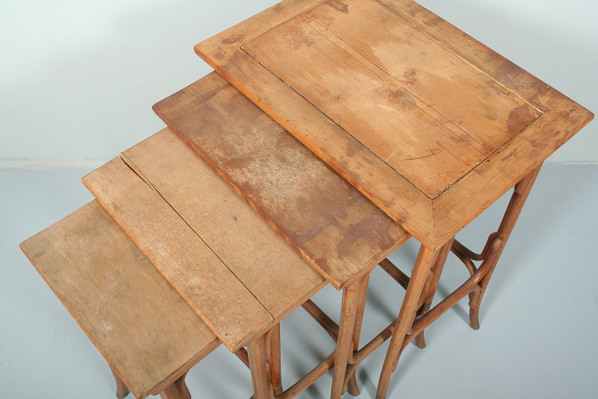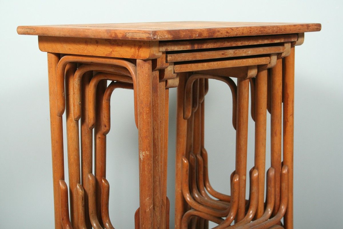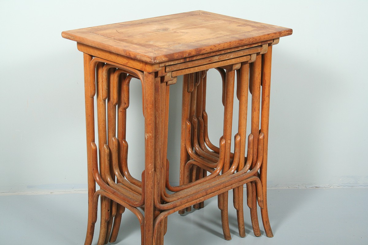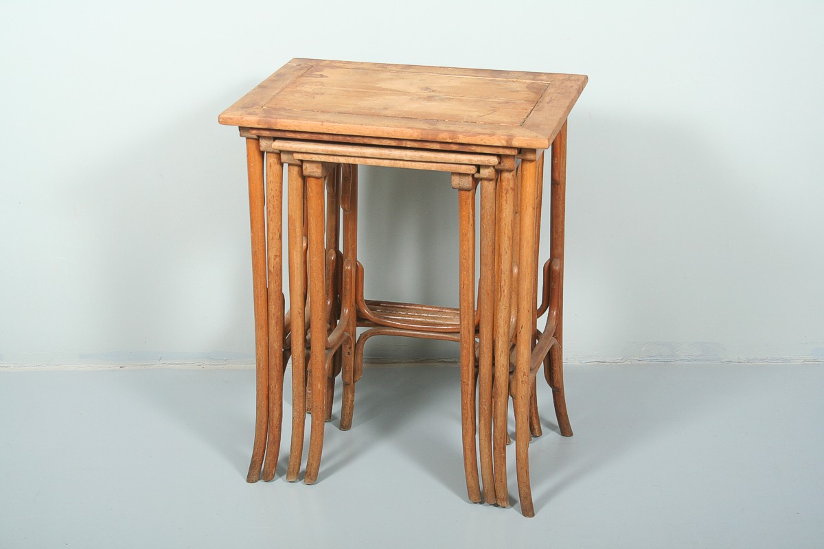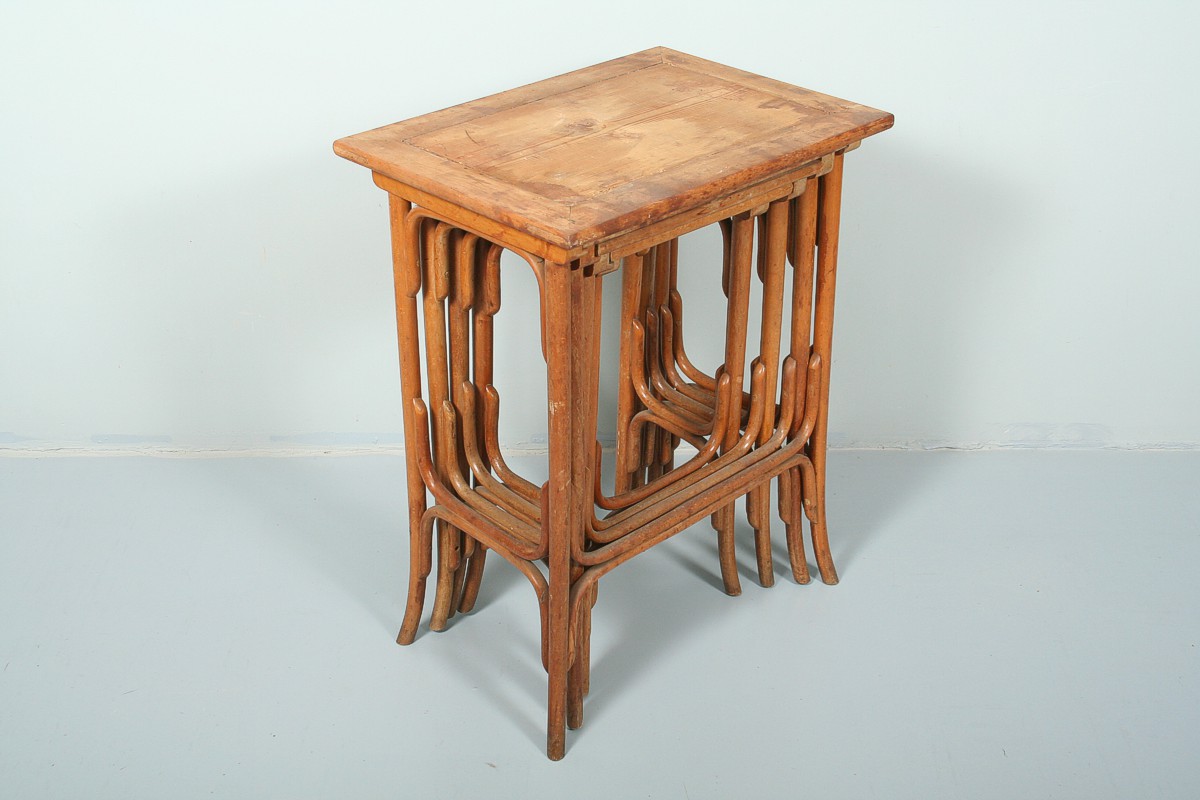 kompletní hnízdové stolky z ohýbaného dřeva 4 kusy, patrně produkce Thonet, vše v původním stavu, vhodné k restaurování, místy v desce stopy po škůdci, 70 x 55 x 39,5 cm